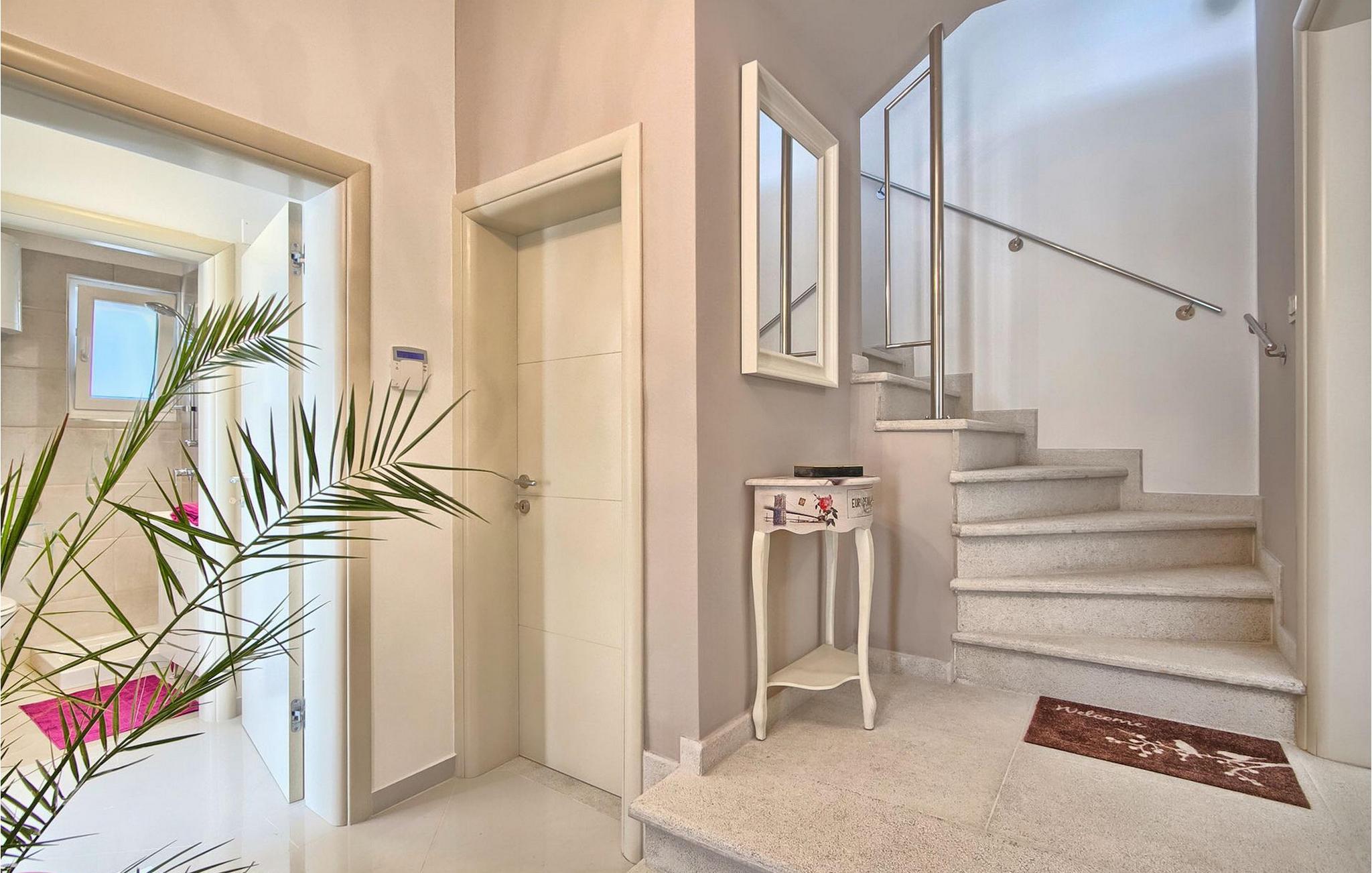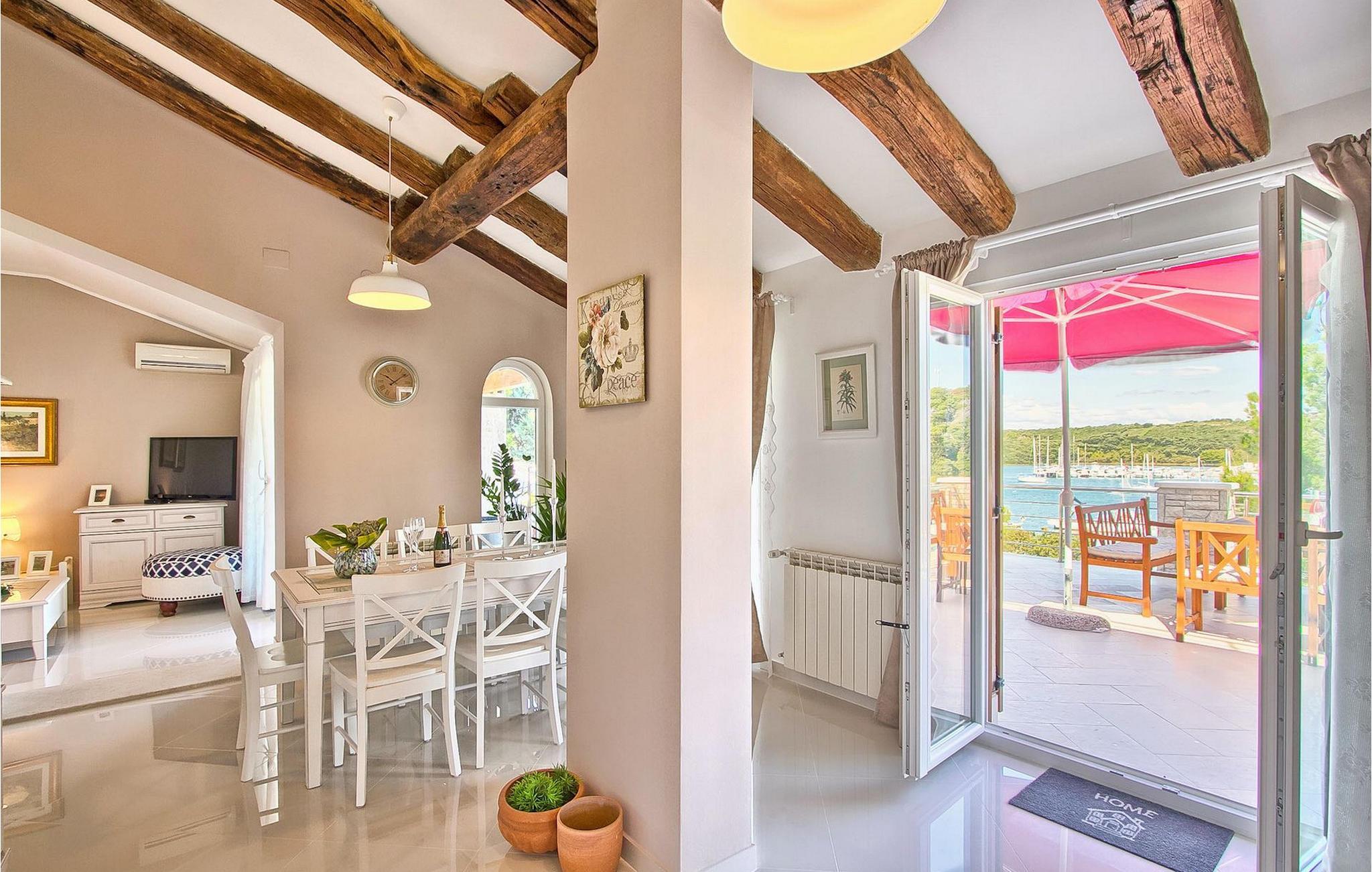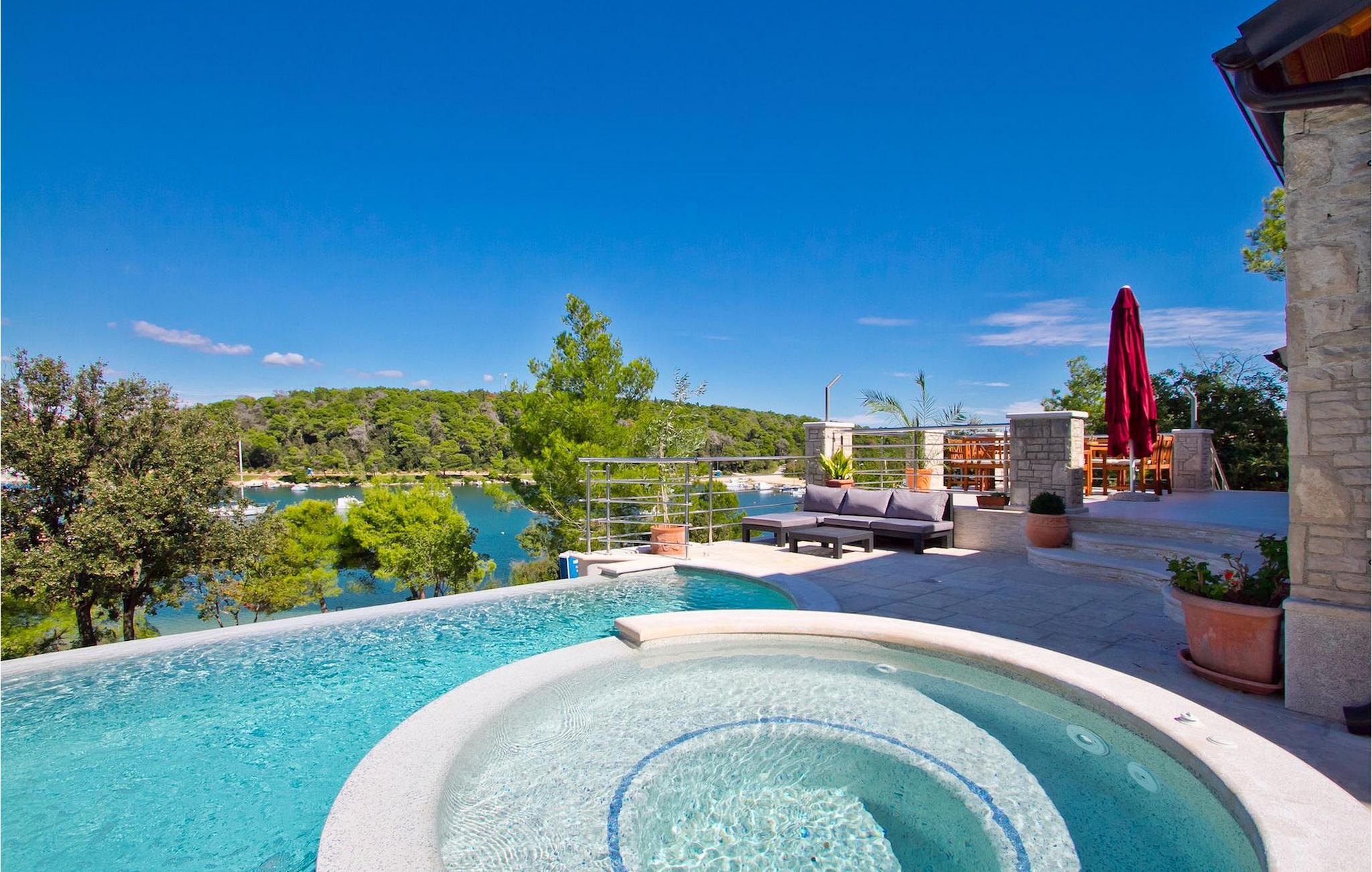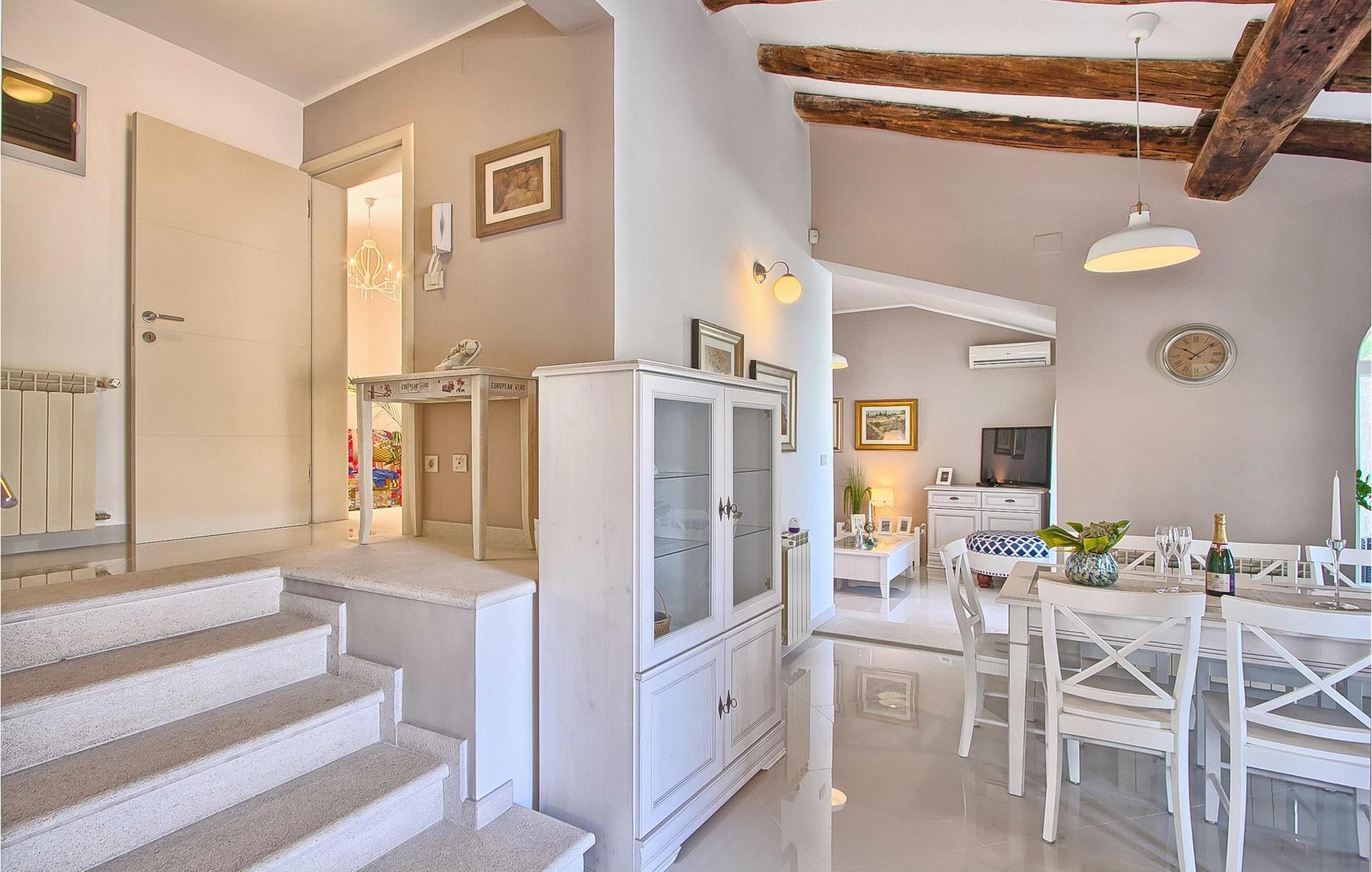 Die fünf geschmackvoll eingerichteten Schlafzimmer verteilt auf zwei Etagen bieten Platz für bis zu 8+1 Gäste. Der Innenbereich ist hell und luftig gestaltet, durch die Holzbalken trotzdem gemütlich. Das schicke Wohnzimmer, der Essbereich und die komplett ausgestattete Küche sind miteinander verbunden. Im Erdgeschoss befinden sich zwei Schlafzimmer mit Doppelbett, eines davon mit eigenem Bad mit Dusche, ein Badezimmer und eine Toilette. Im Obergeschoss finden Sie zwei Schlafzimmer mit Doppelbett und jeweils eigenem Bad mit Dusche sowie ein Einzelzimmer. Zudem verfügt ein Doppelzimmer im Obergeschoss über eine private Terrasse mit wunderschönem Meerblick. Der Außenbereich ist gut gestaltet und geräumig. Einige verschiedene Ebenen und getrennte Terrassen lassen Möglichkeiten, sich zurückzuziehen und die Privatsphäre zu genießen oder gemeinsame Stunden mit den Liebsten zu verbringen. Den wundervollen Pool werden Sie an heißen Sommertagen nur sehr ungern verlassen, denn hier lässt es sich mit dem fantastischen Blick auf die Bucht Soline mit Ihren Yachten und Fischerbooten und dazu einem kühlen Getränk in der Hand einfach prima entspannen! Falls Sie doch mal der Wunsch nach Strand überkommt, so ist dieser nur 30m entfernt. Wenn Sie Gruppenaktivitäten lieben, stehen Ihnen ein Tisch für Tischtennis und Kicker zur Verfügung.