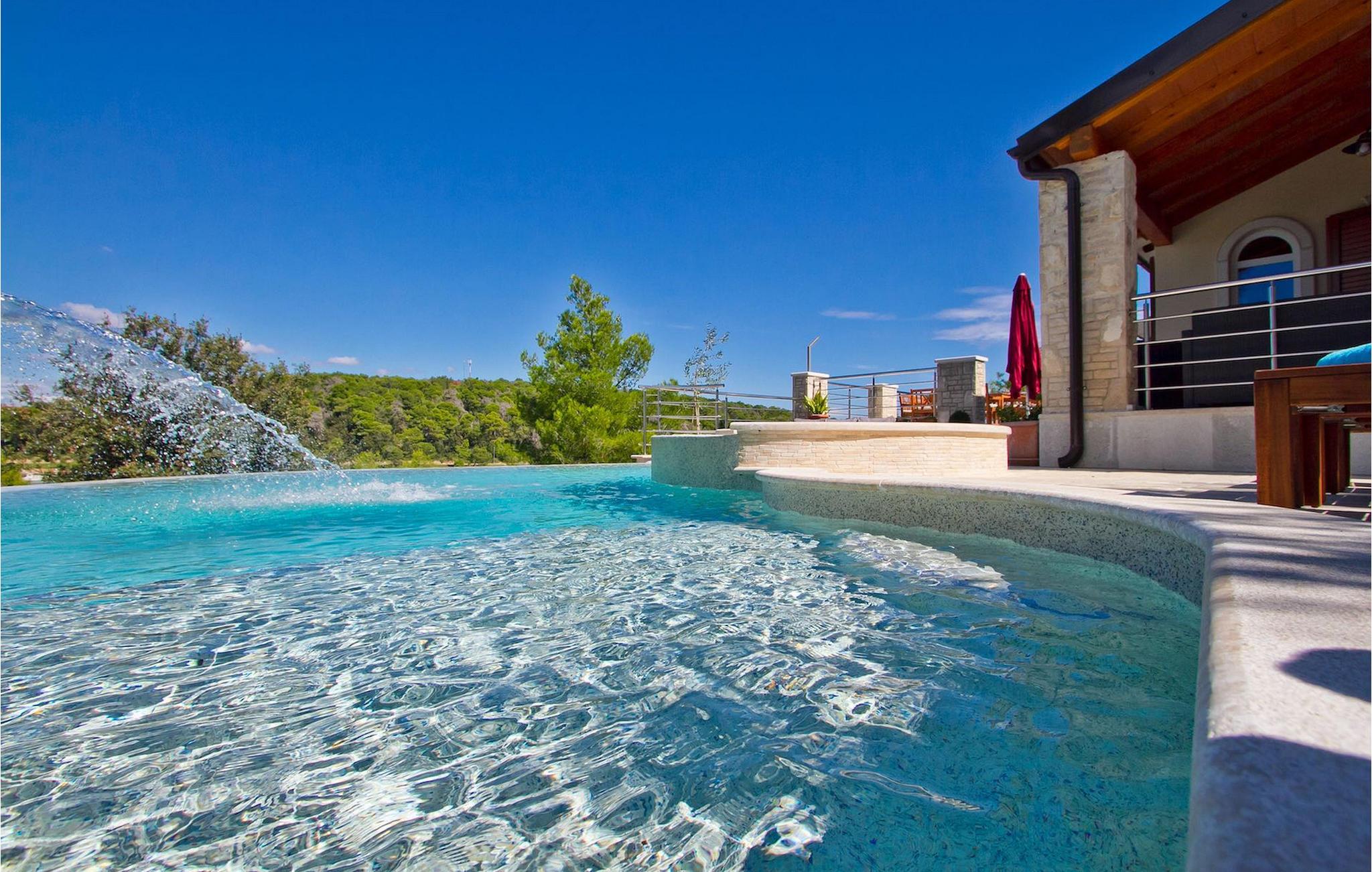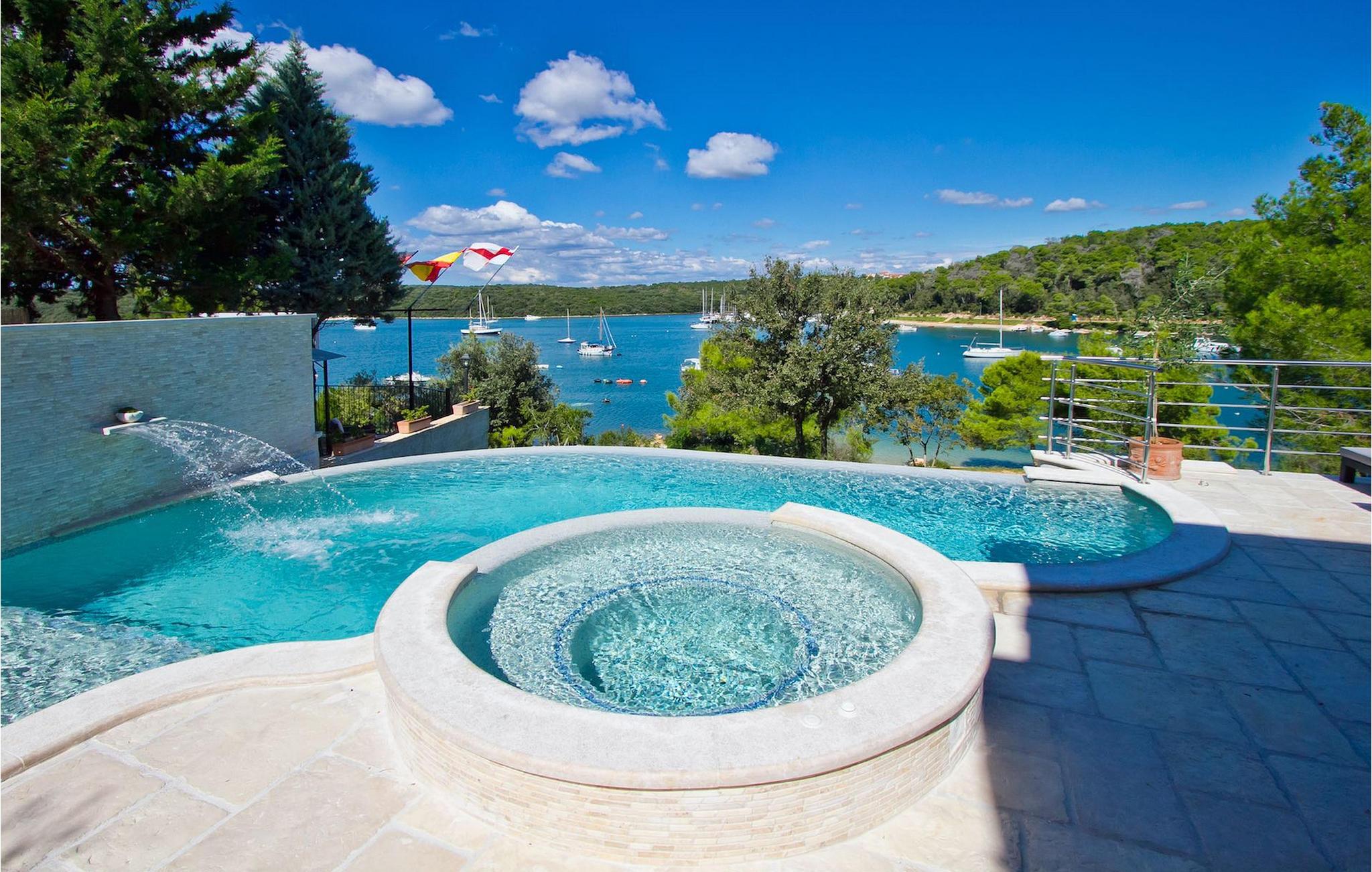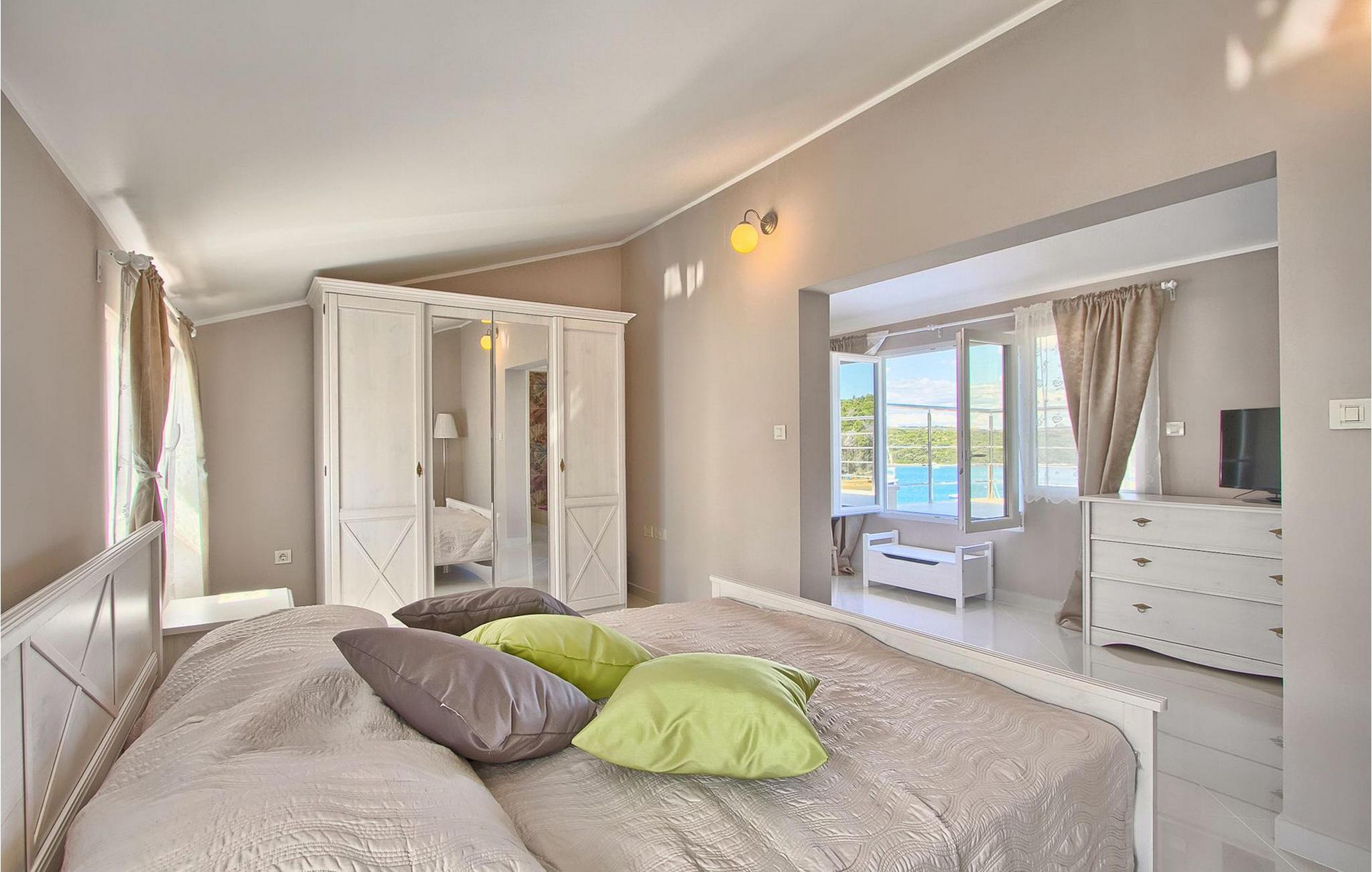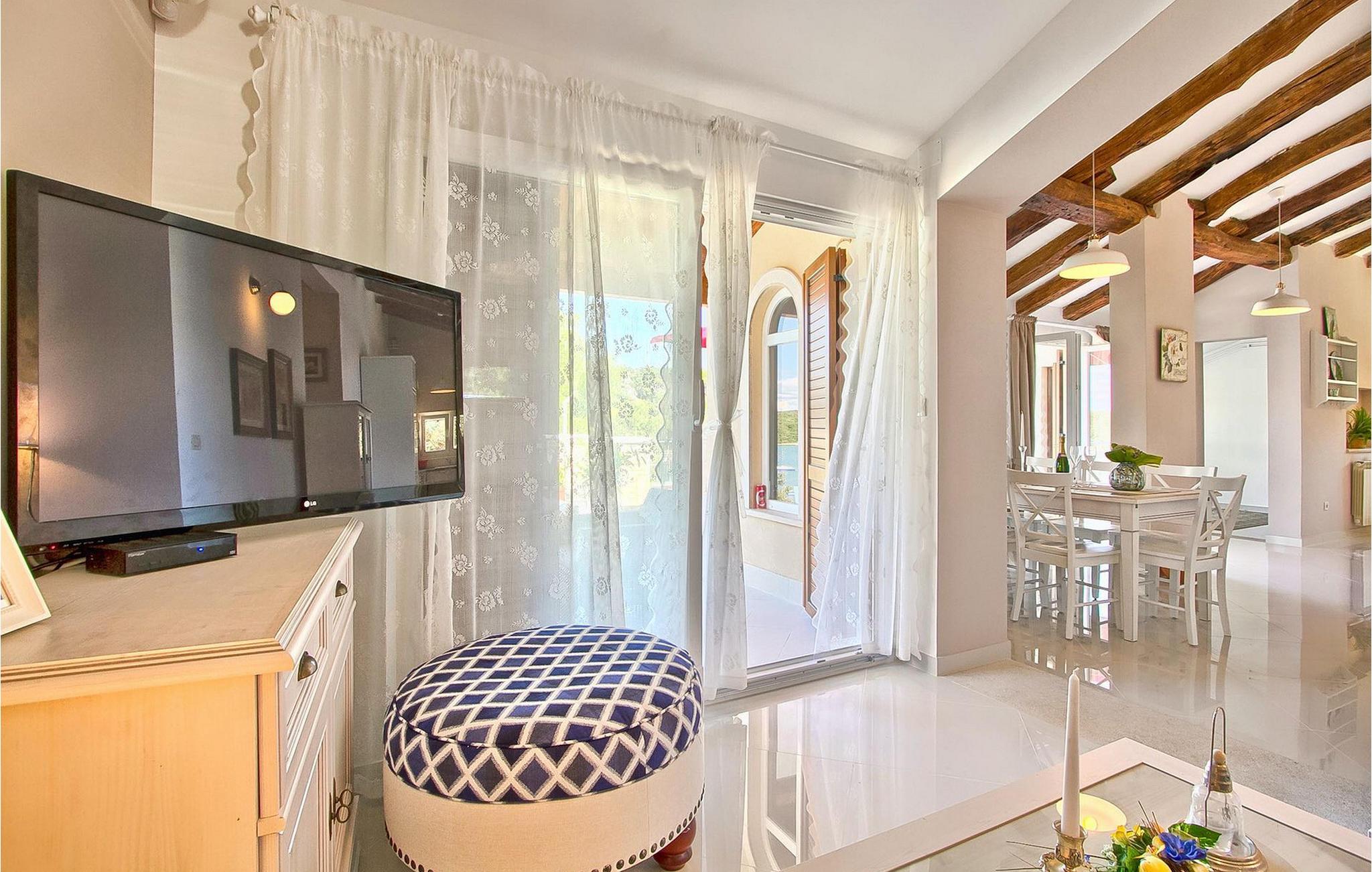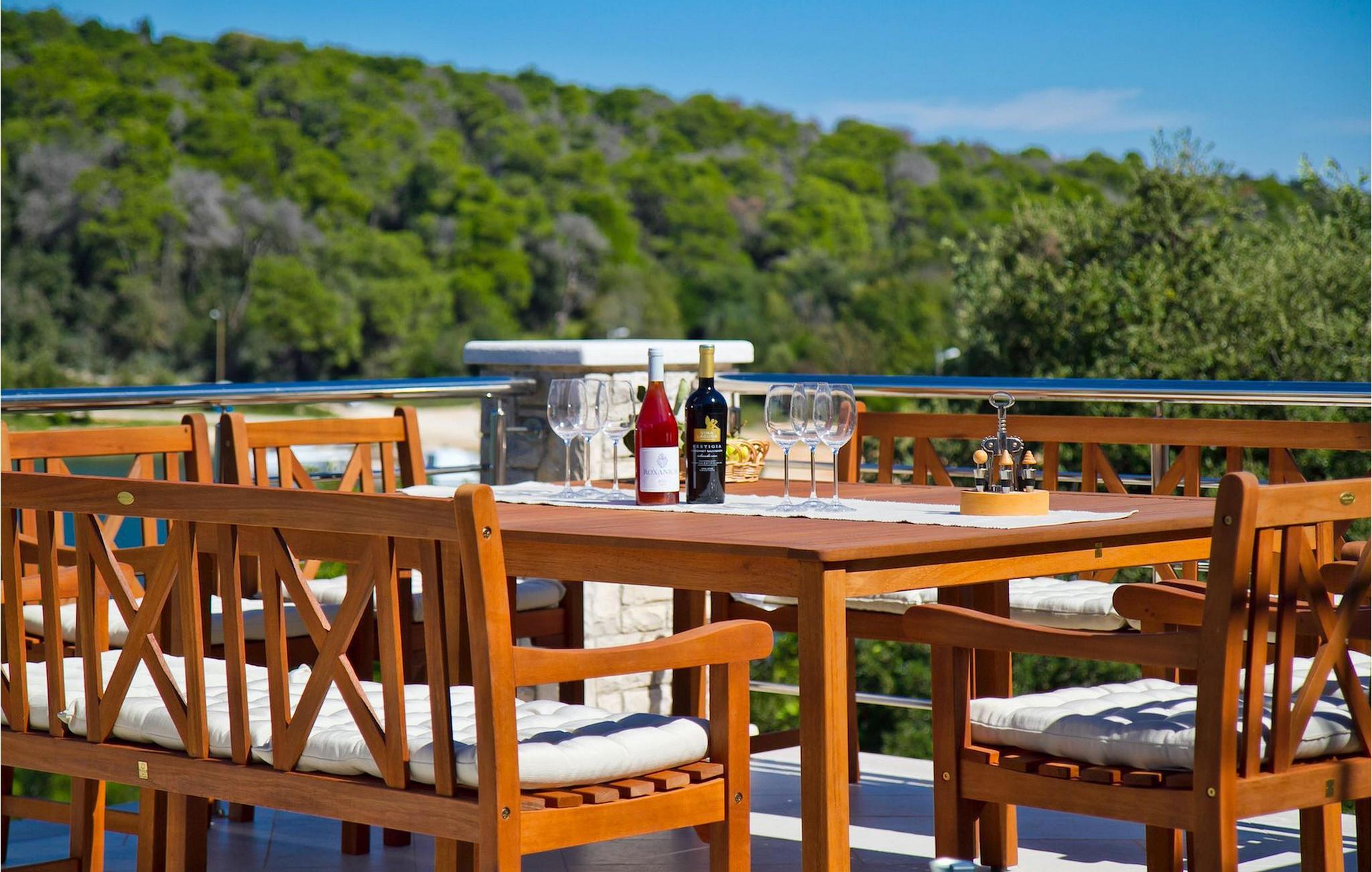 Die fünf geschmackvoll eingerichteten Schlafzimmer verteilt auf zwei Etagen bieten Platz für bis zu 8+1 Gäste. Der Innenbereich ist hell und luftig gestaltet, durch die Holzbalken trotzdem gemütlich. Das schicke Wohnzimmer, der Essbereich und die komplett ausgestattete Küche sind miteinander verbunden. Im Erdgeschoss befinden sich zwei Schlafzimmer mit Doppelbett, eines davon mit eigenem Bad mit Dusche, ein Badezimmer und eine Toilette. Im Obergeschoss finden Sie zwei Schlafzimmer mit Doppelbett und jeweils eigenem Bad mit Dusche sowie ein Einzelzimmer. Zudem verfügt ein Doppelzimmer im Obergeschoss über eine private Terrasse mit wunderschönem Meerblick. Der Außenbereich ist gut gestaltet und geräumig. Einige verschiedene Ebenen und getrennte Terrassen lassen Möglichkeiten, sich zurückzuziehen und die Privatsphäre zu genießen oder gemeinsame Stunden mit den Liebsten zu verbringen. Den wundervollen Pool werden Sie an heißen Sommertagen nur sehr ungern verlassen, denn hier lässt es sich mit dem fantastischen Blick auf die Bucht Soline mit Ihren Yachten und Fischerbooten und dazu einem kühlen Getränk in der Hand einfach prima entspannen! Falls Sie doch mal der Wunsch nach Strand überkommt, so ist dieser nur 30m entfernt. Wenn Sie Gruppenaktivitäten lieben, stehen Ihnen ein Tisch für Tischtennis und Kicker zur Verfügung.