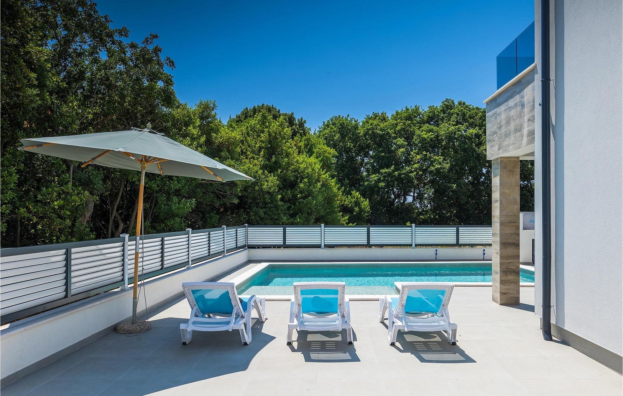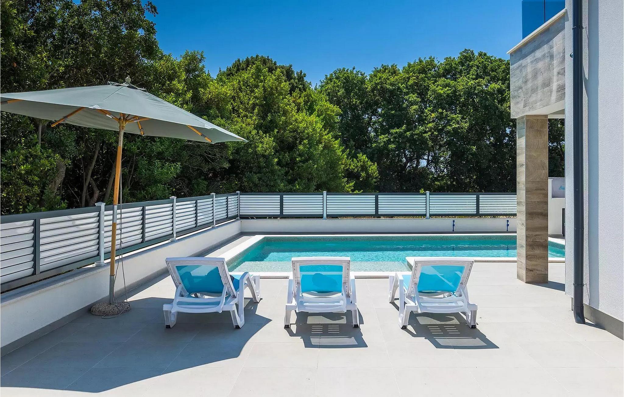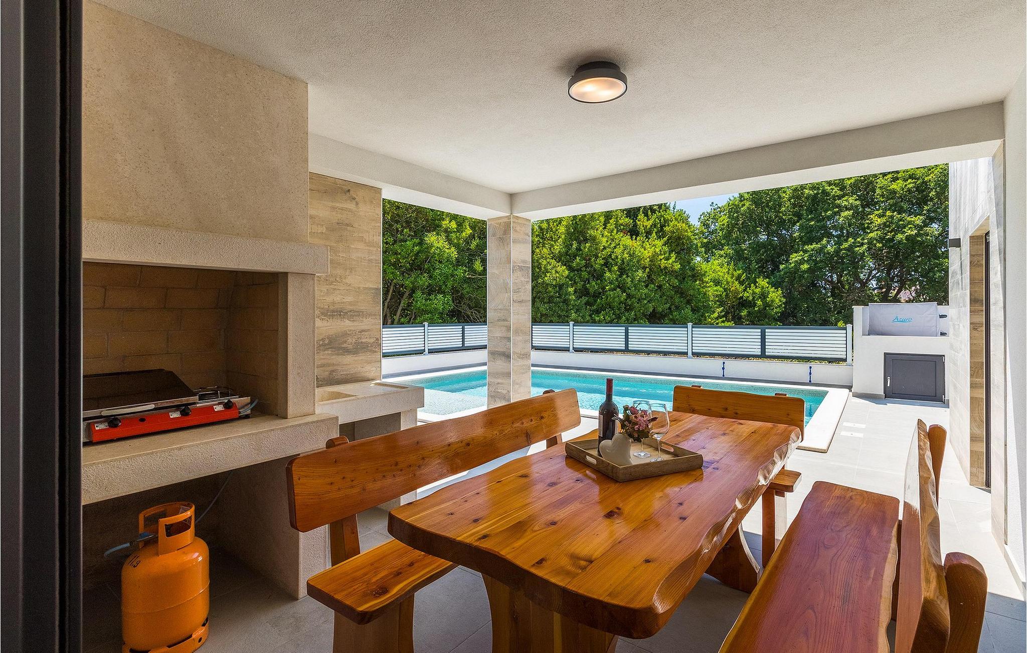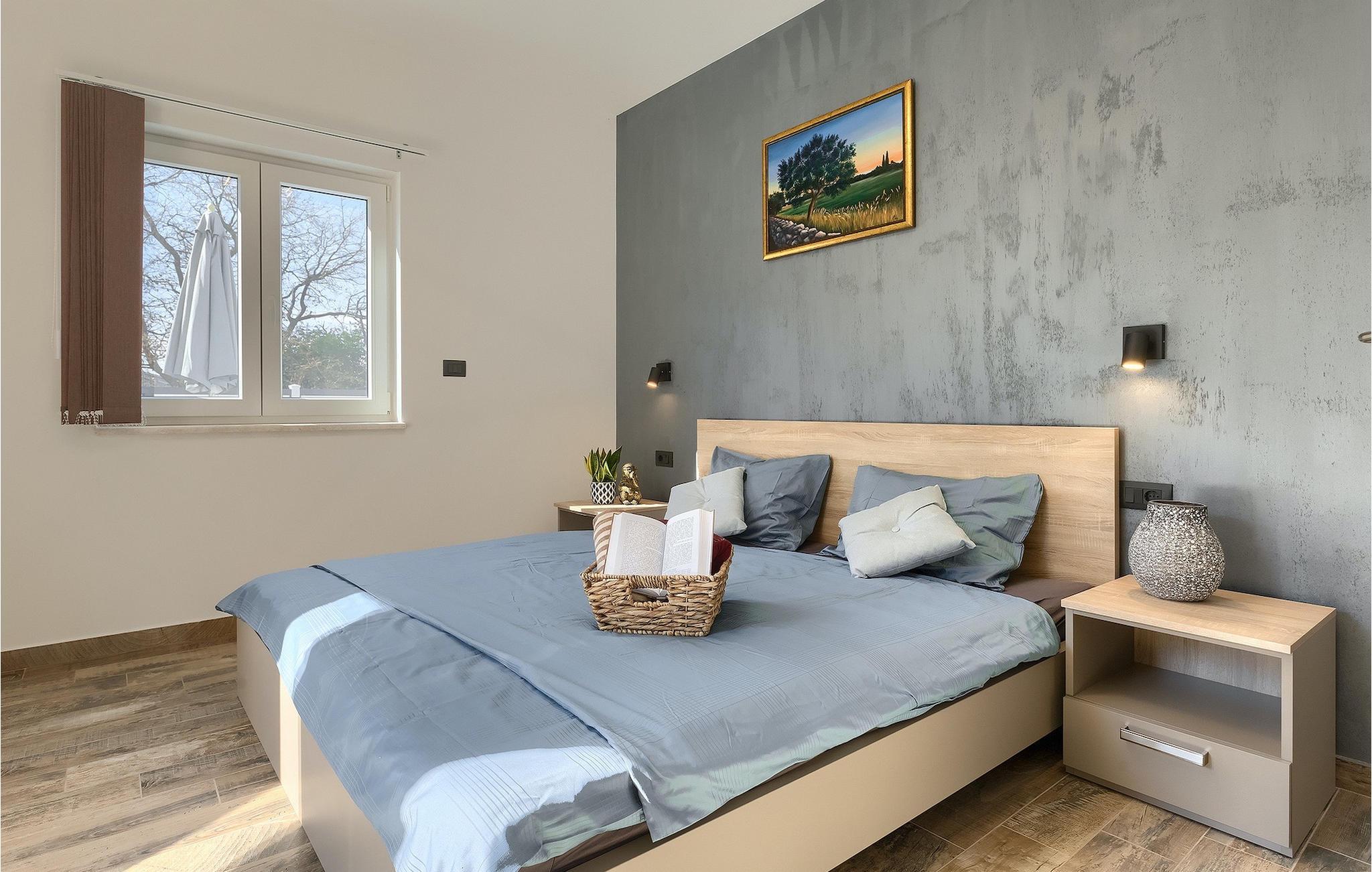 Die Villa Pervan ist in zwei Etagen unterteilt. Das Erdgeschoss verfügt über ein offenes Wohnzimmer, ein Esszimmer, eine ausgestattete Küche und ein Schlafzimmer mit eigenem Bad. Die voll ausgestattete Küche bietet Platz für Vorbereitung köstlicher Spezialitäten. Genießen Sie den Blick auf den privaten Pool vom komfortablen Wohnzimmer aus. Rund um den Pool stehen Liegestühle und Sonnenschirme zur Verfügung. Vom Wohnzimmer aus haben Sie Zugang zur Terrasse mit einem Esstisch und einem Gasgrill für unvergessliche Abende mit Ihrer Familie und Freunden. Im ersten Stock der Villa befinden sich zwei komfortable Schlafzimmer mit eigenem Bad.
