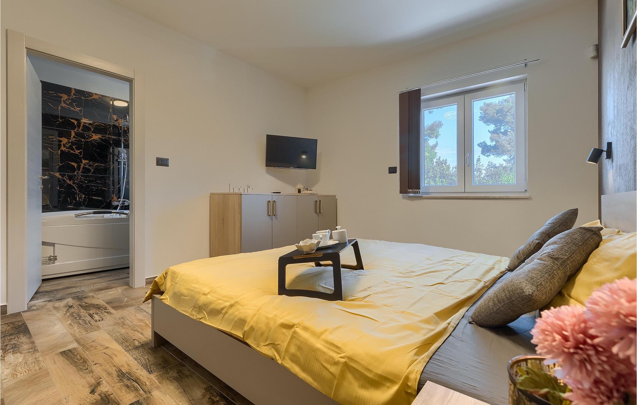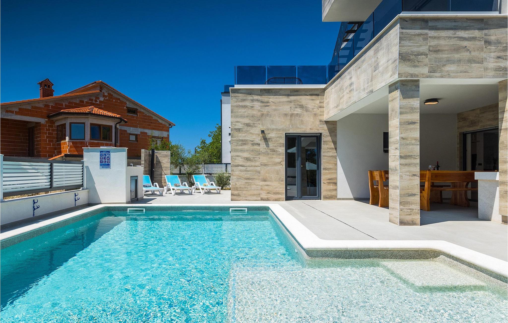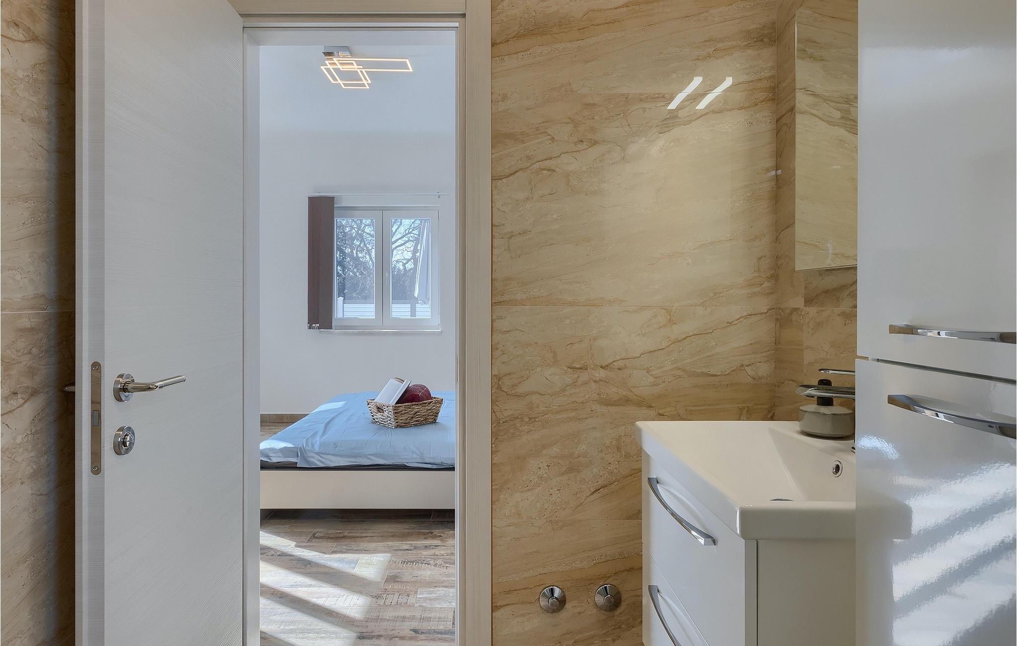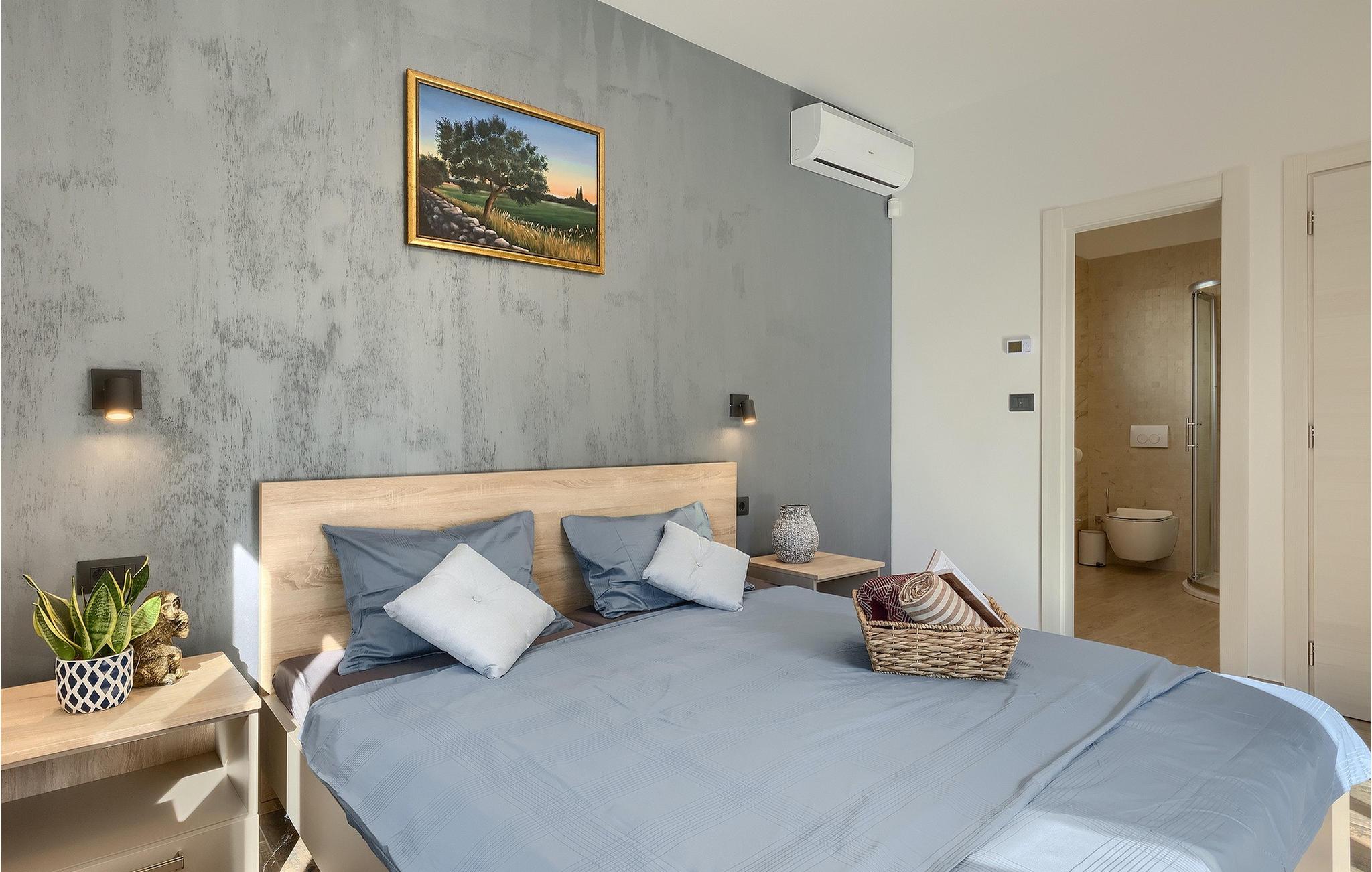 Die Villa Pervan ist in zwei Etagen unterteilt. Das Erdgeschoss verfügt über ein offenes Wohnzimmer, ein Esszimmer, eine ausgestattete Küche und ein Schlafzimmer mit eigenem Bad. Die voll ausgestattete Küche bietet Platz für Vorbereitung köstlicher Spezialitäten. Genießen Sie den Blick auf den privaten Pool vom komfortablen Wohnzimmer aus. Rund um den Pool stehen Liegestühle und Sonnenschirme zur Verfügung. Vom Wohnzimmer aus haben Sie Zugang zur Terrasse mit einem Esstisch und einem Gasgrill für unvergessliche Abende mit Ihrer Familie und Freunden. Im ersten Stock der Villa befinden sich zwei komfortable Schlafzimmer mit eigenem Bad.