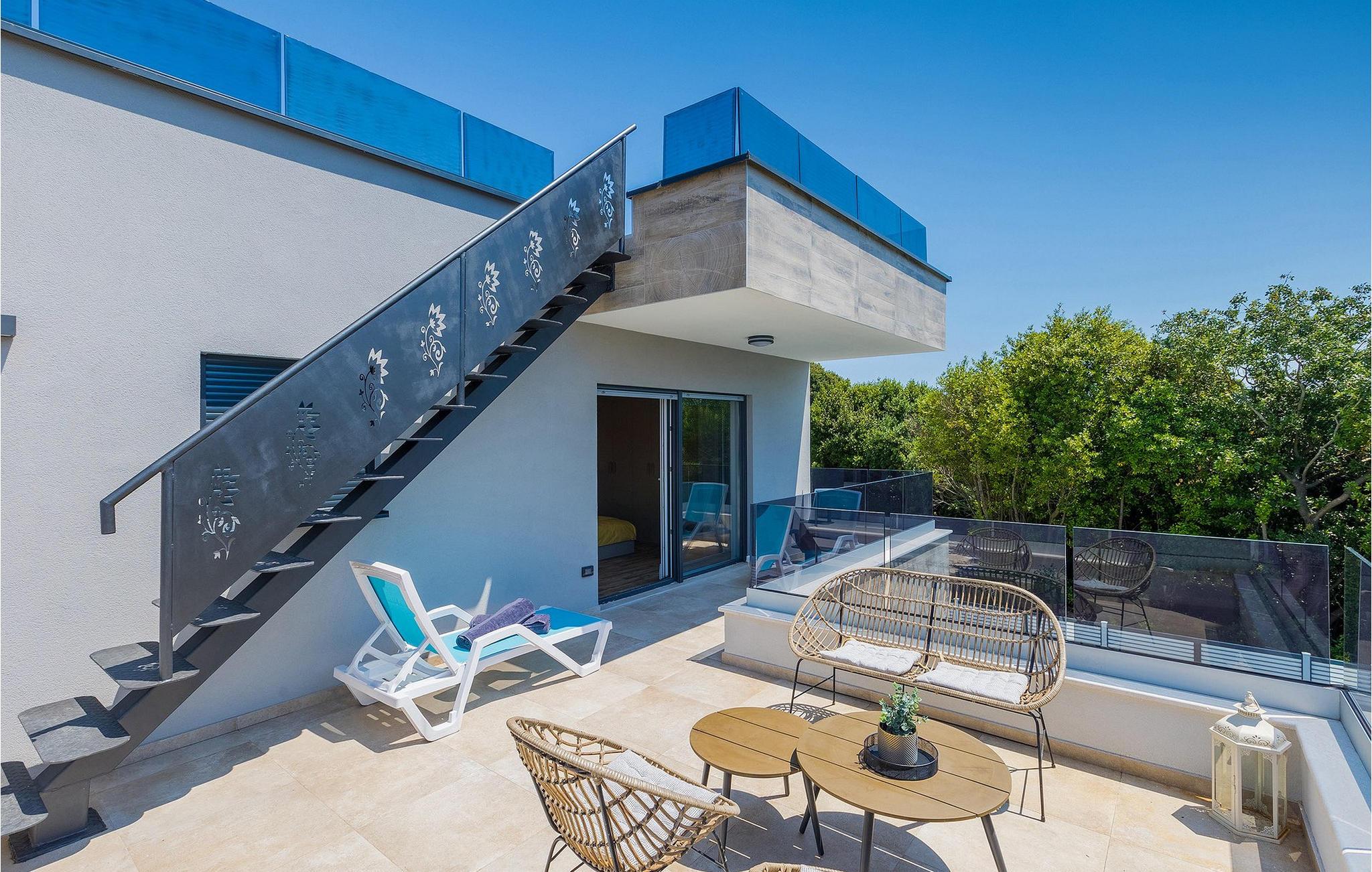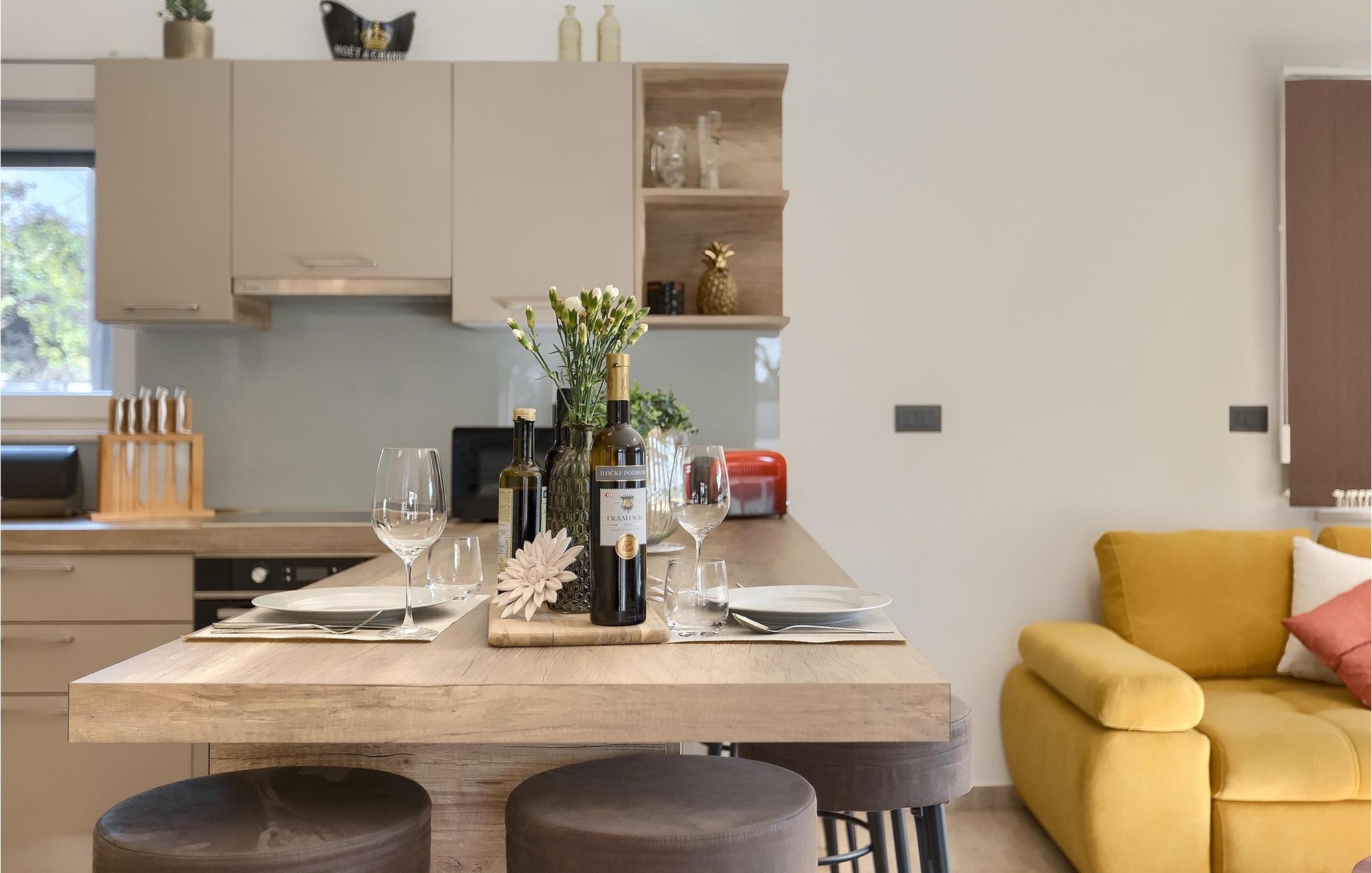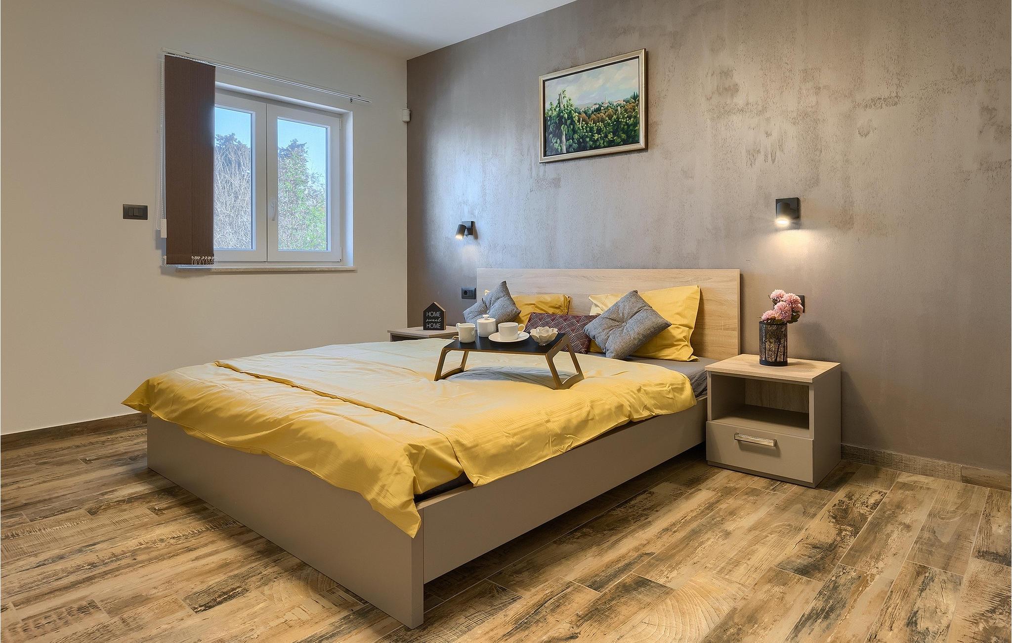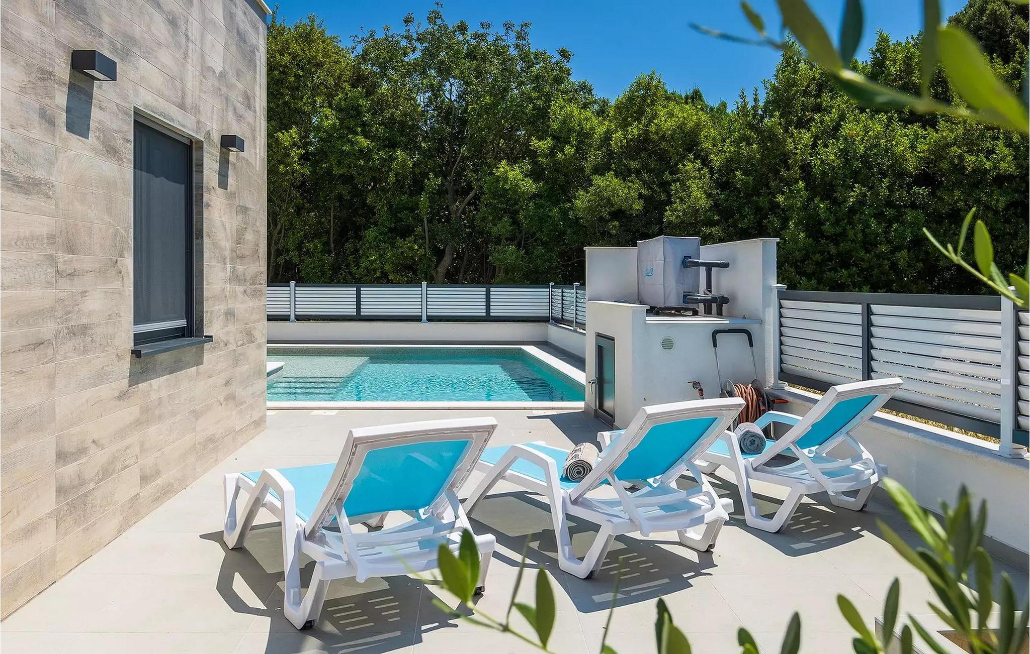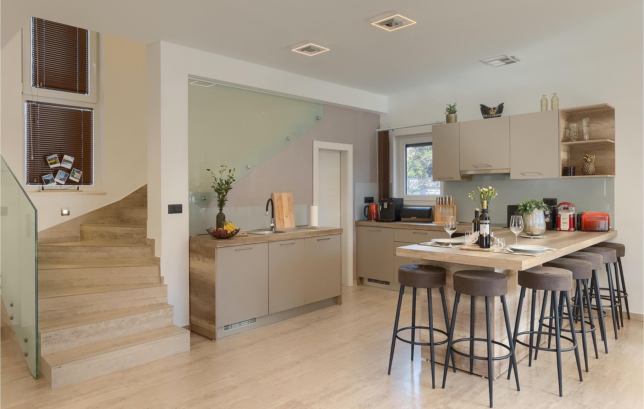 Die Villa Pervan ist in zwei Etagen unterteilt. Das Erdgeschoss verfügt über ein offenes Wohnzimmer, ein Esszimmer, eine ausgestattete Küche und ein Schlafzimmer mit eigenem Bad. Die voll ausgestattete Küche bietet Platz für Vorbereitung köstlicher Spezialitäten. Genießen Sie den Blick auf den privaten Pool vom komfortablen Wohnzimmer aus. Rund um den Pool stehen Liegestühle und Sonnenschirme zur Verfügung. Vom Wohnzimmer aus haben Sie Zugang zur Terrasse mit einem Esstisch und einem Gasgrill für unvergessliche Abende mit Ihrer Familie und Freunden. Im ersten Stock der Villa befinden sich zwei komfortable Schlafzimmer mit eigenem Bad.