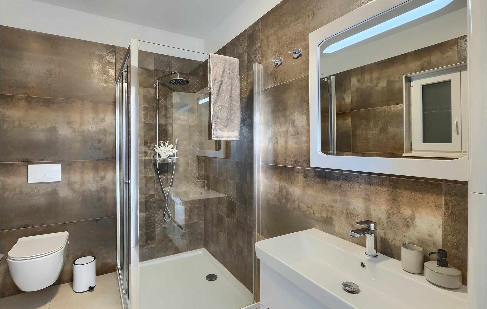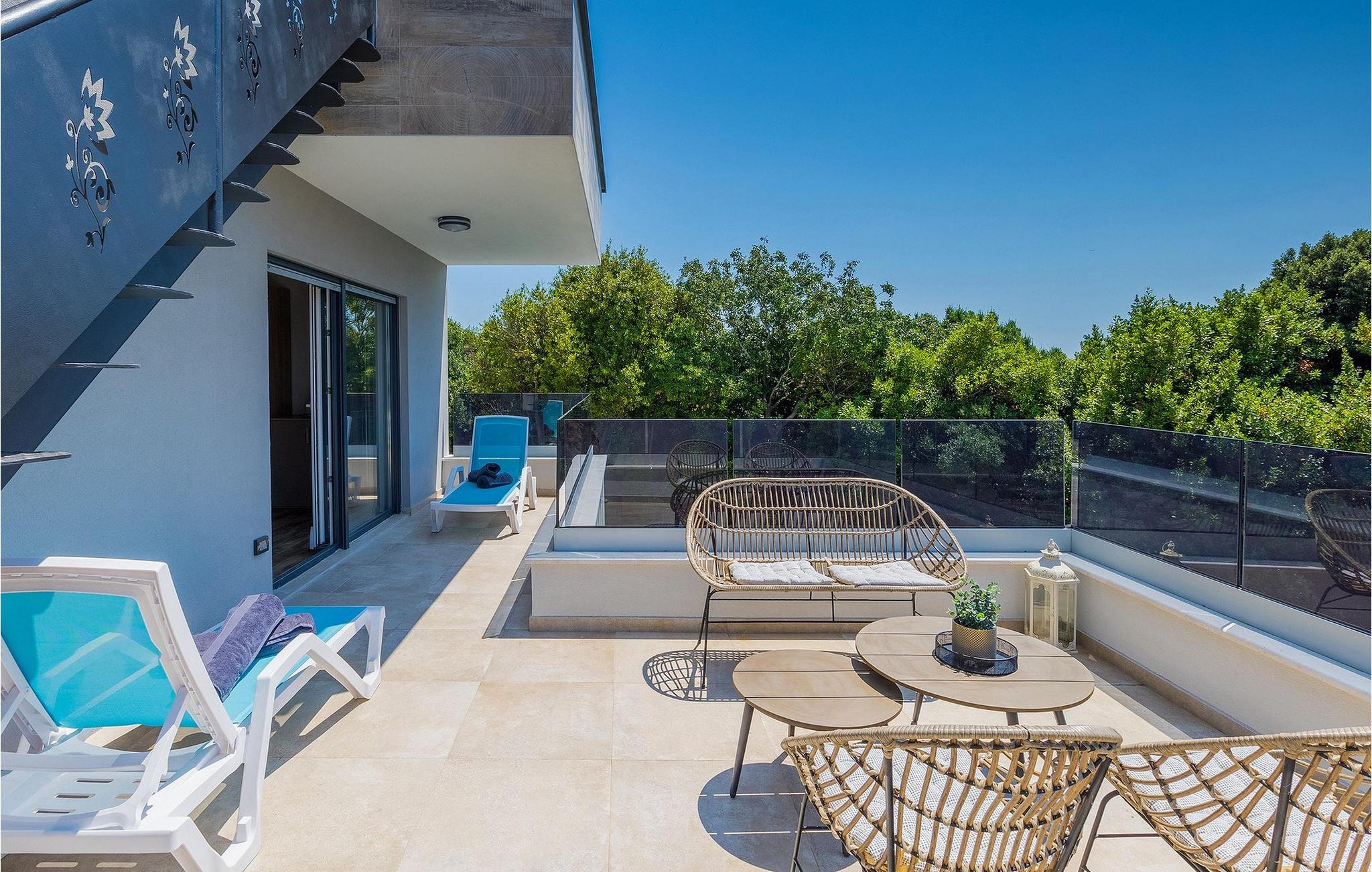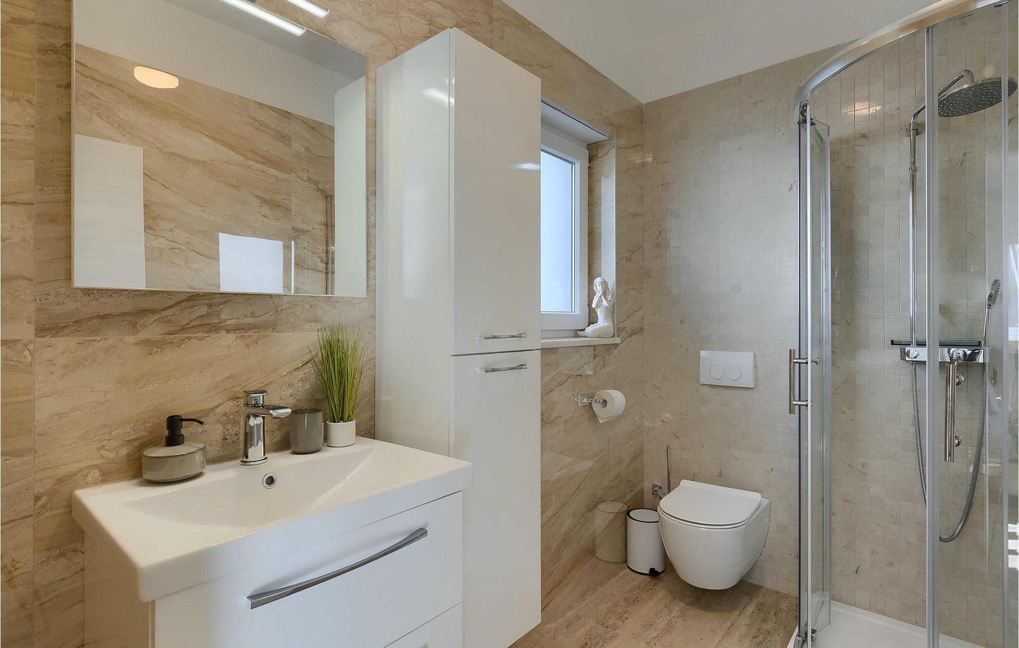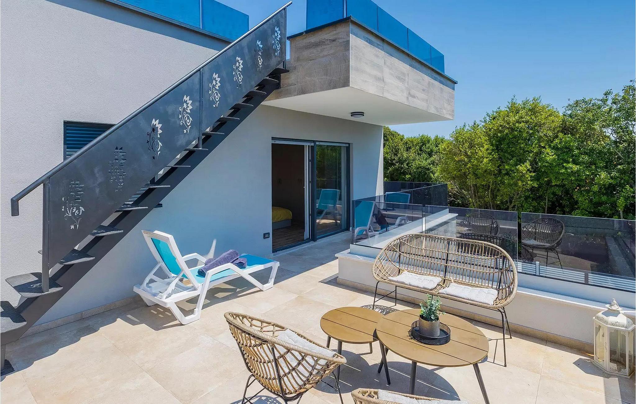 Die Villa Pervan ist in zwei Etagen unterteilt. Das Erdgeschoss verfügt über ein offenes Wohnzimmer, ein Esszimmer, eine ausgestattete Küche und ein Schlafzimmer mit eigenem Bad. Die voll ausgestattete Küche bietet Platz für Vorbereitung köstlicher Spezialitäten. Genießen Sie den Blick auf den privaten Pool vom komfortablen Wohnzimmer aus. Rund um den Pool stehen Liegestühle und Sonnenschirme zur Verfügung. Vom Wohnzimmer aus haben Sie Zugang zur Terrasse mit einem Esstisch und einem Gasgrill für unvergessliche Abende mit Ihrer Familie und Freunden. Im ersten Stock der Villa befinden sich zwei komfortable Schlafzimmer mit eigenem Bad.
