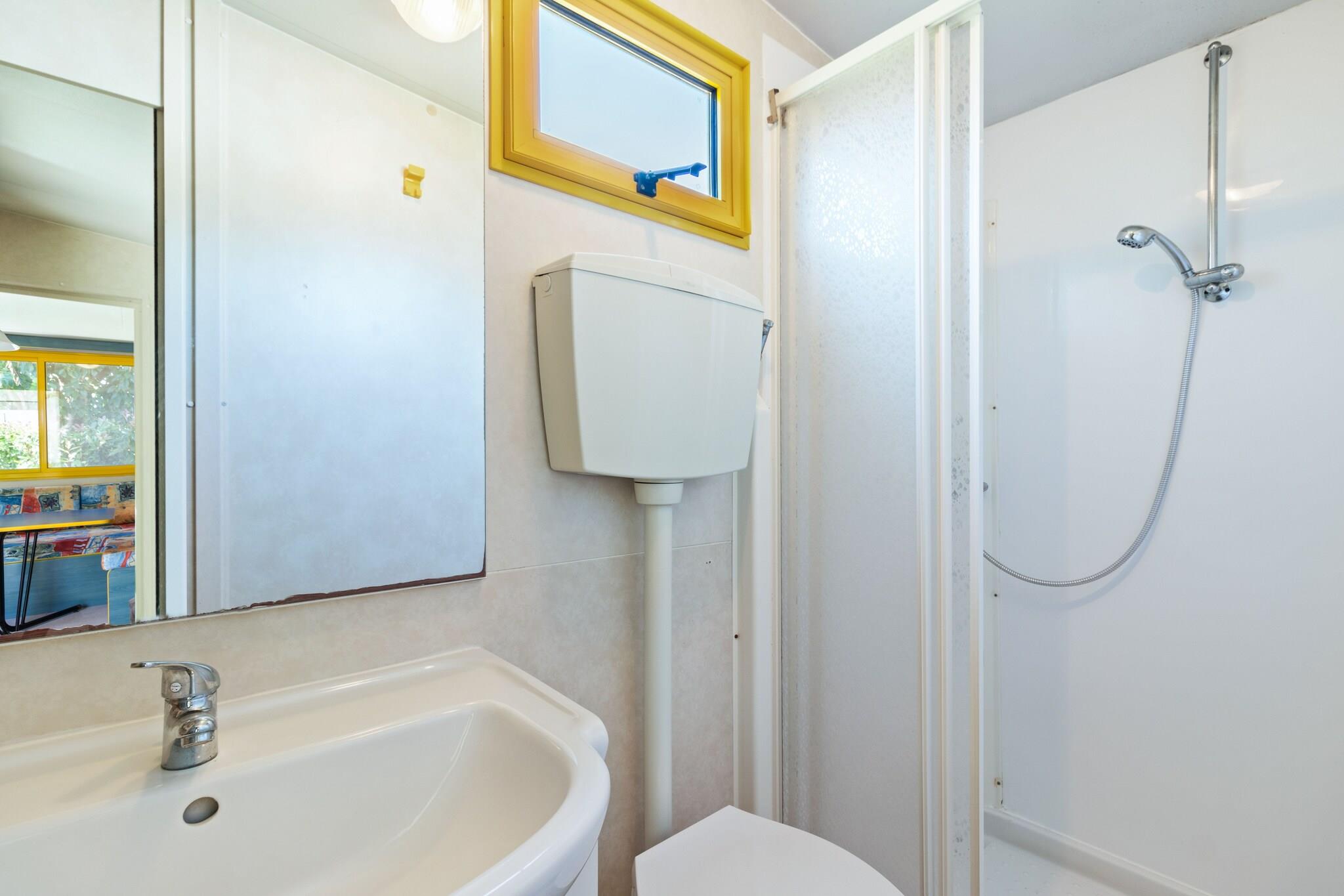 Ideal for families and pet owners, this mobile home for six guests offers a serene getaway just 1 km from the beach. Nestled in Banjole and only 2 km from the historic city of Pula, it combines comfort, convenience, and coastal charm. Guests enjoy free WiFi, a shared swimming pool, and a variety of outdoor activities for all ages. The interior features an open kitchen equipped with a kettle, boiling water tap, coffee machine, microwave, and fridge—everything needed for a smooth stay. The cozy living and bedroom area includes a fold-out double bed, TV, and air conditioning, while two additional bedrooms feature a king-size bed and either bunk beds or twin beds for a restful night's sleep. Outside, the terrace is perfect for relaxing or enjoying meals with the barbecue. Additional shared amenities include a trampoline, tennis court, football goal, play area, and sun loungers. Nearby, Beach Centinera offers stunning views and clear waters, while the Bunker gives visitors a glimpse into local history. For dining, savor fresh seafood at Batelina or enjoy traditional cuisine at Konoba Volme. Whether you're here to unwind or explore, this Banjole retreat offers it all.