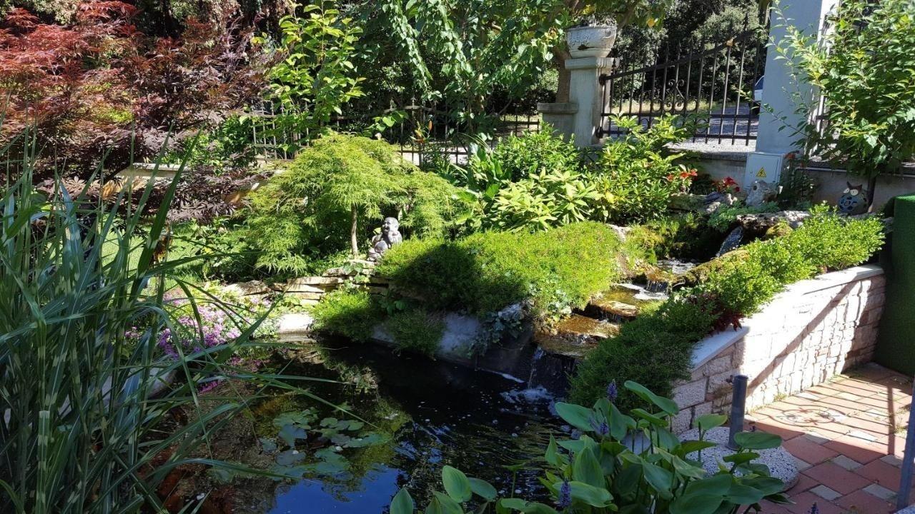 Zur Verfügung stehen Gartenmöbel, Sonnenliegen, ein Grill, Liegewiesen, ein Teich und ein Wäscheständer.