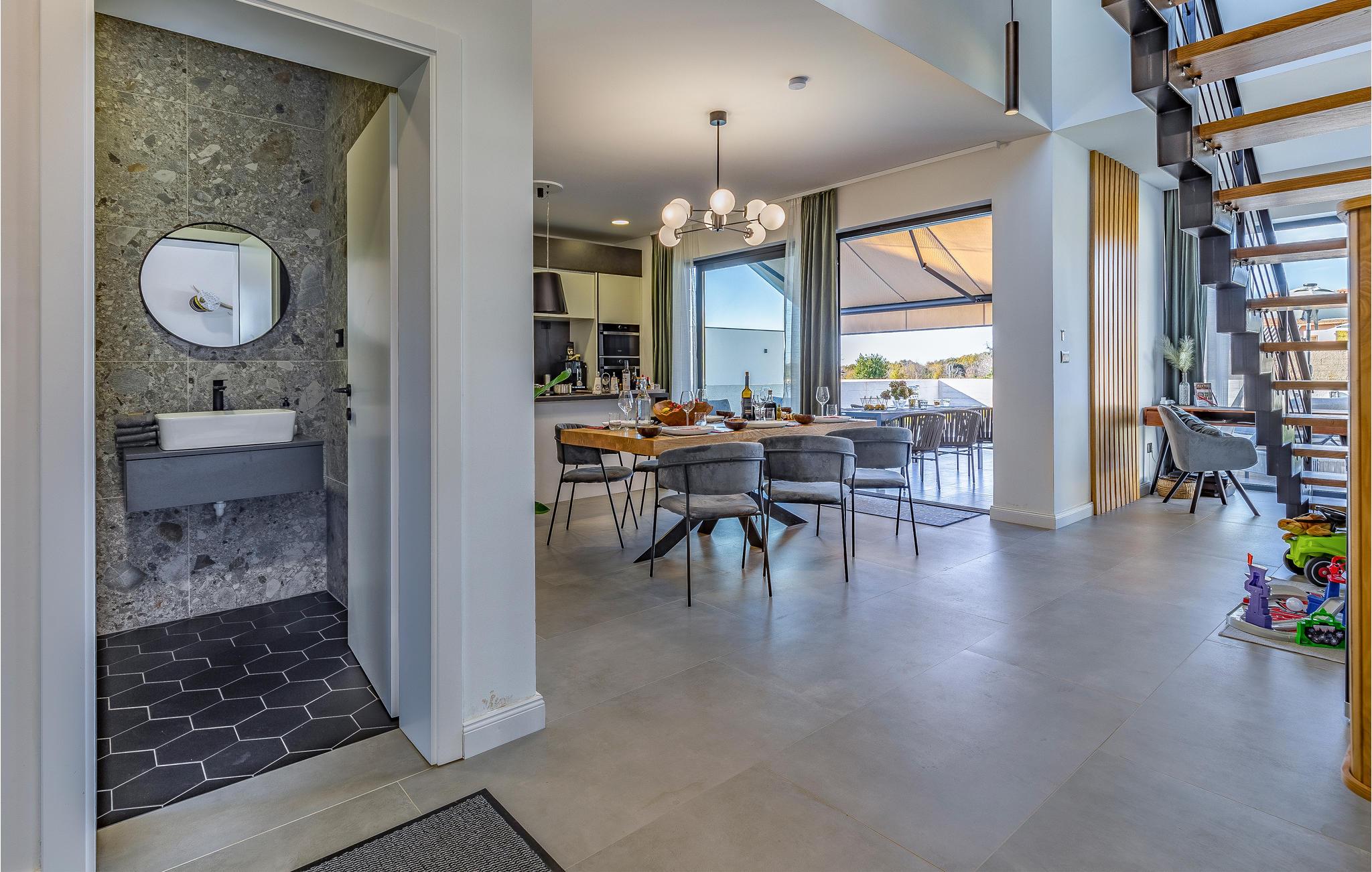 Komfort, Design und Familienfreundlichkeit verbindet dieses einladende Haus. Gemeinsam mit Ihrer Familie werden Sie Ihren Aufenthalt hier voll auskosten und auf zwei Etagen das wohnliche Ambiente genießen. Zaubern Sie leckere Mahlzeit in der voll ausgestatteten Küche, nehmen ein entspannendes Schaumbad in der Wanne oder schauen am Abend einen Film auf dem Sofa.