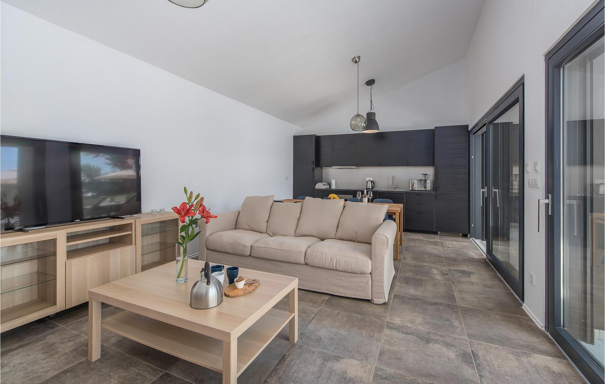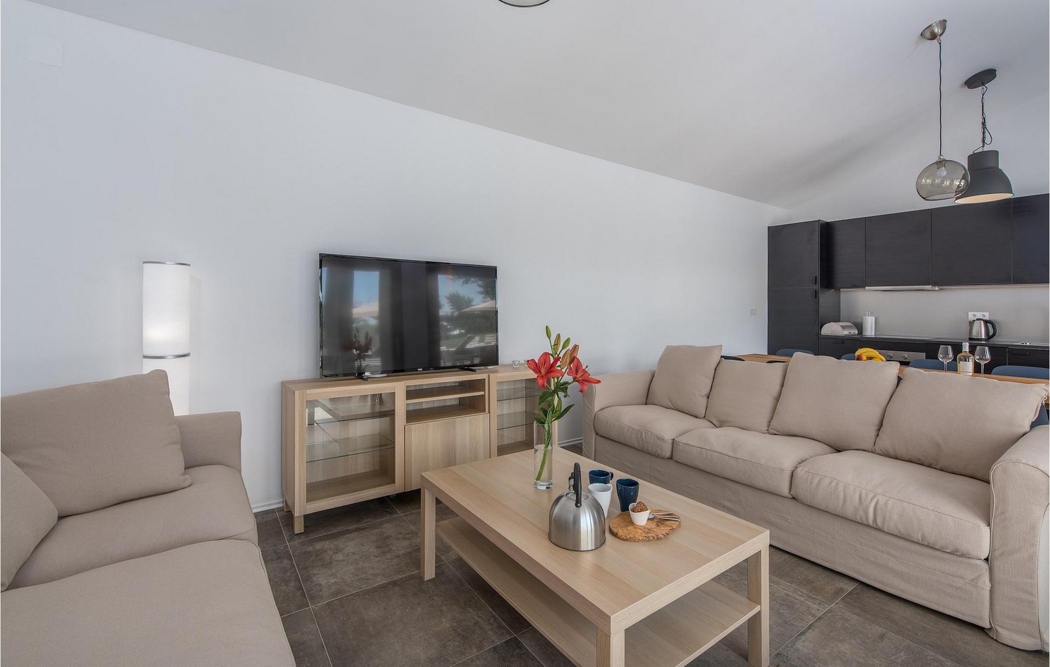 Das erste, was Sie begeistern wird, ist das praktische und einfache Innenraumkonzept, da sich alle tägliche Aktivitäten im Erdgeschoss befinden: Küche mit Essbereich und Wohnzimmer mit Schlafsofa, von dem aus eine große Glastür auf eine geräumige Terrasse führt. Die insgesamt 4 Schlafzimmer, mit Doppelbett und eigenem Bad, sind so angeordnet, das sich zwei im Erdgeschoss und zwei im ersten Stock befinden.