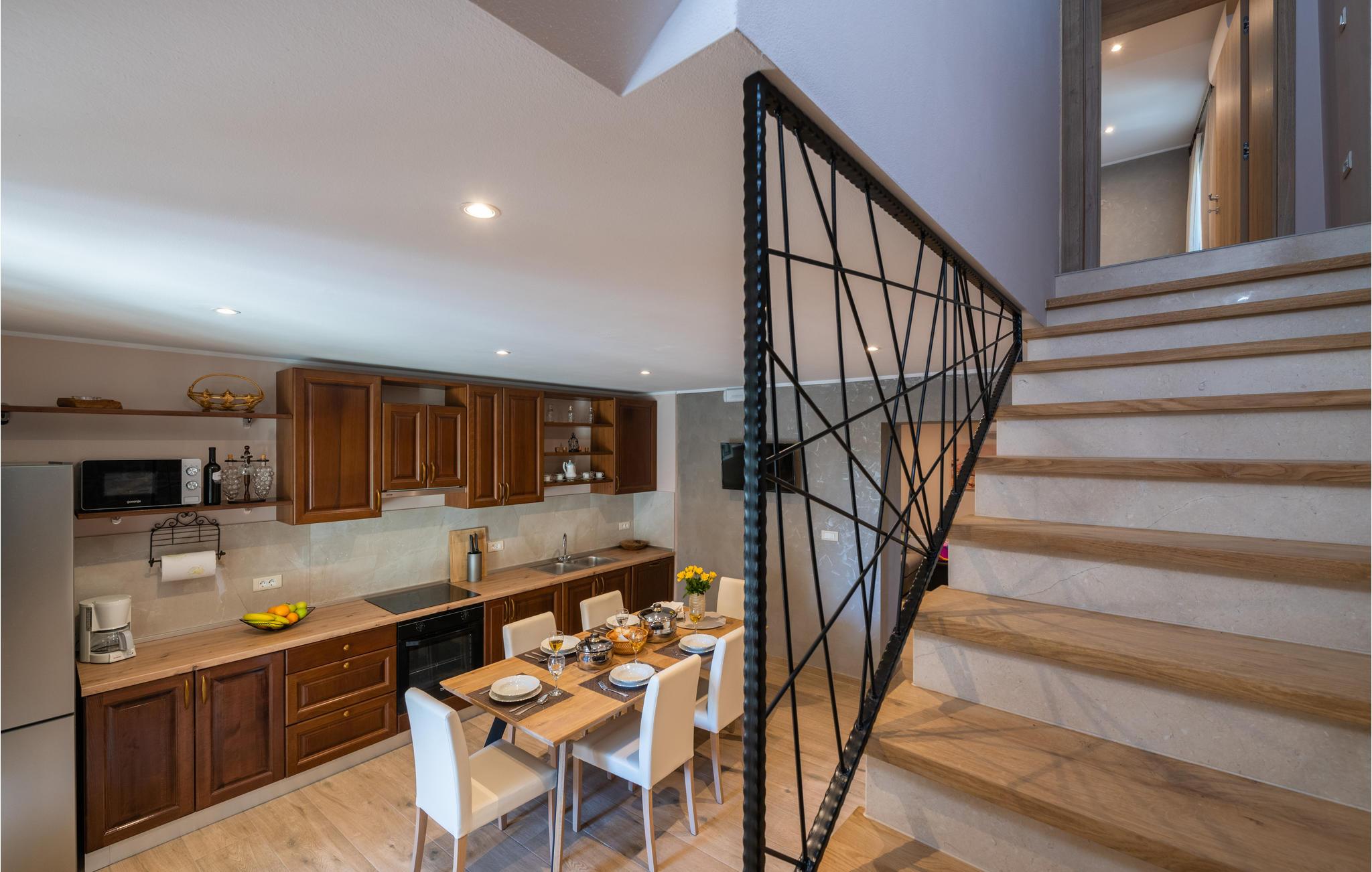 Das Haus ist stilvoll eingerichtet mit hochwertigen Möbeln und erstreckt sich über zwei Etagen. Im Erdgeschoss befinden sich der Wohnbereich mit Küche und eine Toilette. Im Obergeschoss finden Sie die zwei Schlafzimmer sowie zwei weitere Badezimmer.
