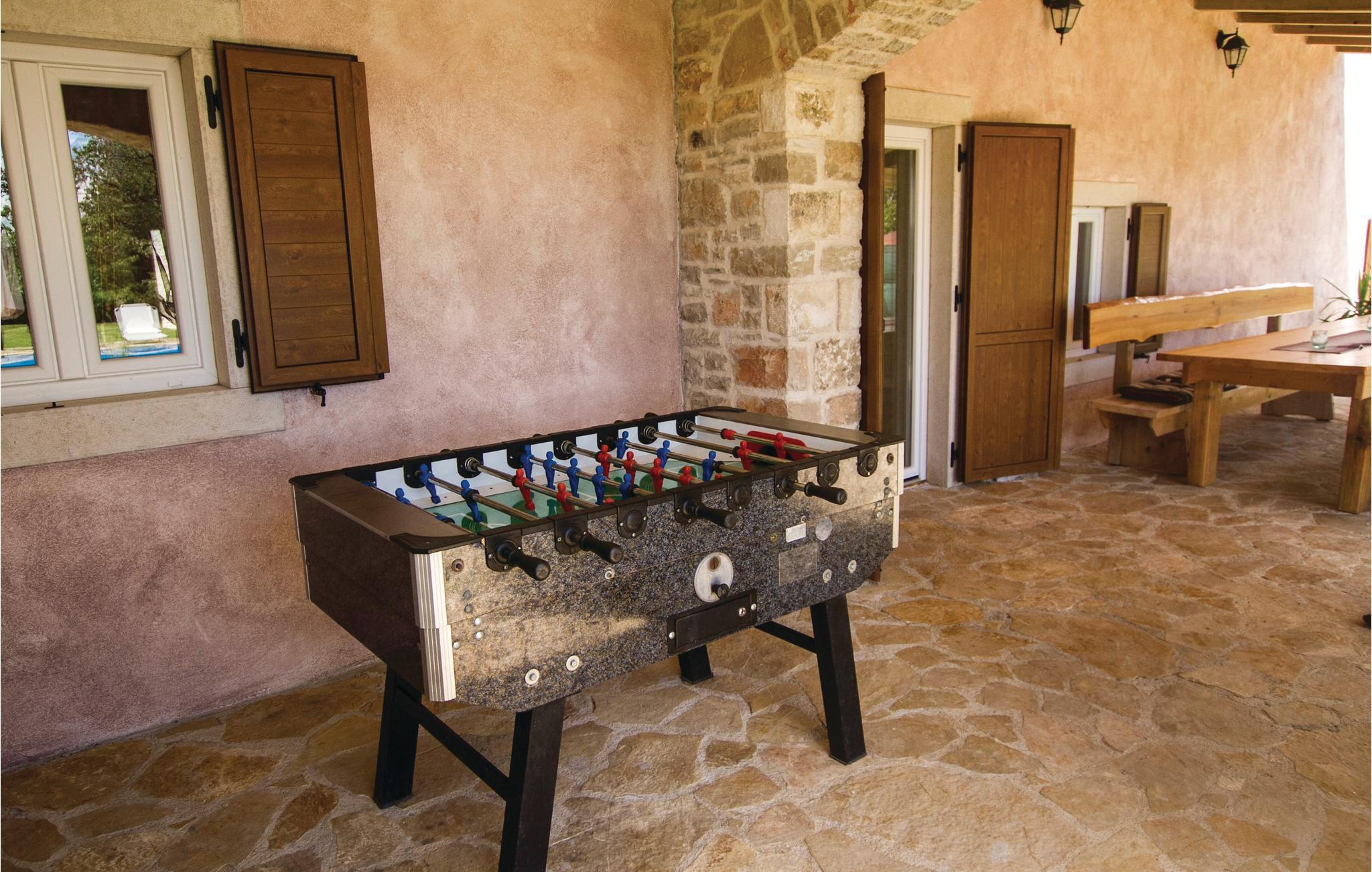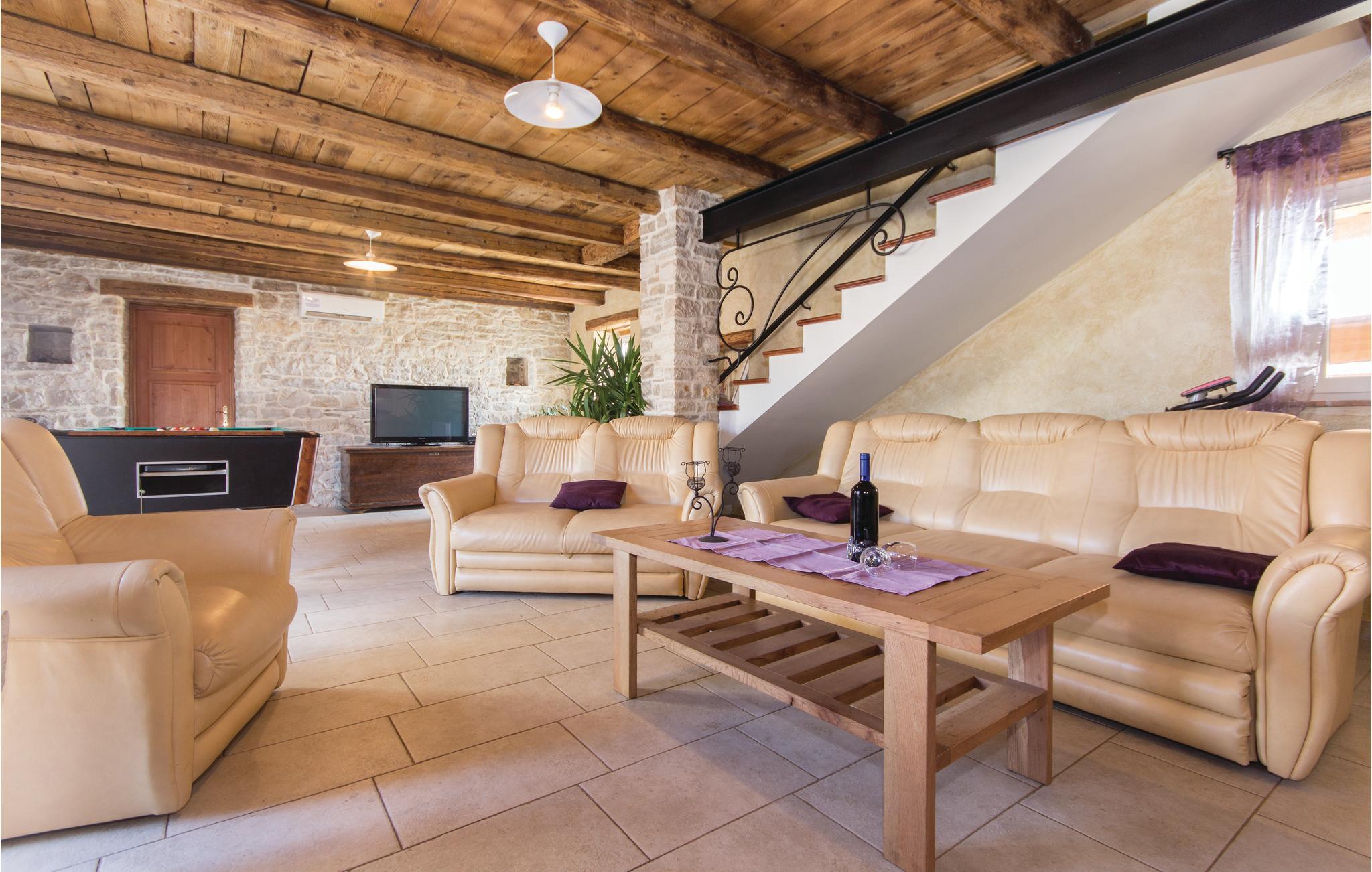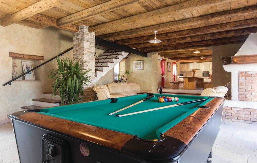 Dieses typisch istrianische Ferienhaus befindet sich in der Nähe der malerischen, mittelalterlichen Stadt Barban. Es ist im rustikalen Stil mit qualitativ hochwertigen Möbeln ausgestattet. Den Gästen stehen vier Schlafzimmer zur Verfügung, jedes mit einem eigenen Bad und einer Klimaanlage. Im Erdgeschoß befinden sich ein großzügiges, klimatisiertes Wohnzimmer mit Kamin, eine komplett ausgestattete Küche mit Essbereich und auf der überdachten Terrasse steht Ihnen ein Grill zur Verfügung auf dem Sie leckere Gerichte zubereiten können. Entspannen sie sich im großen Swimmingpool im Garten und lassen Sie die ländliche Umgebung auf sich wirken. Ihnen steht jederzeit eine drahtlose Internetverbindung zur Verfügung. Auf dem komplett umzäunten Grundstück können Sie Ihren Urlaub genießen und Kinder können hier ausgelassen spielen. In der Nähe befindet sich eine kleine Einkaufsmöglichkeit.