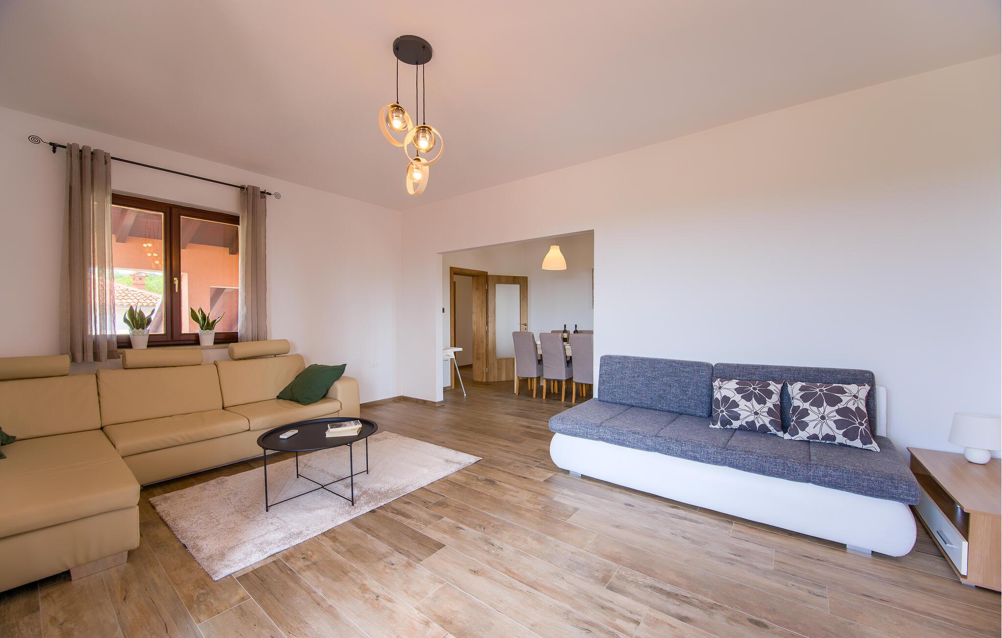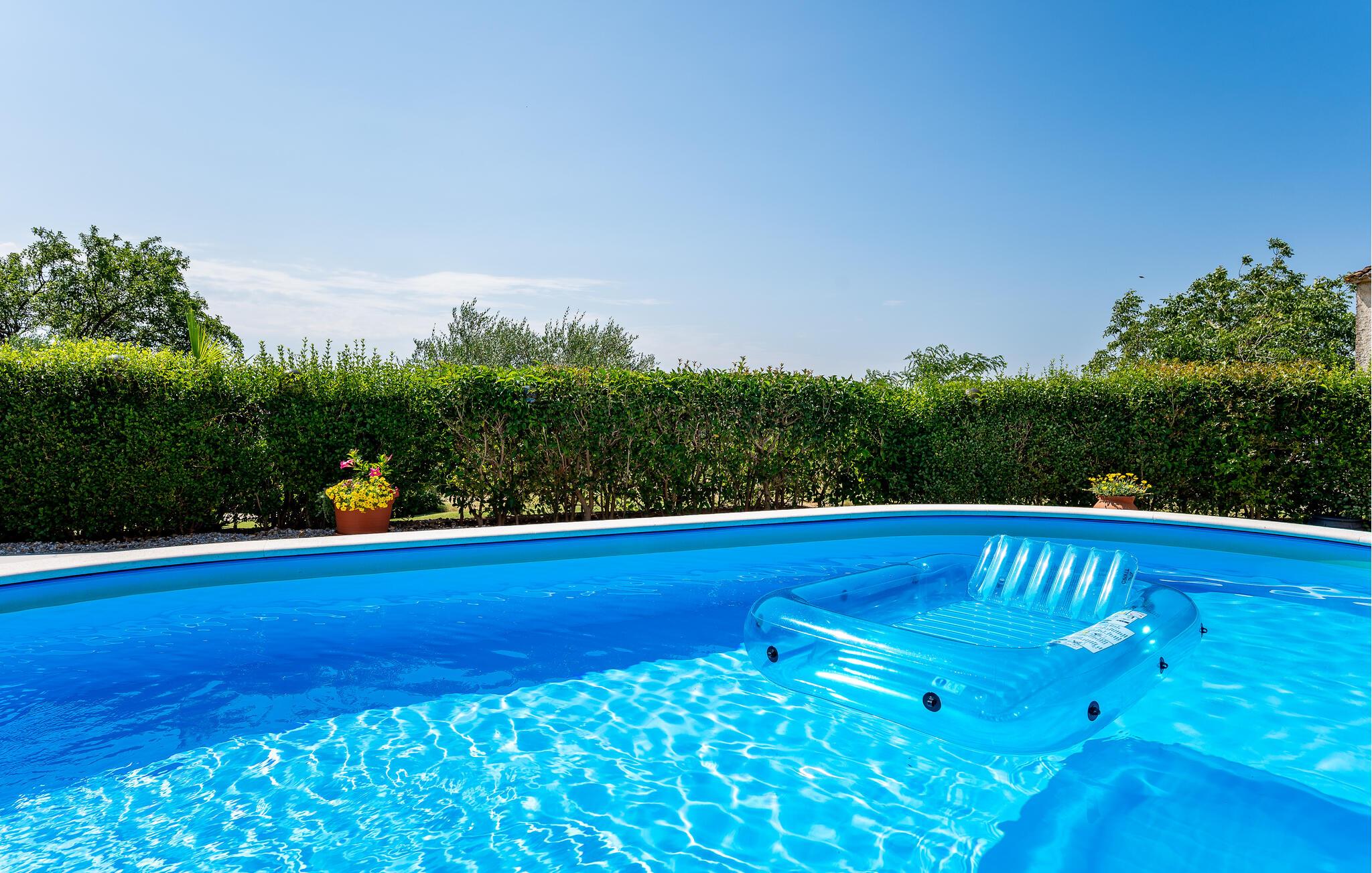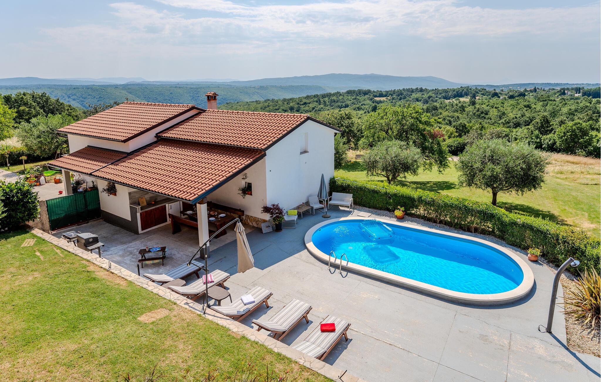 Dieses charmante und rustikal eingerichtete Ferienhaus mit Pool befindet sich am Rande eines kleinen idyllischen Dorfes. Das Doppelhaus besteht aus zwei Wohnungen mit separaten Eingängen, die mit Außentreppen verbunden sind. Der Pool bietet Ihnen die nötige Erfrischung an heißen Sommertagen und auf der Terrasse entspannen Sie sich mit einem guten Buch. Verwöhnen Sie Ihre Liebsten mit Gerichten vom Grill und lassen den Tag schön ausklingen. Dieses Haus bietet Ihnen einen idealen Ausgangspunkt für verschiedene Ausflüge: Besuchen Sie das kleine Fischerdorf Trget mit hervorragenden Fischrestaurants, die historische Altstadt von Labin auf dem Hügel und die herrlichen Kieselstrände im Touristenort Rabac. Aktiven Urlaub erleben Sie im Adrenalinpark Glavani, in der Pferderanch in Manjadvorci oder im Quad Club in Draguzeti. Sie sollten außerdem nicht versäumen, die antike Stadt Pula, den Nationalpark auf der Insel Brioni, sowie viele weitere malerische Destinationen in Istrien zu besuchen. Entdecken Sie die schöne Natur und die schmackhafte Küche des Landes.
