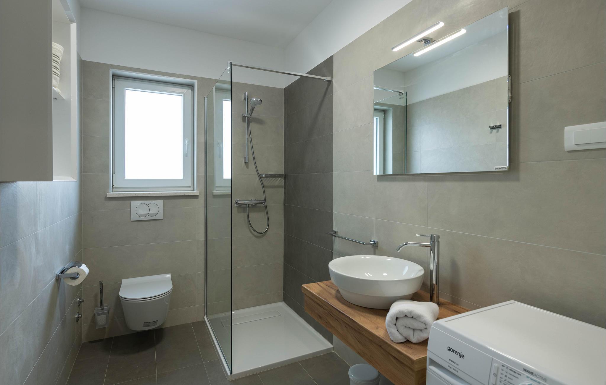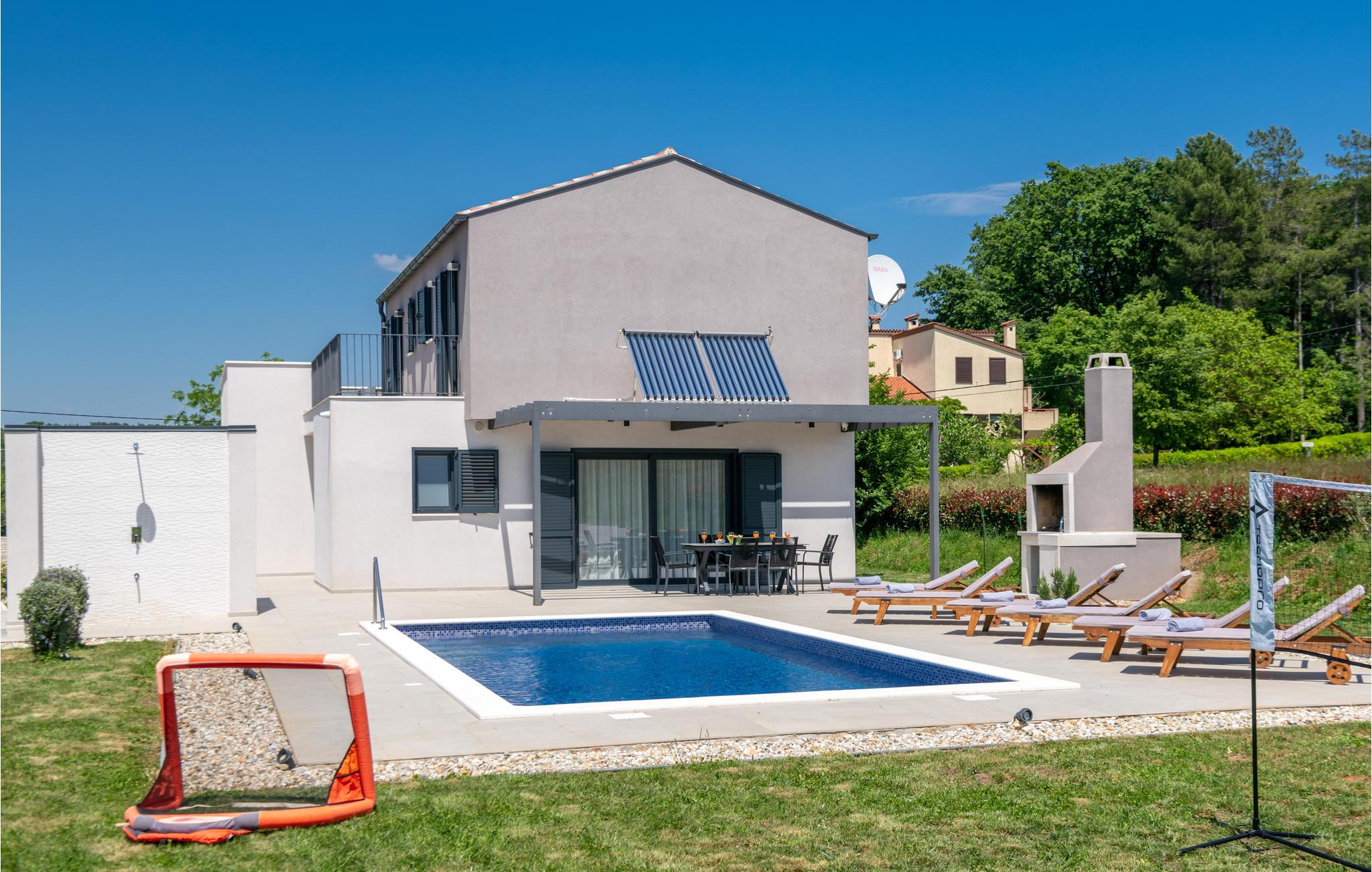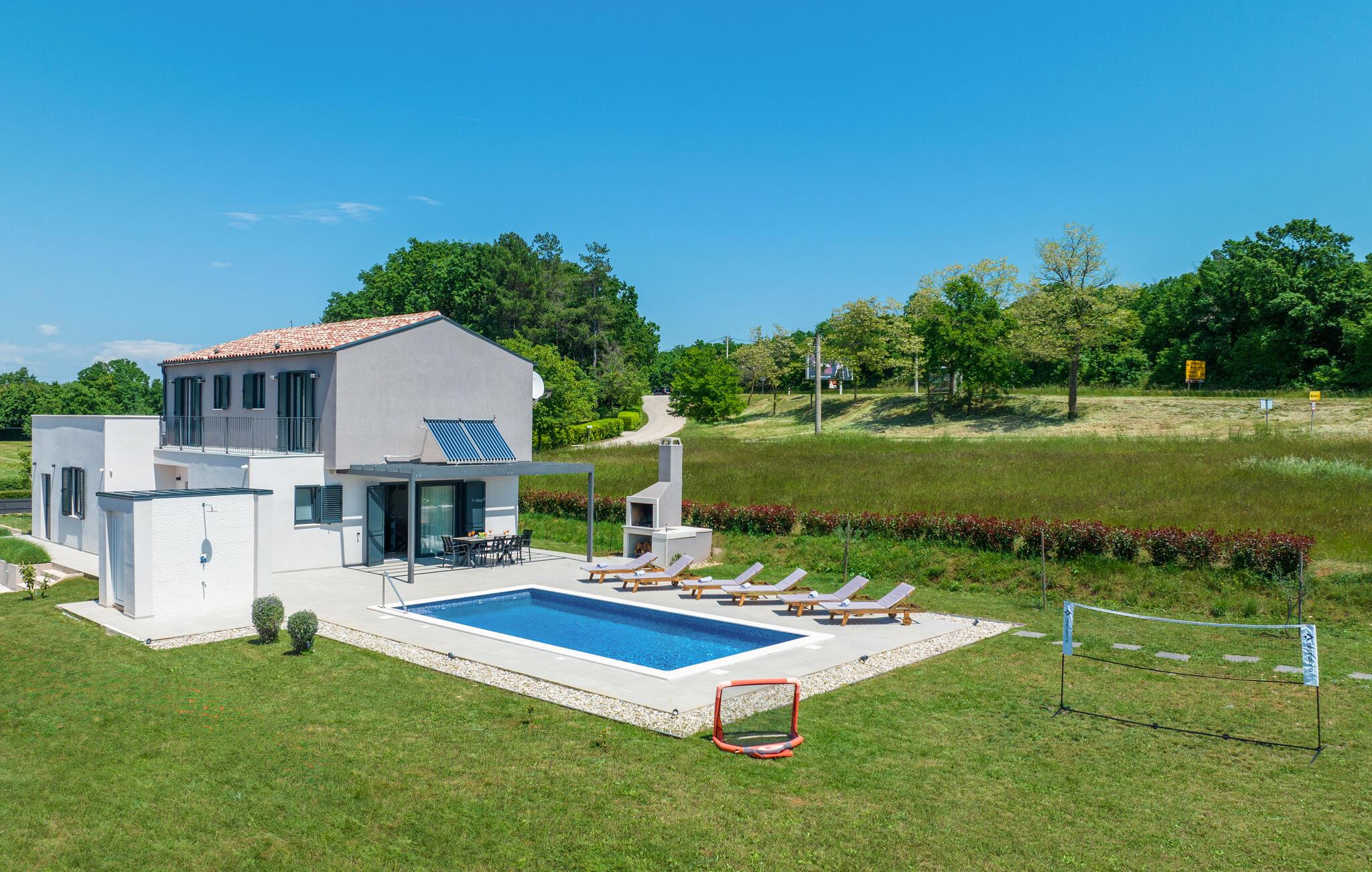 Dieses schöne Ferienhaus befindet sich in dem kleinen Ort Manjadvorci. Moderne Bauweise und wunderschön dekorierte und gut ausgestattete Innenräume bieten Ihnen mit Sicherheit den notwendigen Komfort für einen angenehmen Urlaub. Eine geräumige überdachte Terrasse verbindet das Erdgeschoss mit einem Sonnendeck und einem Pool, der den Hof dominiert. Der Pool ist auch mit Hydromassagedüsen für noch mehr Komfort ausgestattet. Unterhalb des geräumigen Grundstücks befinden sich Einrichtungen für Kinder. Probieren Sie traditionelle istrische Spezialitäten und erlesene Weine in nahe gelegenen Restaurants und Tavernen. Besuchen Sie im Ort selbst die Reiterfarm und lernen Sie das Reiten. Für diejenigen, die Spaß haben möchten, gibt es auch den Adrenalinpark Glavani. Die nächsten Strände befinden sich in der Bucht von Krnicki Porat, Rakalj oder Blaz. Das Haus liegt an der Hauptstraße und ist daher leicht zugänglich und ideal für diejenigen, die den südlichen Teil der istrischen Halbinsel erkunden möchten. Pula, Kap Kamenjak, Fažana, auf der anderen Seite von Istrien Rovinj, Porec oder an der Ostküste von Labin und Rabac erwarten Sie mit ihren Attraktionen. Zentralistrien wird Sie mit mittelalterlichen Städten wie Svetvincenat und Zminj verzaubern.