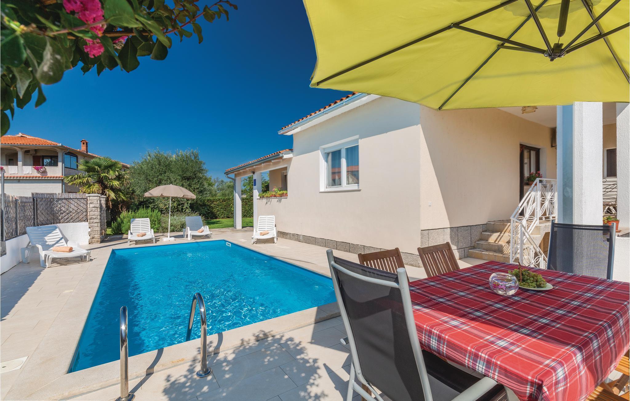 Dieses schöne und komfortable Ferienhaus auf einer Etage liegt im Ort Melnica, nahe Barban, das für das Ritterspiel Trka za prstenac bekannt ist. Eine überdachte Terrasse verbindet den Innen und Außenbereich, wo ein Grillplatz und Esstisch platziert sind. Vor der Terrasse erstreckt sich der mit Sträuchern umgebene Pool.