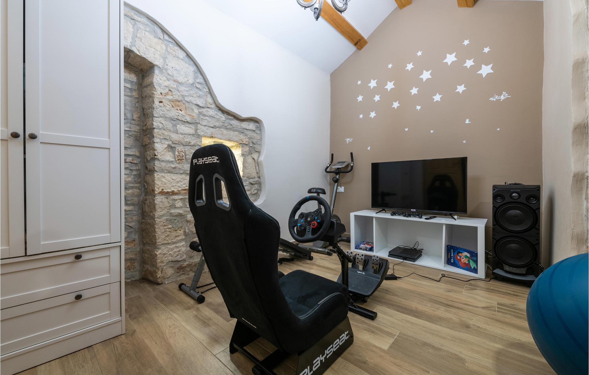 Es fügt sich perfekt in die ländliche Idylle ein. Das Erdgeschoss besteht aus einem Wohnzimmer und einem großen Badezimmer, der erste Stock besteht aus zwei Schlafzimmern, einem Badezimmer und einem Aktivitätsraum, der mit einer überdachten Terrasse verbunden ist, auf der Sie Tischtennis und Darts spielen können. Im Dachgeschoss befinden sich zwei weitere klimatisierte Schlafzimmer und ein Badezimmer. Die niedrigste Höhe des Dachbodens beträgt 60 cm. Die untere Terrasse ist ideal für Geselligkeit bei der Zubereitung von Grillgerichten.