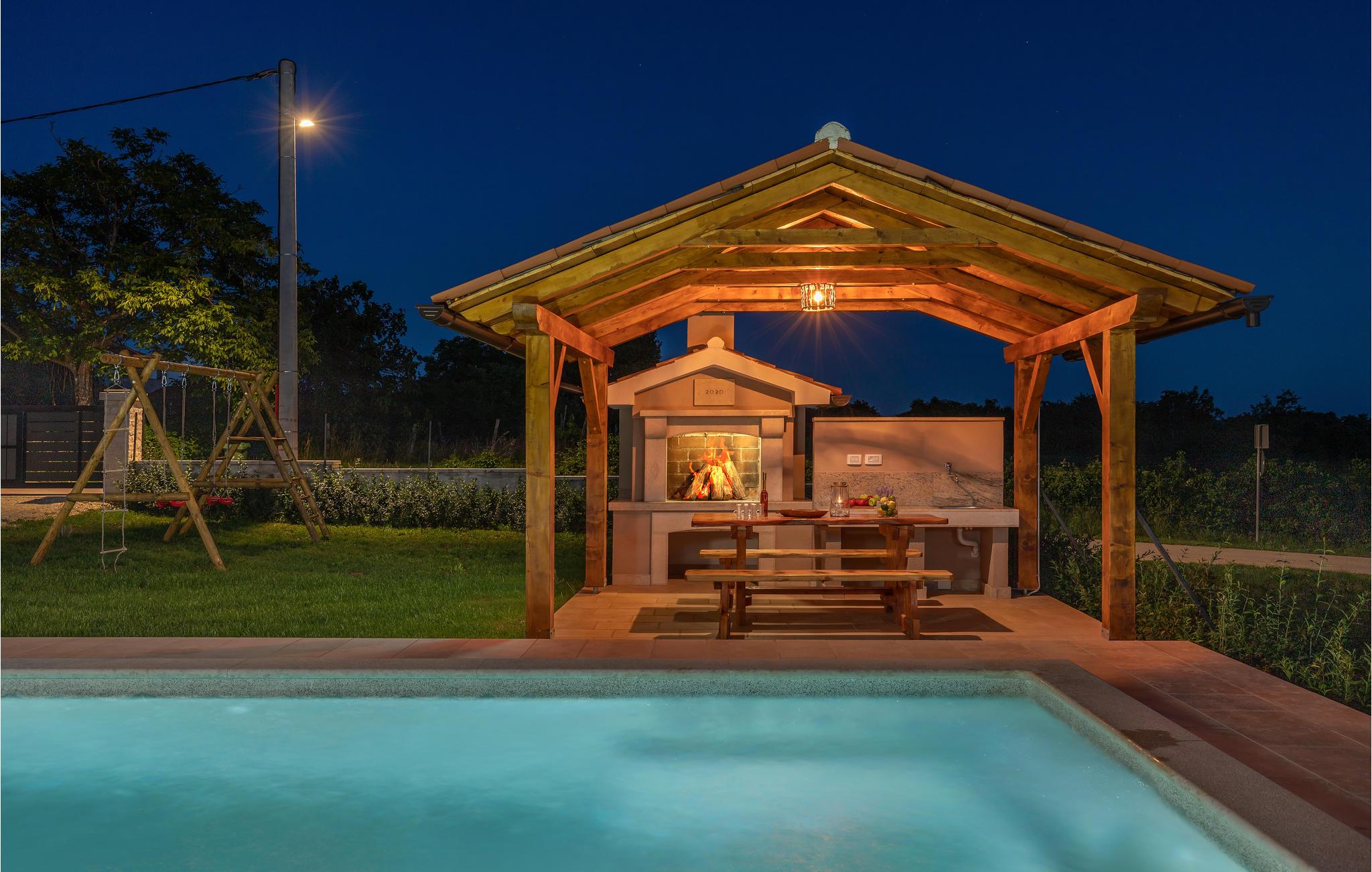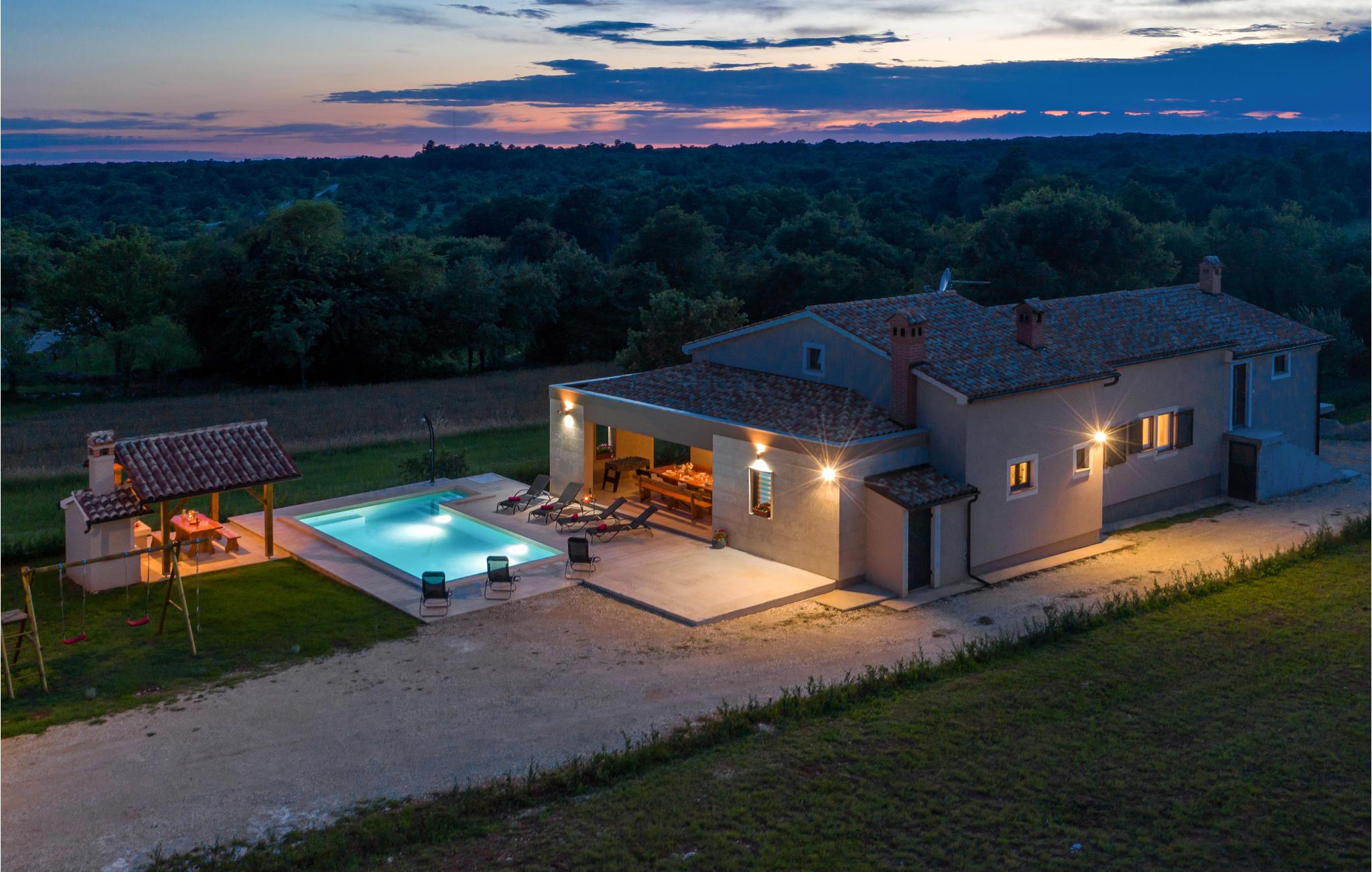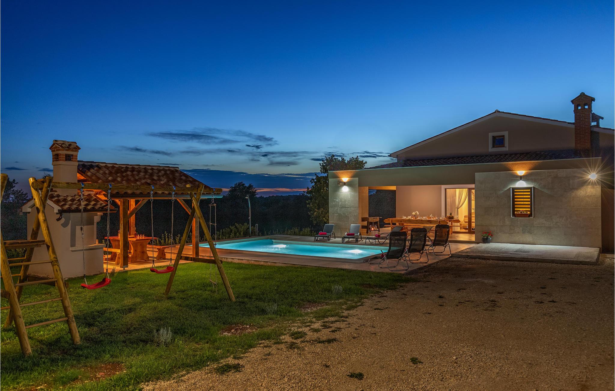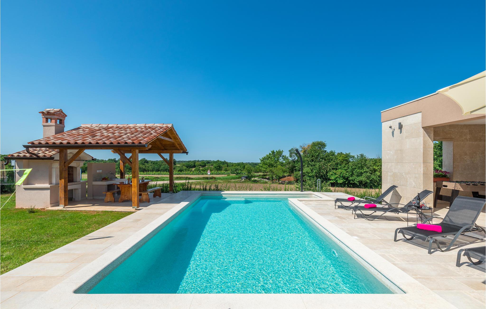Dieses schöne Ferienhaus befindet sich in Orihi, dem kleinen Ort im Inland Istriens. Moderne Architektur und wunderschön dekorierte und gut ausgestattete Innenräume bieten Ihnen mit Sicherheit den notwendigen Komfort für einen angenehmen Urlaub. Eine geräumige überdachte Terrasse verbindet das Haus mit dem Sonnendeck und dem Pool, der den Hof dominiert. Der Pool ist auch mit Hydromassagedüsen für zusätzlichen Komfort und Entspannung ausgestattet. Auf der Poolterrasse befindet sich ein Grill, auf dem Sie Ihre Lieblingsspezialitäten zubereiten können. Wir empfehlen Ihnen auf jeden Fall, traditionelle istrische Spezialitäten und erlesene Weine in den nahe gelegenen Restaurants und Tavernen zu probieren. Adrenalinliebhaber werden im Glavani Adrenalinpark auf ihre Kosten kommen. Suchen Sie nach den nächsten Stränden in Krnicki Port, Rakalj oder Uvala Blaz, genießen Sie die Freuden des Meeres und nehmen Sie unvergessliche Erinnerungen mit. Besuchen Sie die umliegende kleine Orte wie Krnica, Rakalj, Kavran, wo im Sommer verschiedene Veranstaltungen, wie Fischerfeste stattfinden, die eine ideale Gelegenheit anbieten, lokale Sitten und Bräuche, sowie die reiche traditionelle Küche kennenzulernen. Für diejenige die Stadtgedränge lieber haben, man kann in Pula Stadtbummeln gehen und viele Sehenswürdigkeiten wie Triumpfbogen der Sergier oder die römische Arena ansehen.
