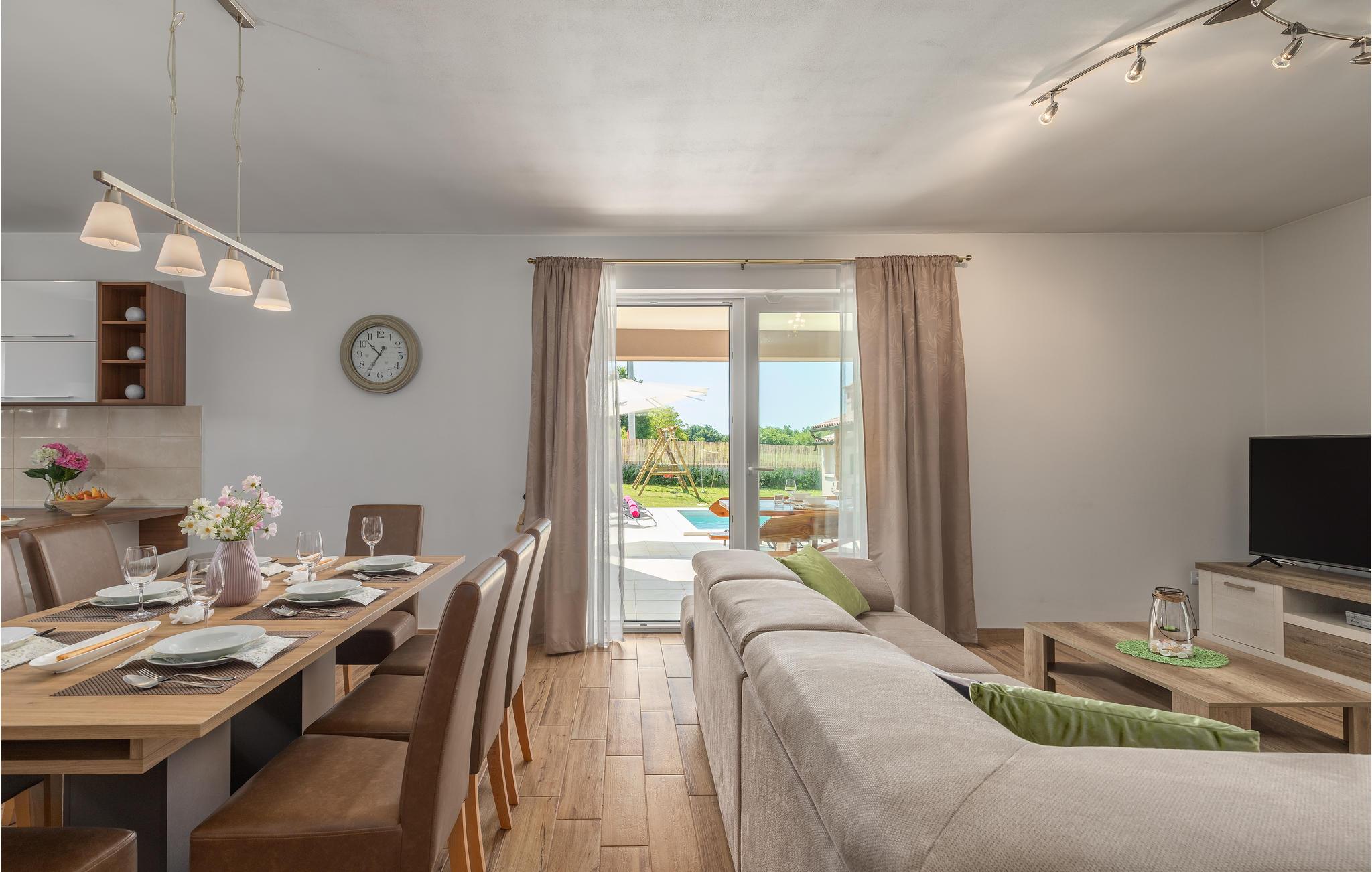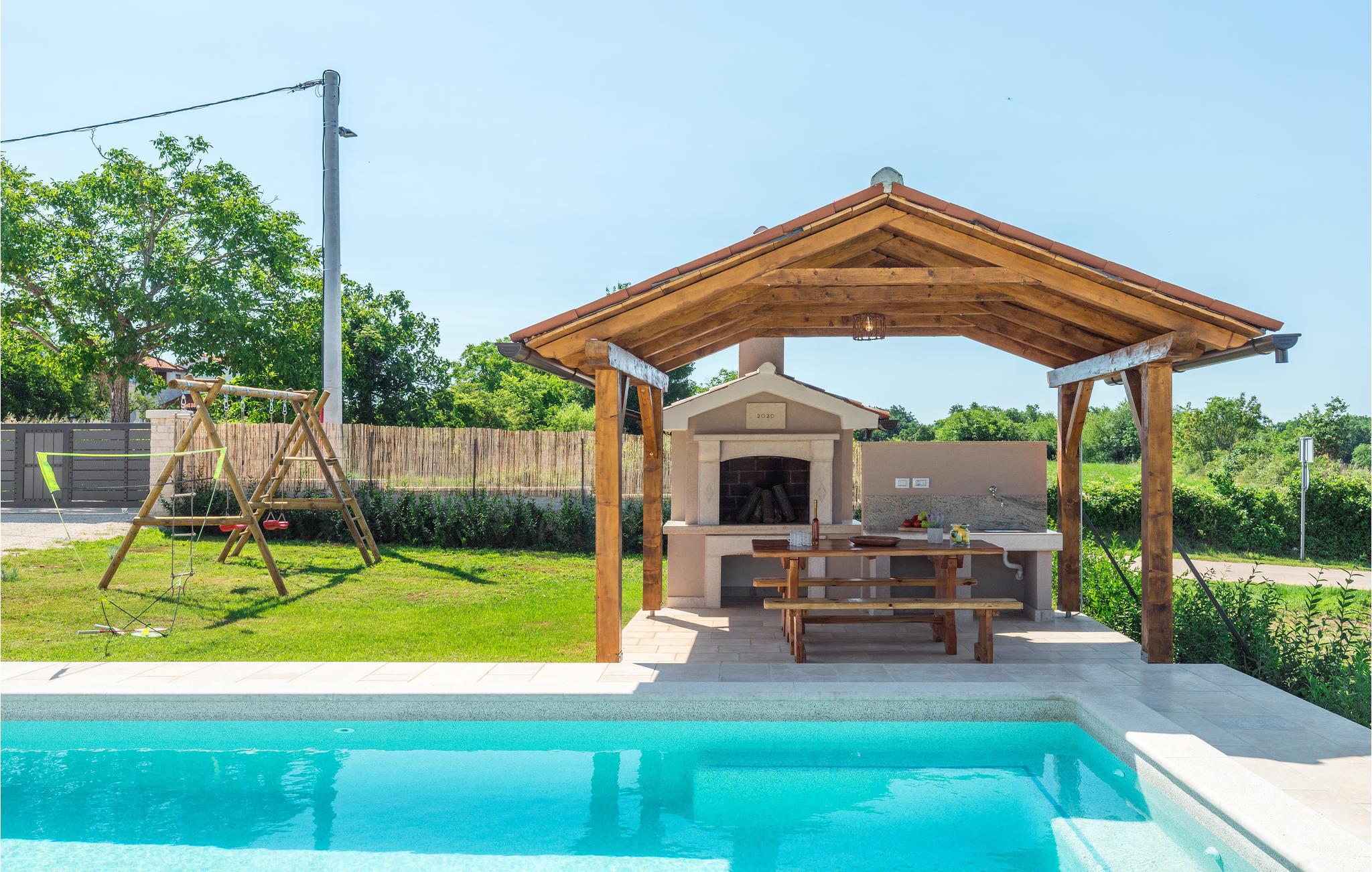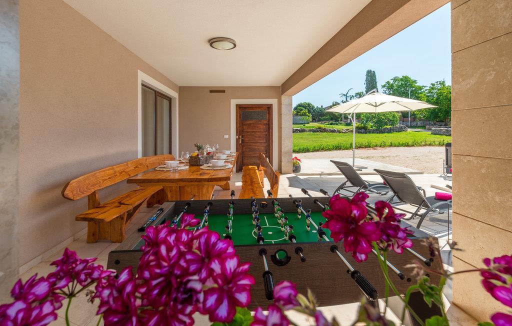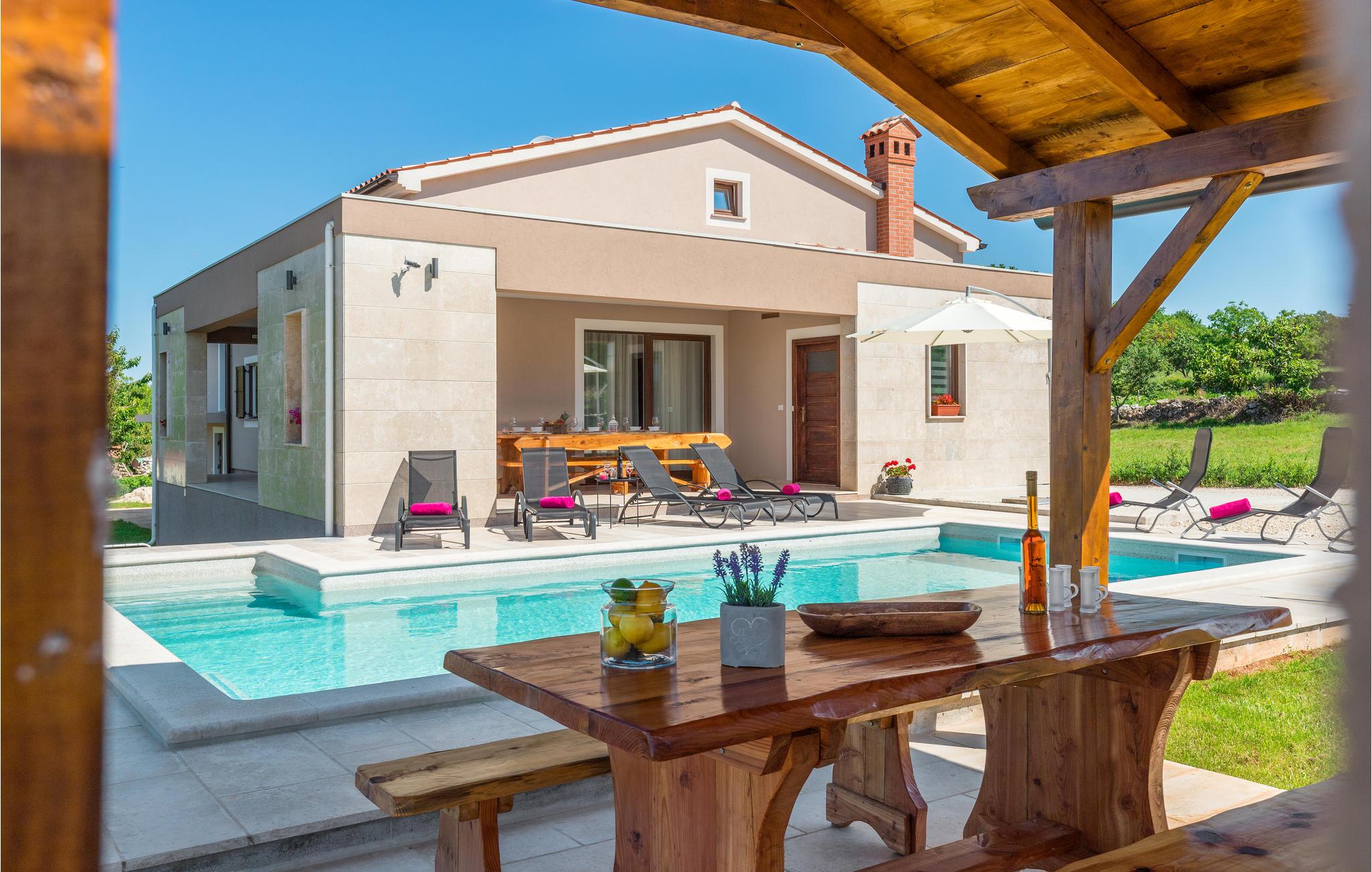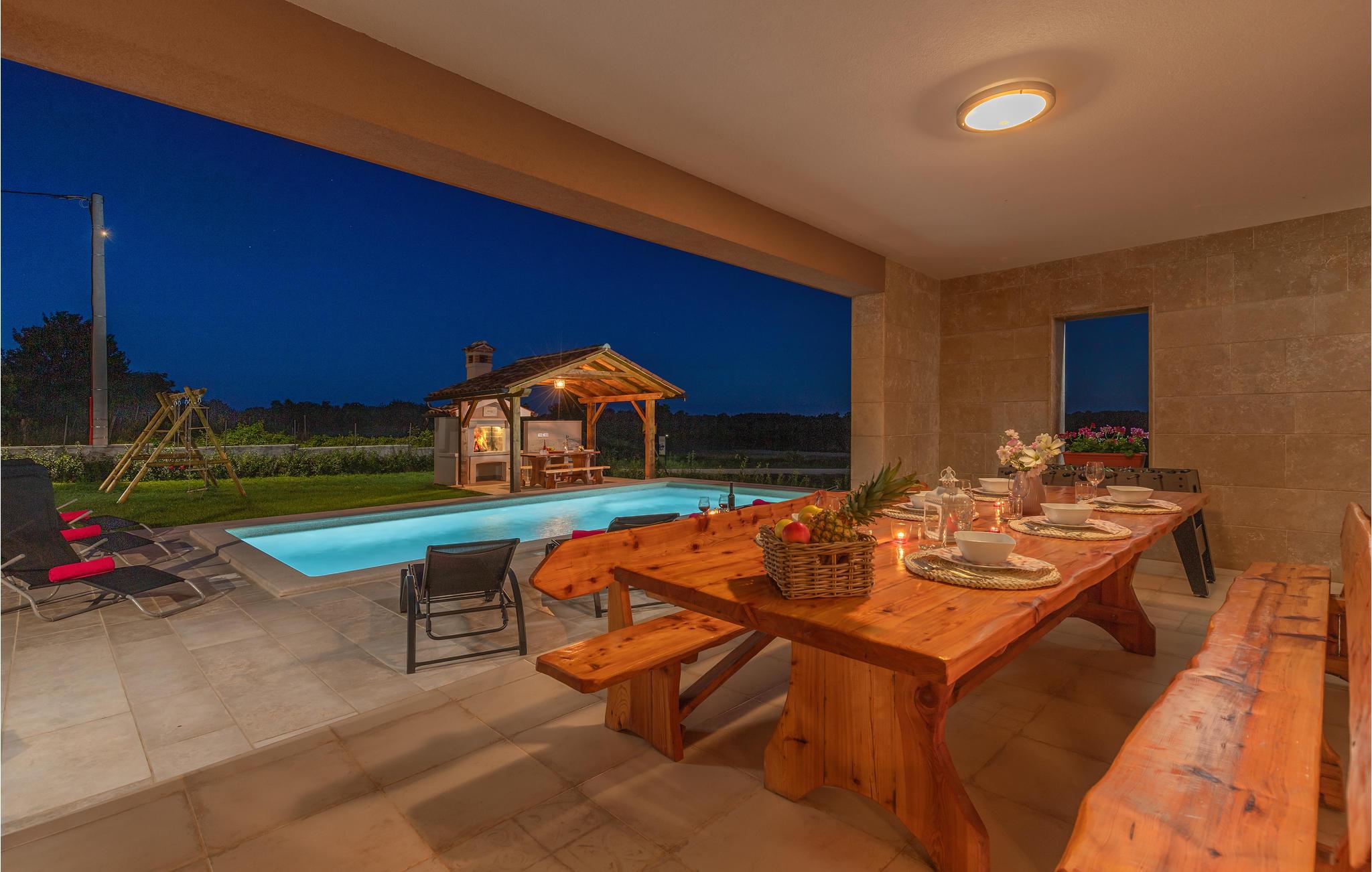 Dieses schöne Ferienhaus befindet sich in Orihi, dem kleinen Ort im Inland Istriens. Moderne Architektur und wunderschön dekorierte und gut ausgestattete Innenräume bieten Ihnen mit Sicherheit den notwendigen Komfort für einen angenehmen Urlaub. Eine geräumige überdachte Terrasse verbindet das Haus mit dem Sonnendeck und dem Pool, der den Hof dominiert. Der Pool ist auch mit Hydromassagedüsen für zusätzlichen Komfort und Entspannung ausgestattet. Auf der Poolterrasse befindet sich ein Grill, auf dem Sie Ihre Lieblingsspezialitäten zubereiten können. Wir empfehlen Ihnen auf jeden Fall, traditionelle istrische Spezialitäten und erlesene Weine in den nahe gelegenen Restaurants und Tavernen zu probieren. Adrenalinliebhaber werden im Glavani Adrenalinpark auf ihre Kosten kommen. Suchen Sie nach den nächsten Stränden in Krnicki Port, Rakalj oder Uvala Blaz, genießen Sie die Freuden des Meeres und nehmen Sie unvergessliche Erinnerungen mit. Besuchen Sie die umliegende kleine Orte wie Krnica, Rakalj, Kavran, wo im Sommer verschiedene Veranstaltungen, wie Fischerfeste stattfinden, die eine ideale Gelegenheit anbieten, lokale Sitten und Bräuche, sowie die reiche traditionelle Küche kennenzulernen. Für diejenige die Stadtgedränge lieber haben, man kann in Pula Stadtbummeln gehen und viele Sehenswürdigkeiten wie Triumpfbogen der Sergier oder die römische Arena ansehen.