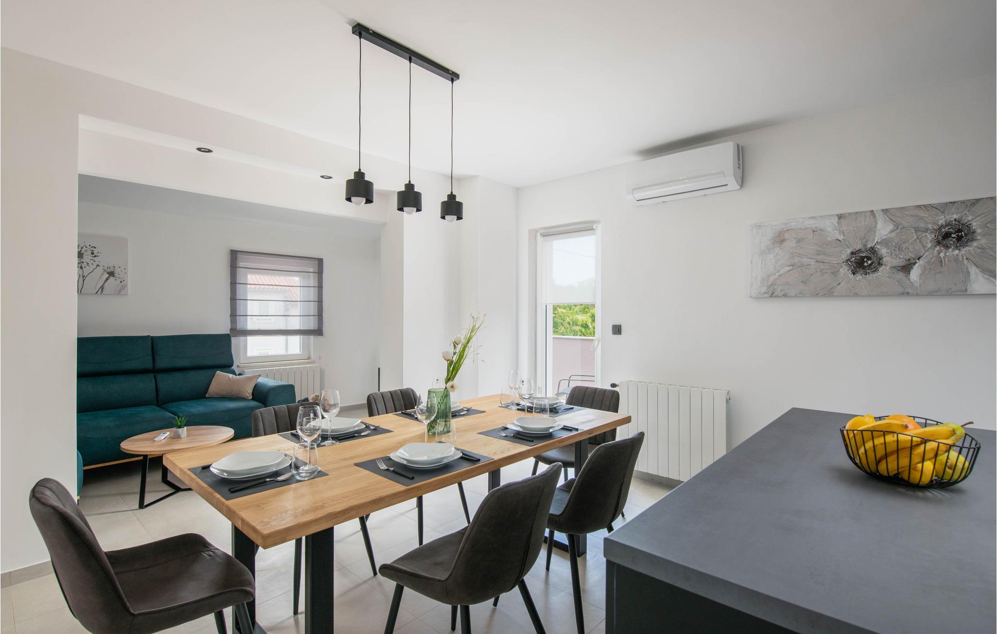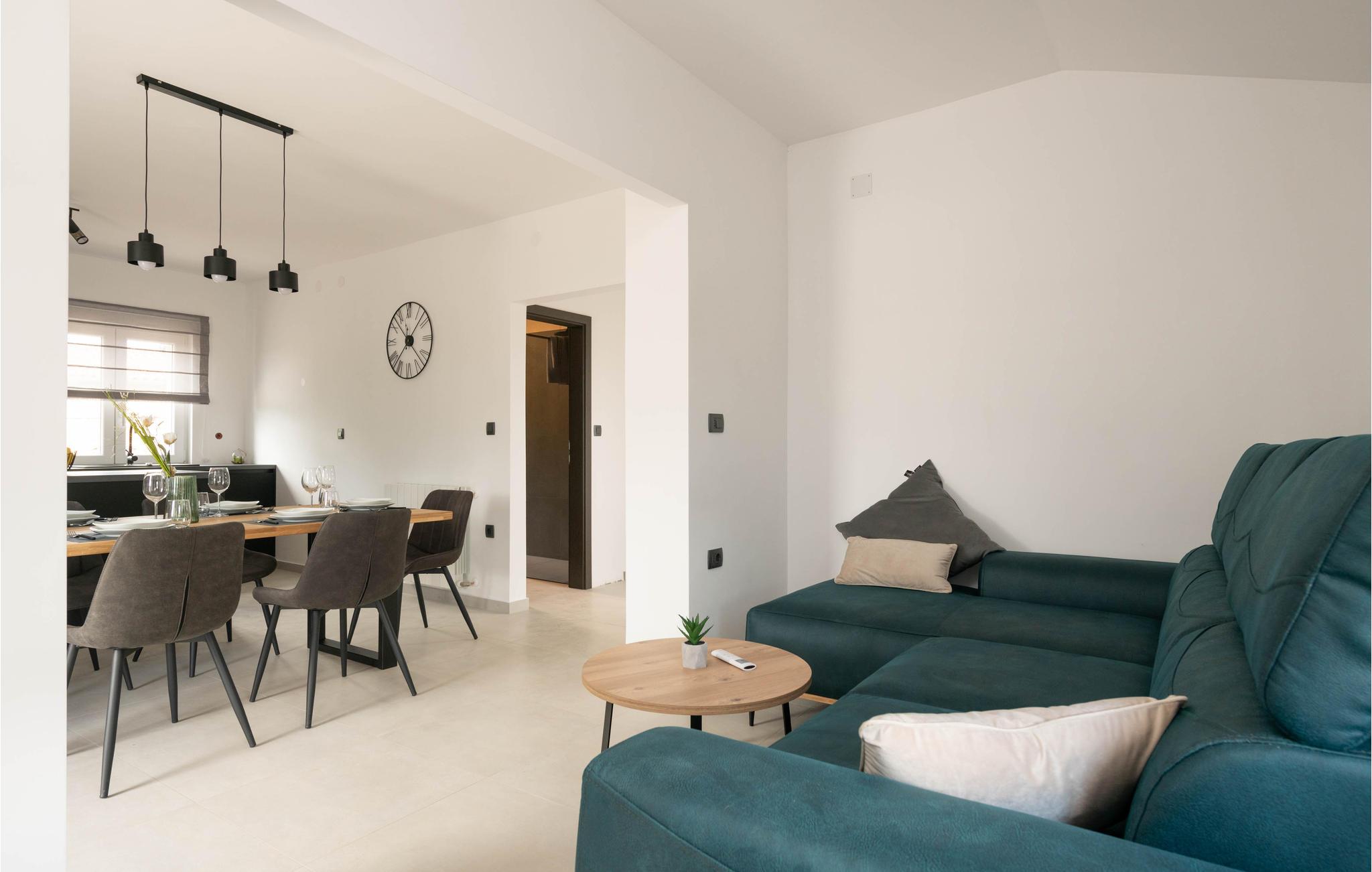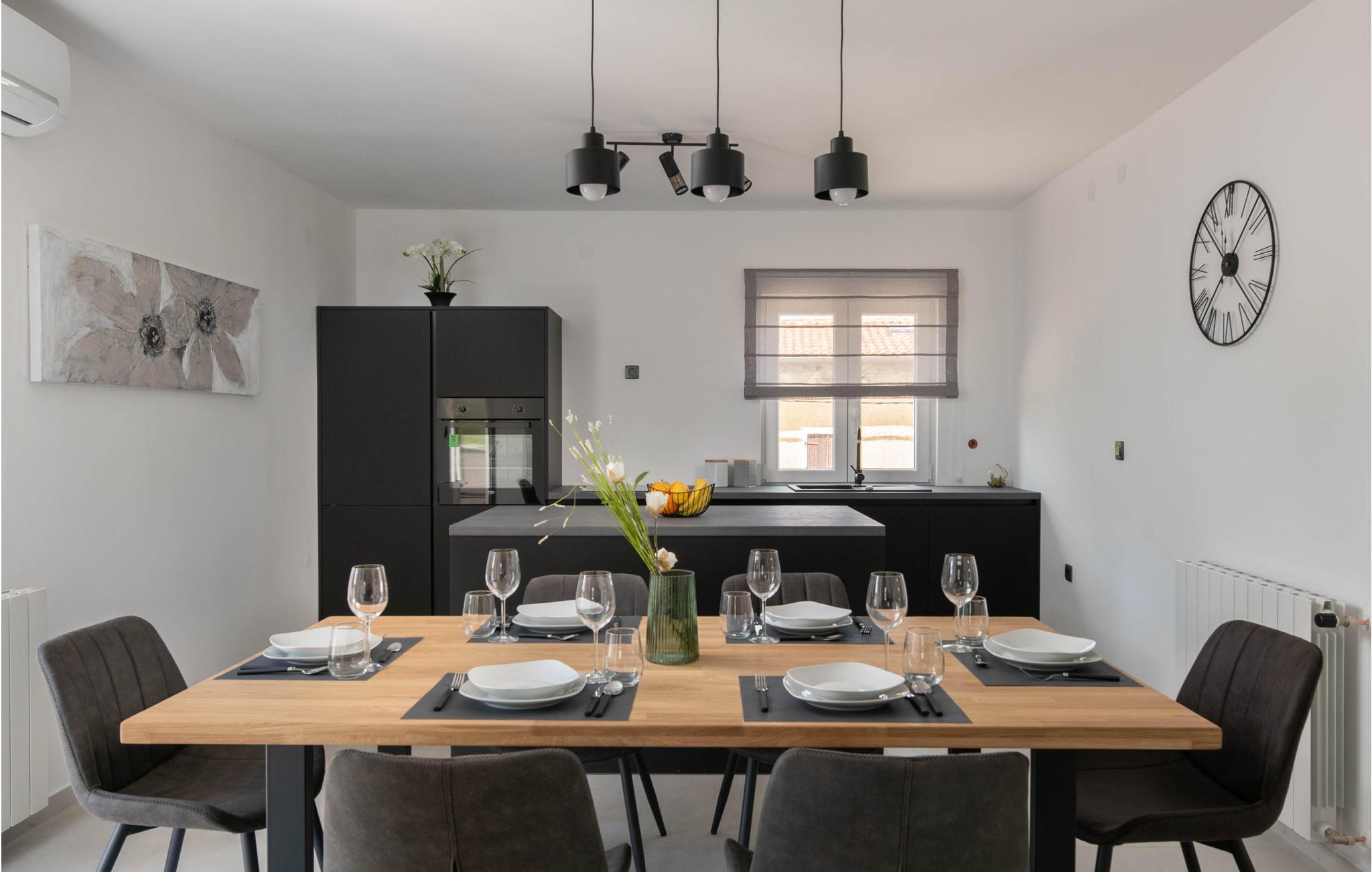 Die moderne Ferienwohnung heißt Sie in Prhati willkommen und empfängt Sie mit einer komfortablen und schönen Einrichtung, die gleich das Gefühl von zuhause ausstrahlt. Genießen Sie das offene Design der dunklen Küche, wo Sie gemeinsam an der Kochinsel die Zutaten für Ihre Gerichte schnippeln können oder im benachbarten Wohnbereich die Beine hochlegen können.