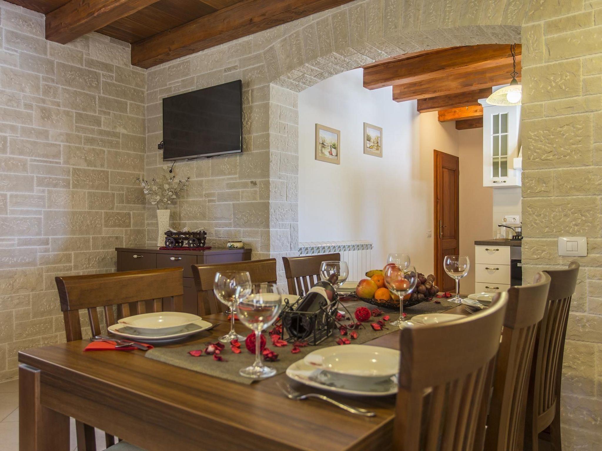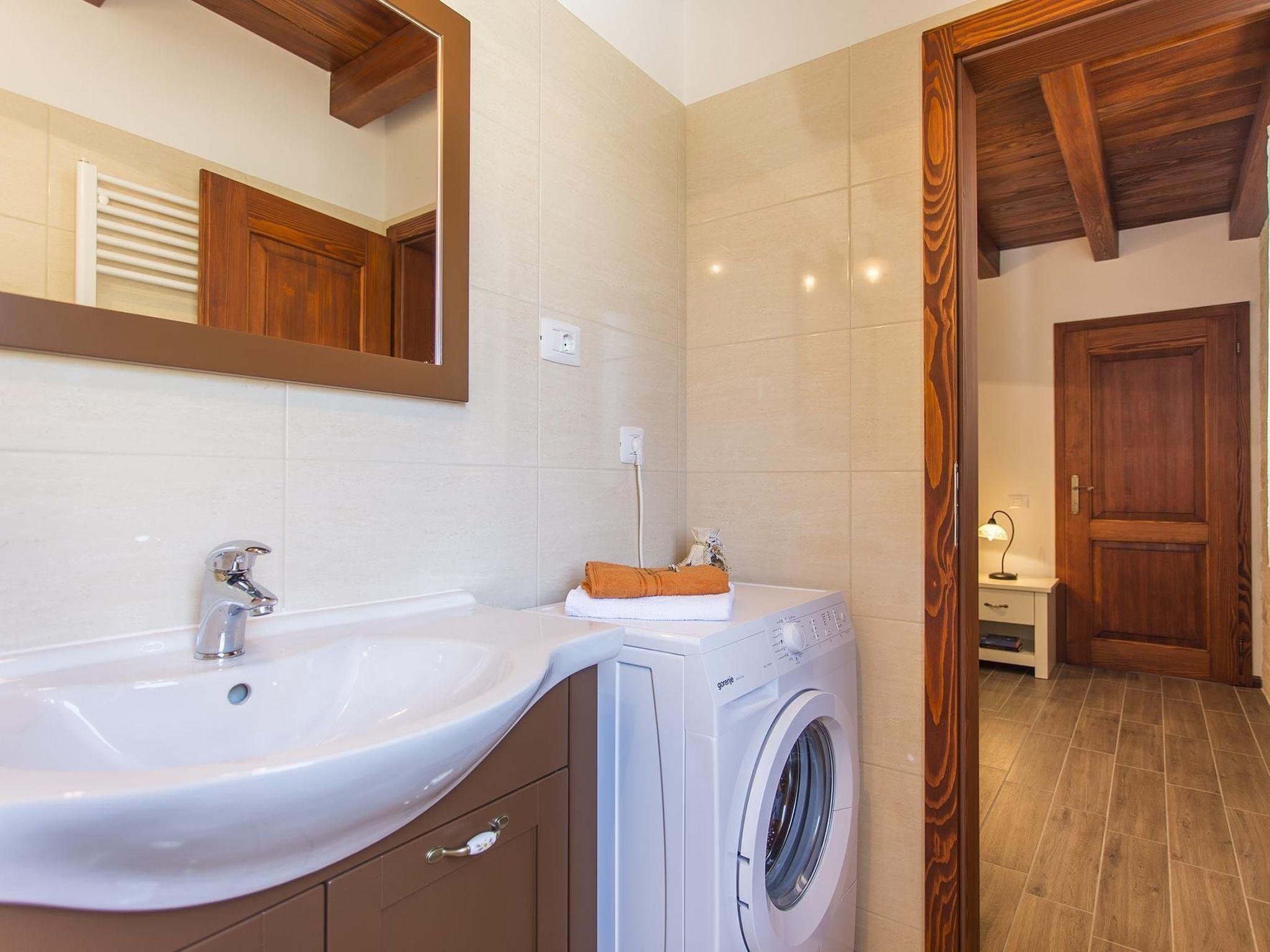 The stone villa and adjacent holiday cottage have only recently been newly built in 2012 following typical Istrian style, the 77 m² cottage is tastefully furnished and equipped with all the modern comforts you might need for a memorable holiday. Exposed wooden beams along the ceiling in all rooms create a warm inviting atmosphere and add to the rustic country living atmosphere. The cottage features a spacious living-/dining area, a fully equipped modern kitchen, two bedrooms and two bathrooms. The air conditioned living area is furnished with a six seater corner sofa, a wall mounted flat screen satellite television, a safe where you can keep your valuables and a large wooden dining table with six matching chairs. A large archway leads into the top modern kitchen complete with a dishwasher four hob gas cooker and stylish extractor hood, oven, fridge with freezer compartment, microwave, electric kettle and a coffee machine. The master bedroom has its own ensuite bathroom and is furnished with a 180 cm x 200 cm double bed and a large wardrobe providing plenty of space for your clothes and luggage. The ensuite bathroom is equipped with a spacious shower cabin, large wash basin with undersink cabinet and wall mirror, a toilet and a washing machine. Next to the master bedroom is the second bedroom with two 90 cm x 200cm single beds which can be pushed together to make a double bed and a large built-in wardrobe. The second separate bathroom is also equipped with a large shower cabin, wash basin and a toilet. A bed for a child can also be provided. Reliable WLAN internet access is offered free of charge.