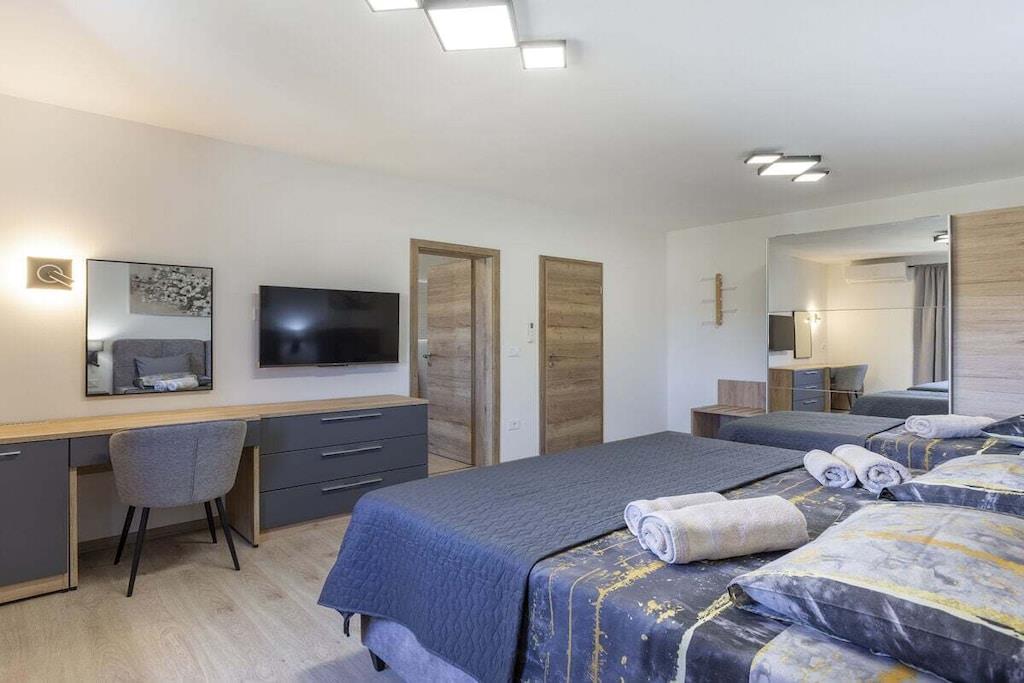 Hot Water, Safe, Kitchen(Kitchenette, dining table, stove, hob, electric kettle, toaster, coffee machine, oven, microwave, dishwasher, fridge, freezer), Living/diningroom(Sofa, single sofa bed, TV, dining table, air conditioning, high chair), bedroom(Bed Linen, Wardrobe, double bed, TV, air conditioning), bedroom(Bed Linen, Wardrobe, single bed, double bed, TV, air conditioning), bathroom(Mirror, toilet), bathroom(Mirror, toilet, shower, washbasin), bathroom(Mirror, toilet, shower, washbasin, washbasin), Internet access, Internet access, washing machine, balcony(balcony), terrace(garden furniture), garden(Sun Umbrella, Barbecue center, Beach, sun loungers, trampoline, swimming pool, slide, Swing set), parking