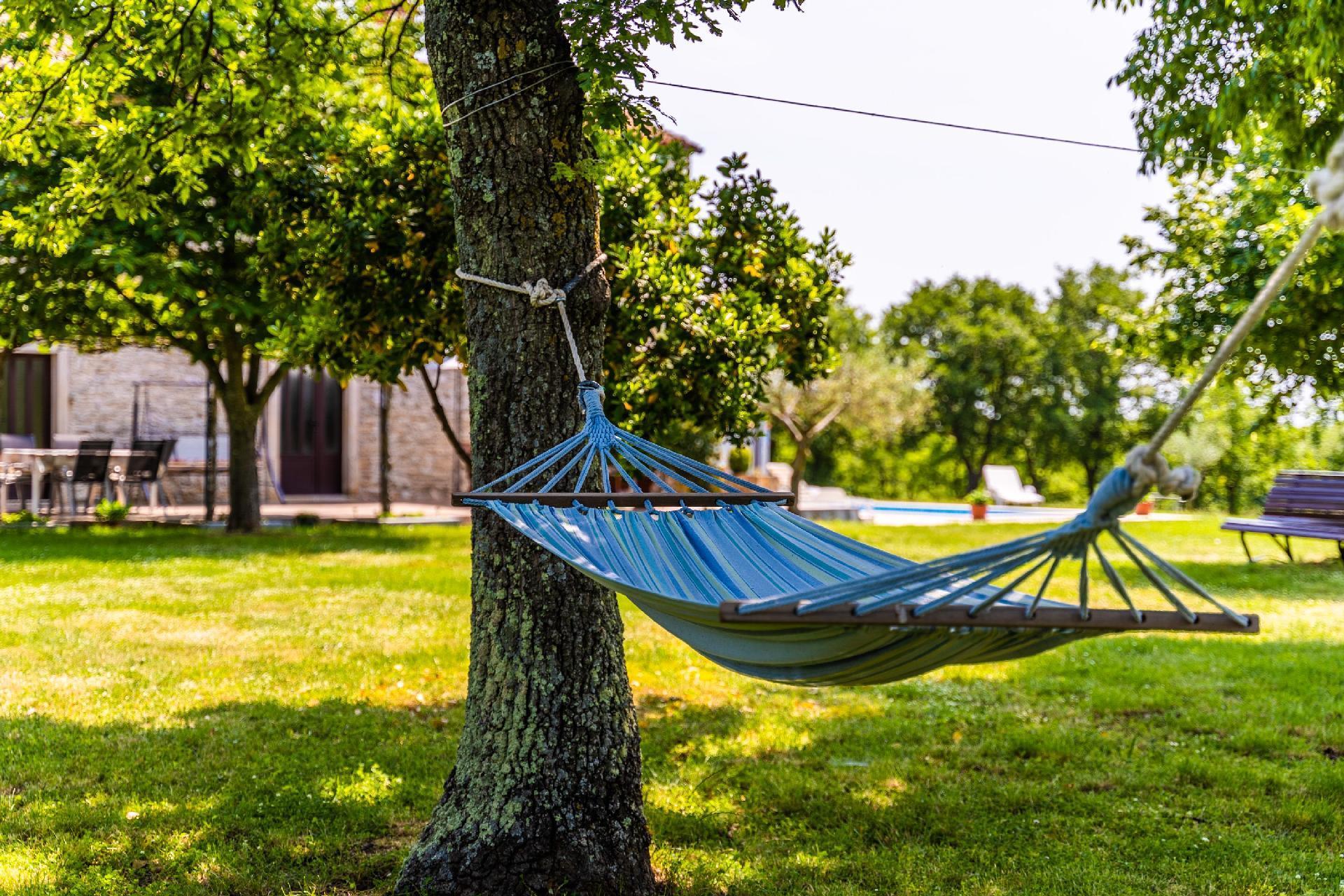The garden covers area of 10 000 hectare with private swimming pool (8 x 4 m), exterior shower, 10 sunbeds, 2 hammocks, 2 x BBQ, 3 x garden sitting furniture and children playground with swings and slide.. In the back yard there is a volleyball and football field. Distanced 25 km from Pula, the cultural and historical center of Istrian peninsula, 15 km from the Istrian coast, village offers perfect escape from the busy and vivid atmosphere of the Istrian coast. Yet, within 15 minutes drive through the picturesque scenery, the beaches and urban life experience can be reached. It's a perfect starting point for daily visit to magnificent medieval Istrian places or children aqua park Istralandia.