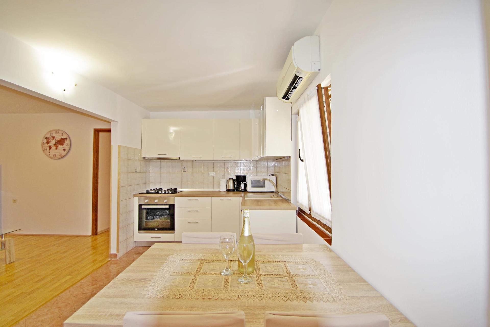 -fully equipped kitchen with dinning table for 4 persons ( 4 rings cooker, 2 gas + 2 electric, refrigerator with freezing section, oven, coffee machine, toaster, cooker hood, microwave and cooking utilities)