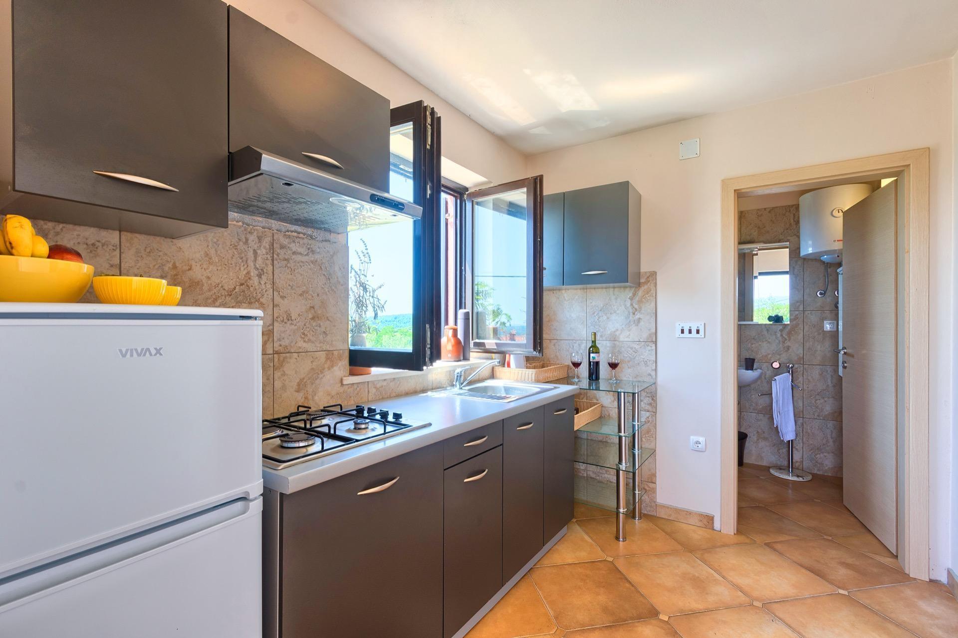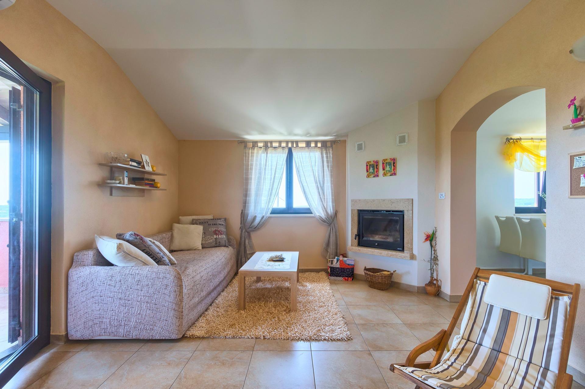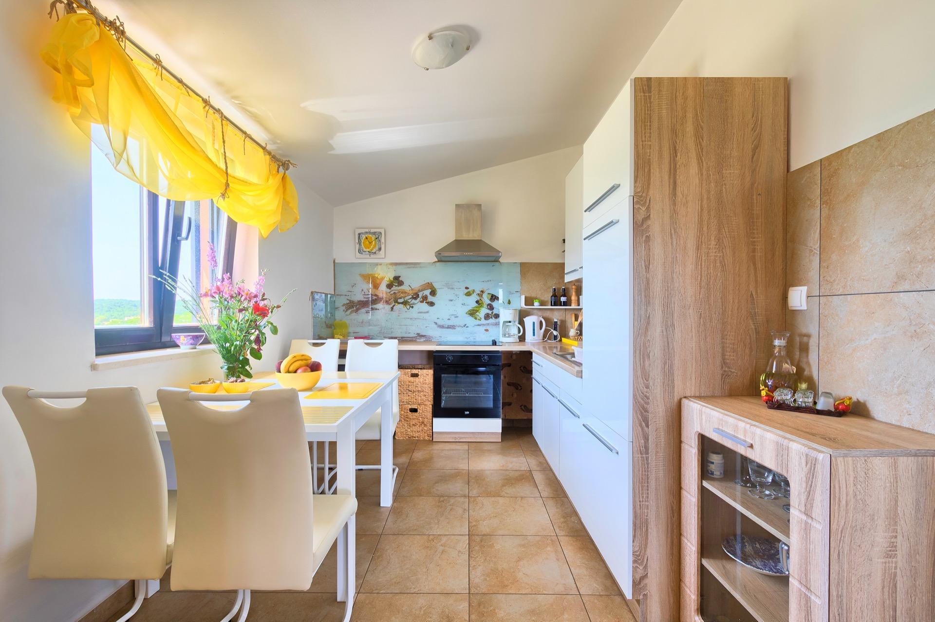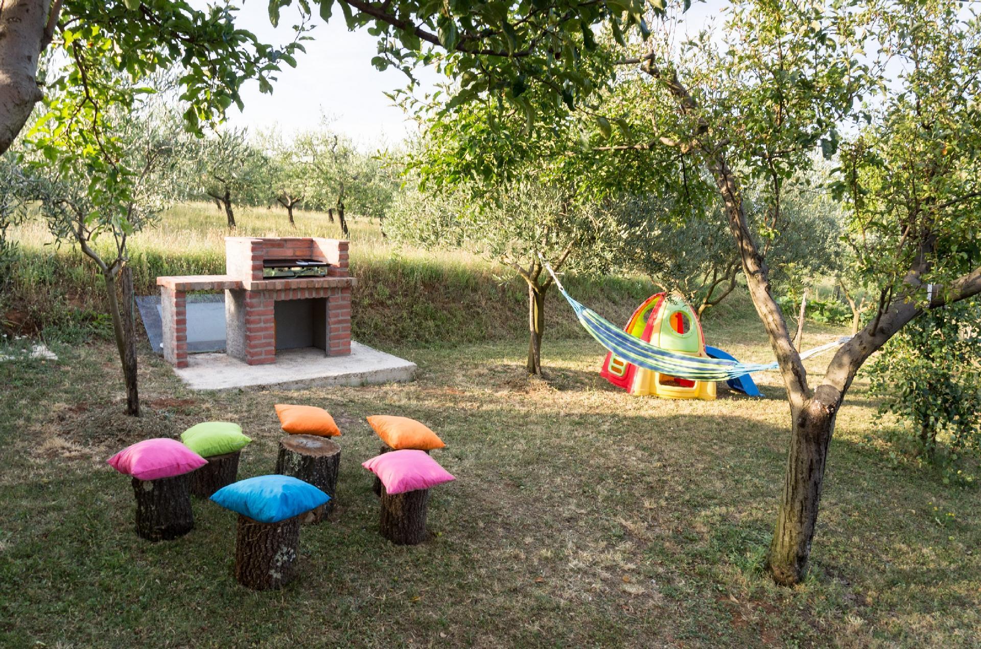 The completely detached three-bedroom house is surrounded by greenery, just outside the village of Sutivanac, only 20 kilometers from the beautiful pebble beaches on the east coast of Istria. The advantageous location allows you to discover a new beach every day or one of the lively coastal towns and to relax after an eventful day in the peace and privacy of your holiday home. Surrounded by green hills, valleys and fragrant Mediterranean plant splendor with vast fields and vineyards, rest for body and soul is guaranteed here. The 1,500 m² plot with olive grove, fruit trees and playground is at your disposal for sole use. And those who would like to be actively involved in the invigorating sea air can find countless hiking and biking trails as well as jogging paths right on their doorstep.