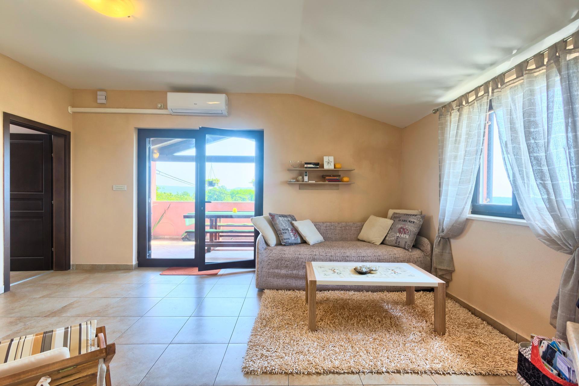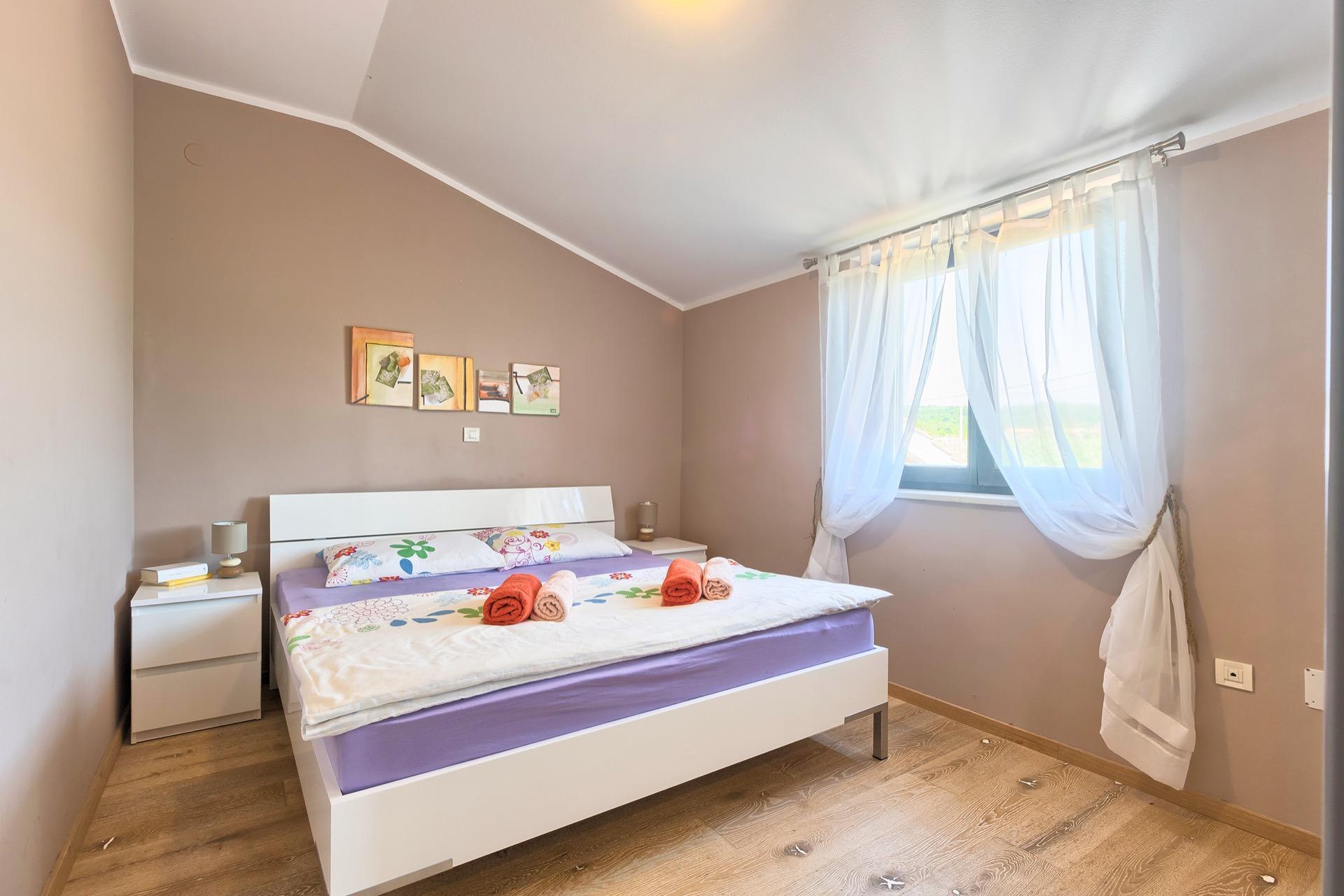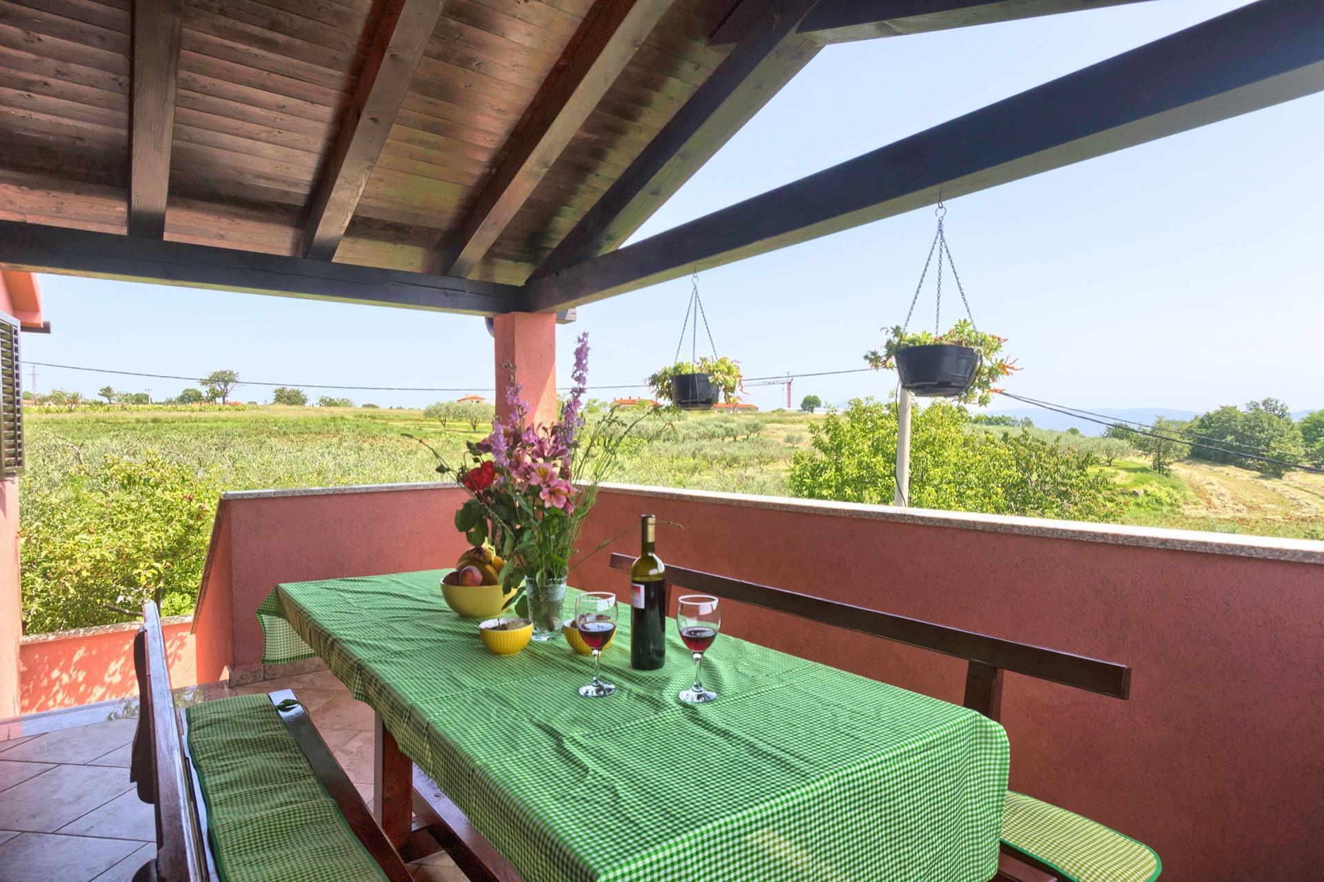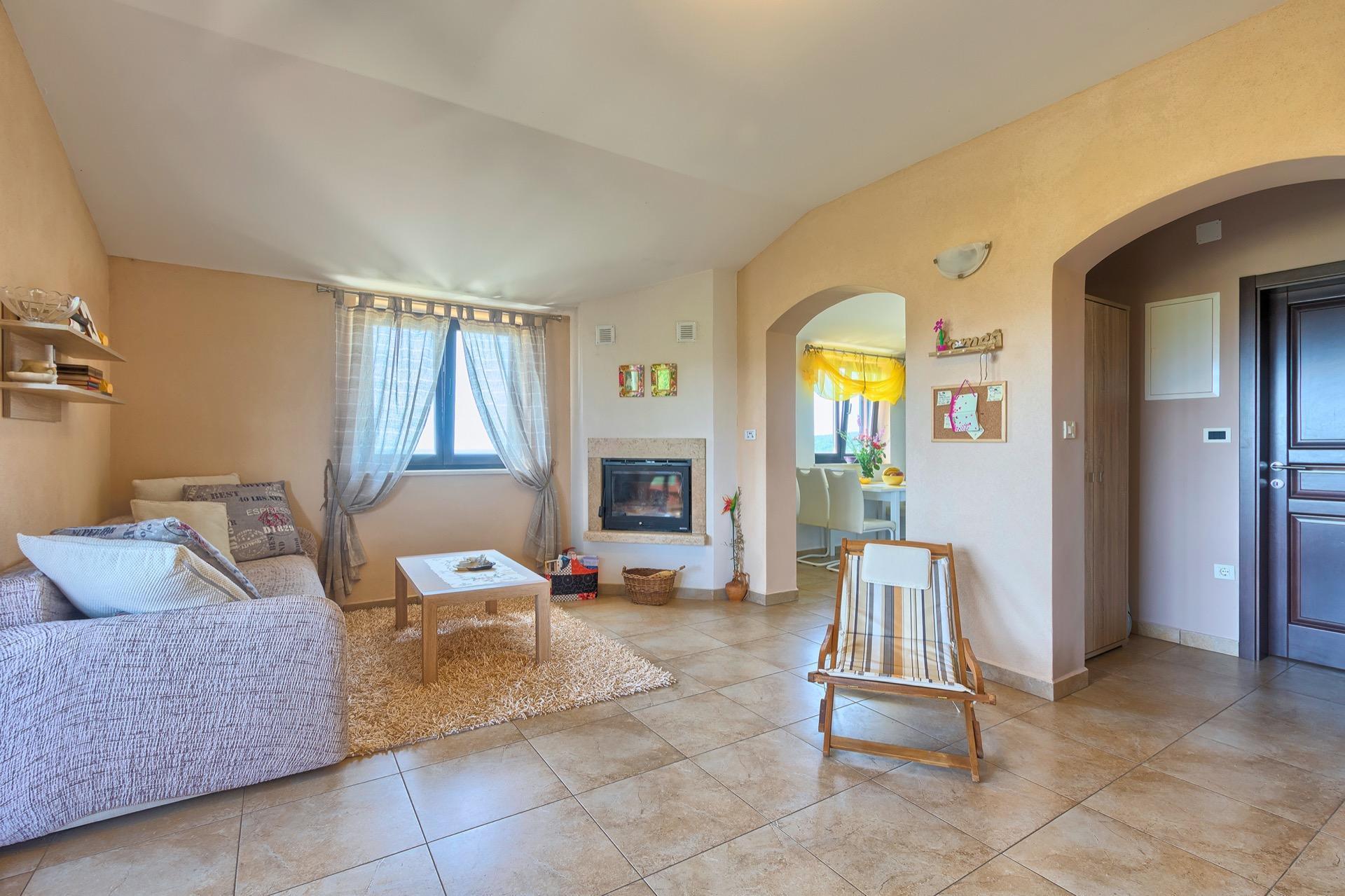 The completely detached three-bedroom house is surrounded by greenery, just outside the village of Sutivanac, only 20 kilometers from the beautiful pebble beaches on the east coast of Istria. The advantageous location allows you to discover a new beach every day or one of the lively coastal towns and to relax after an eventful day in the peace and privacy of your holiday home. Surrounded by green hills, valleys and fragrant Mediterranean plant splendor with vast fields and vineyards, rest for body and soul is guaranteed here. The 1,500 m² plot with olive grove, fruit trees and playground is at your disposal for sole use. And those who would like to be actively involved in the invigorating sea air can find countless hiking and biking trails as well as jogging paths right on their doorstep.