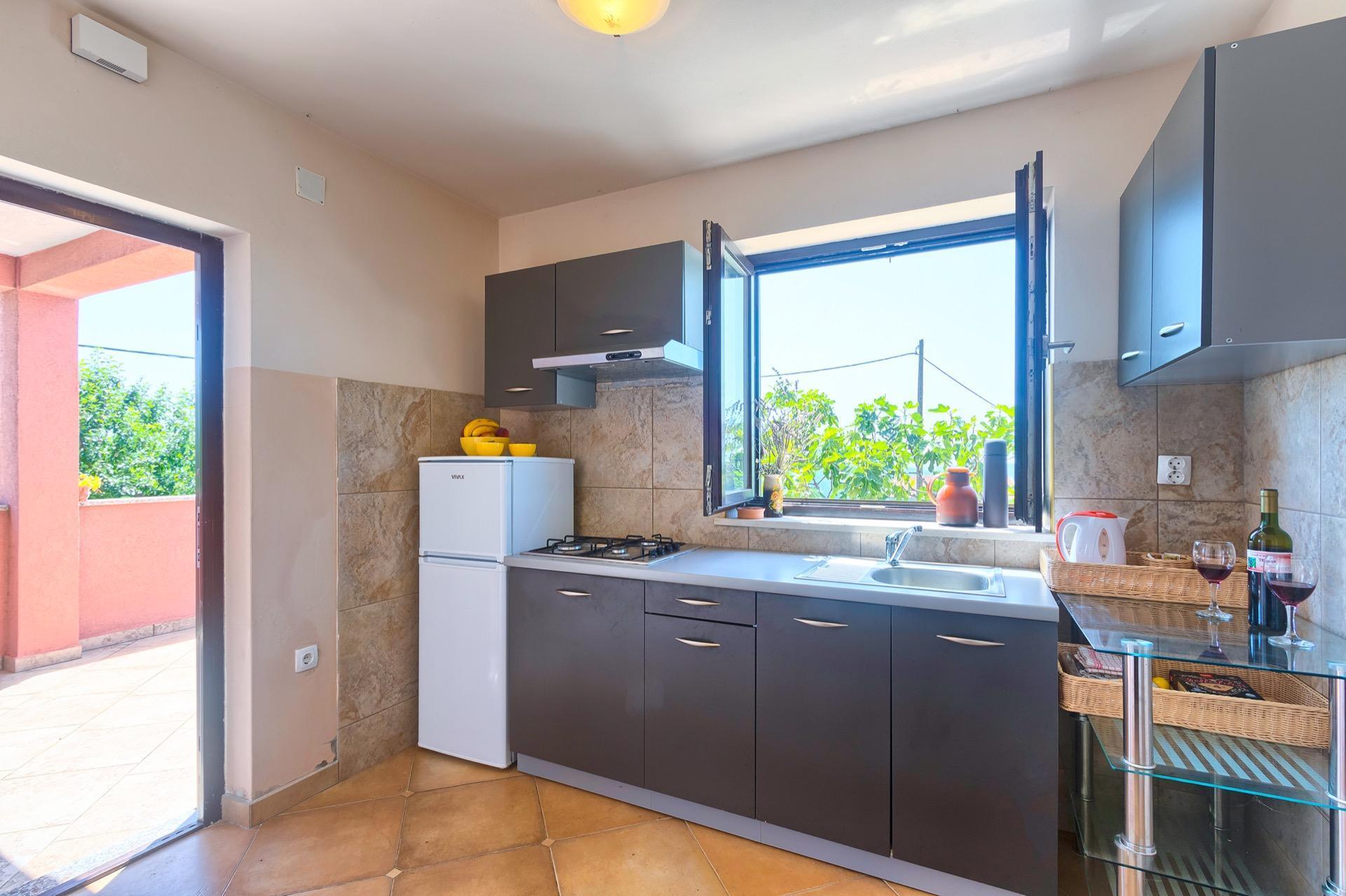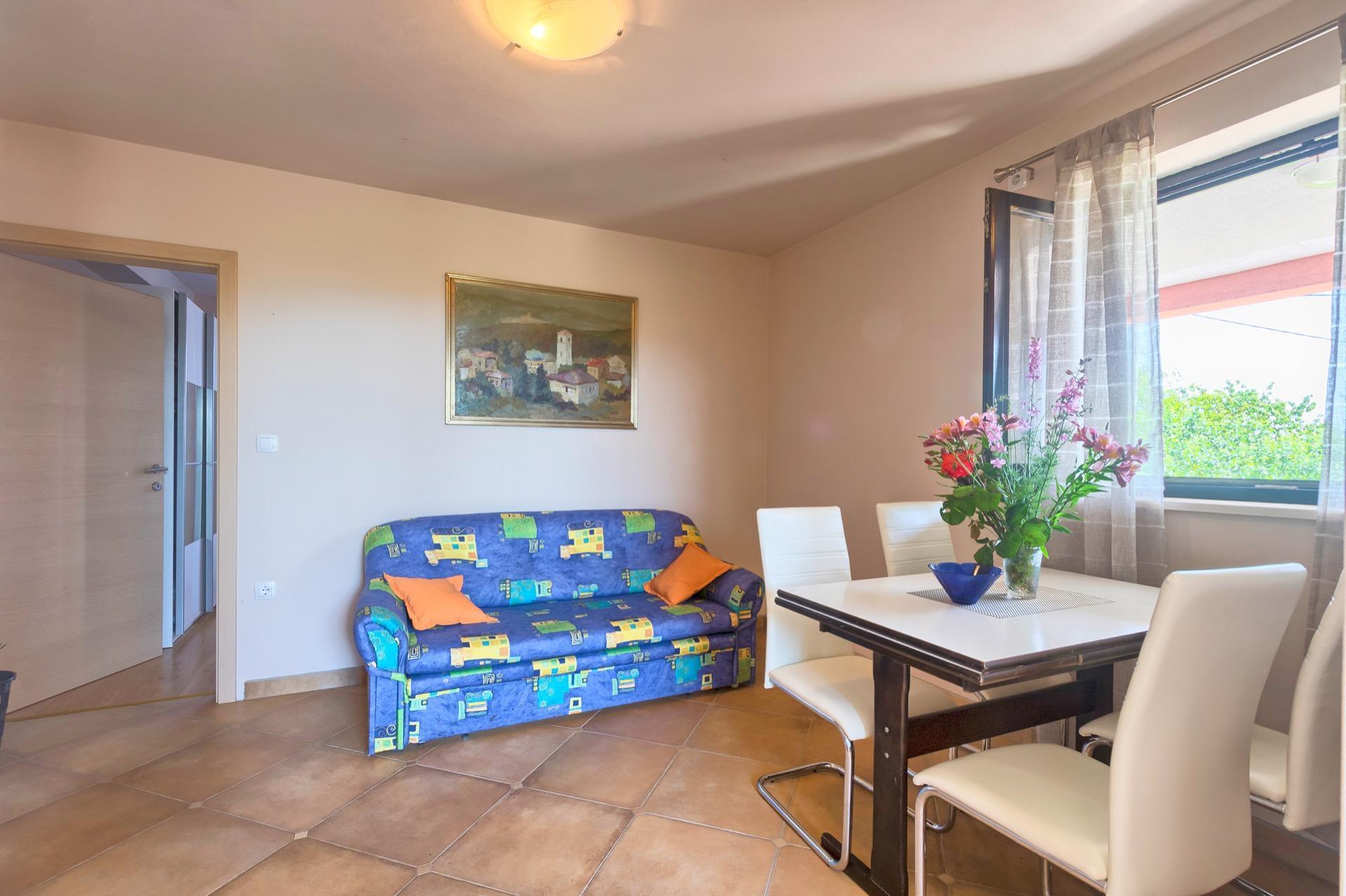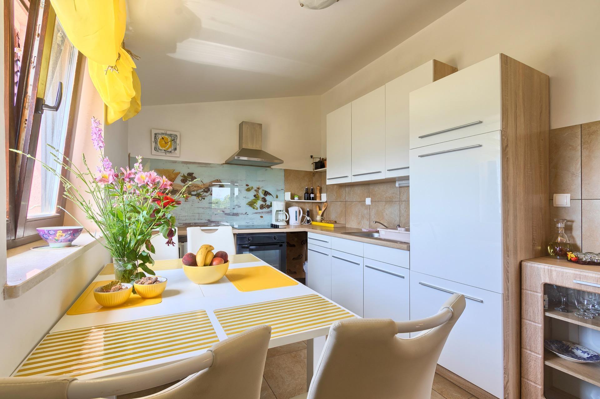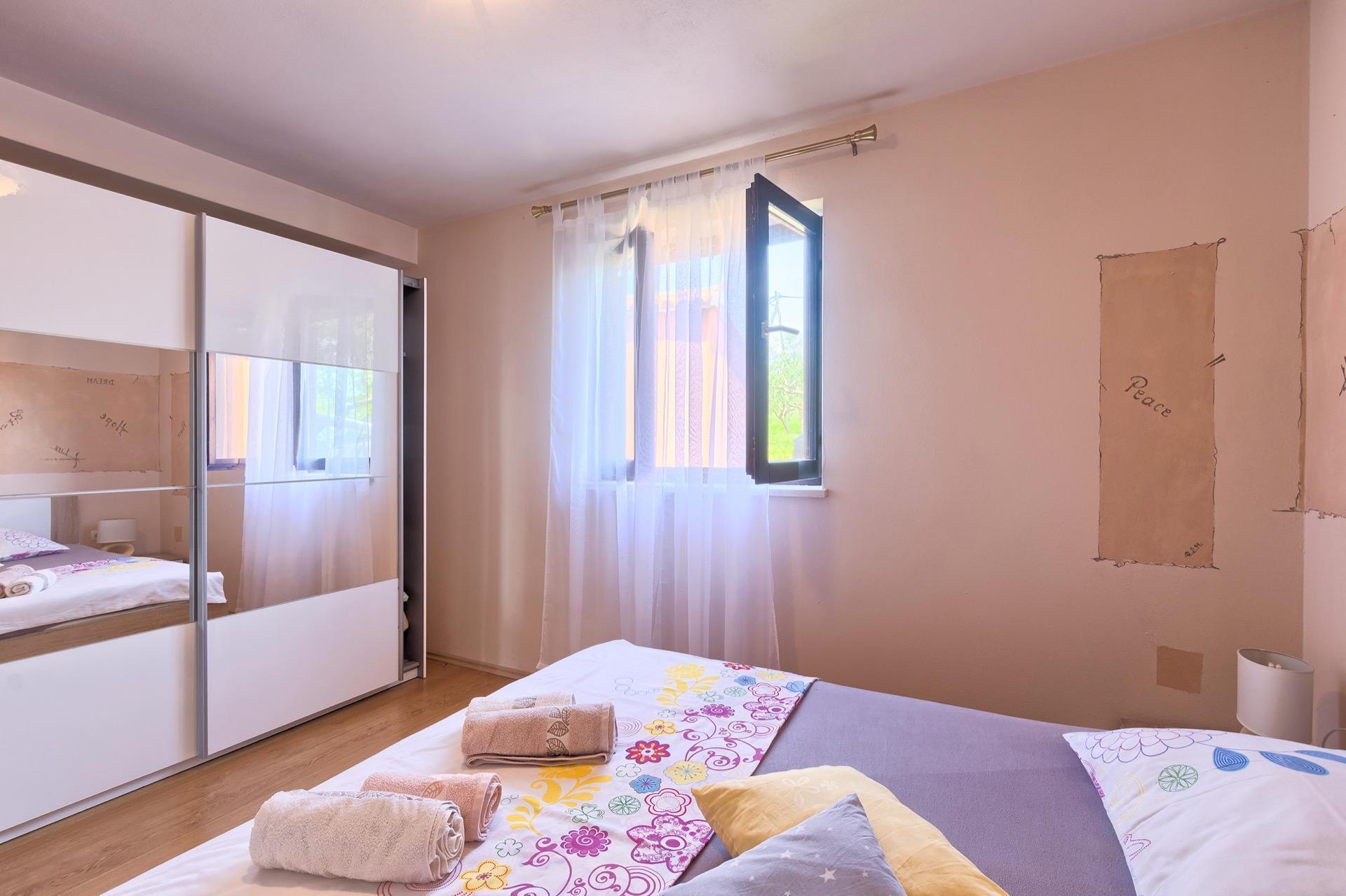 The completely detached three-bedroom house is surrounded by greenery, just outside the village of Sutivanac, only 20 kilometers from the beautiful pebble beaches on the east coast of Istria. The advantageous location allows you to discover a new beach every day or one of the lively coastal towns and to relax after an eventful day in the peace and privacy of your holiday home. Surrounded by green hills, valleys and fragrant Mediterranean plant splendor with vast fields and vineyards, rest for body and soul is guaranteed here. The 1,500 m² plot with olive grove, fruit trees and playground is at your disposal for sole use. And those who would like to be actively involved in the invigorating sea air can find countless hiking and biking trails as well as jogging paths right on their doorstep.