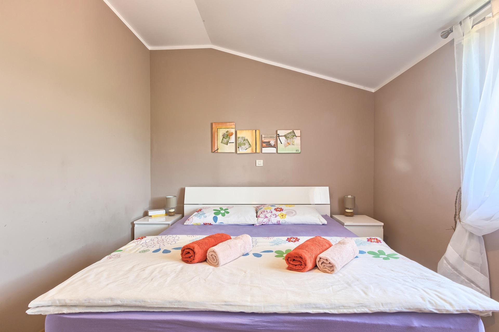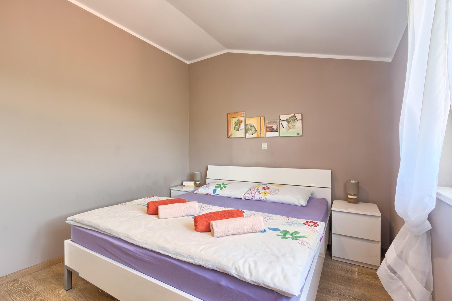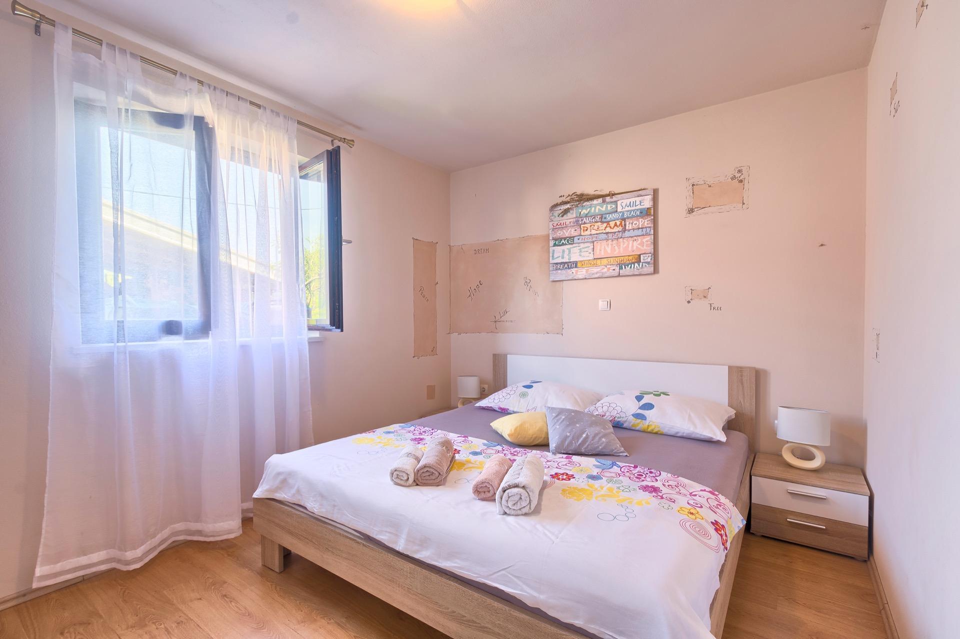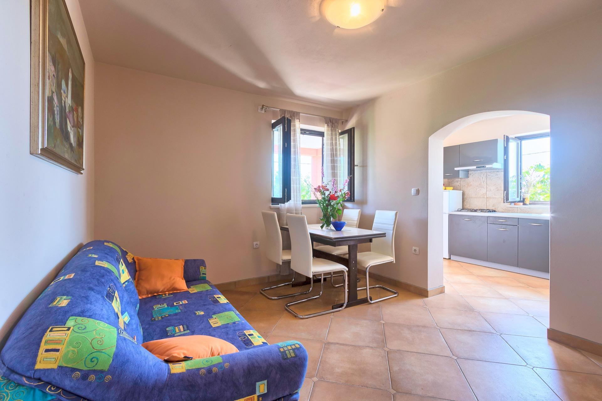 The completely detached three-bedroom house is surrounded by greenery, just outside the village of Sutivanac, only 20 kilometers from the beautiful pebble beaches on the east coast of Istria. The advantageous location allows you to discover a new beach every day or one of the lively coastal towns and to relax after an eventful day in the peace and privacy of your holiday home. Surrounded by green hills, valleys and fragrant Mediterranean plant splendor with vast fields and vineyards, rest for body and soul is guaranteed here. The 1,500 m² plot with olive grove, fruit trees and playground is at your disposal for sole use. And those who would like to be actively involved in the invigorating sea air can find countless hiking and biking trails as well as jogging paths right on their doorstep.
