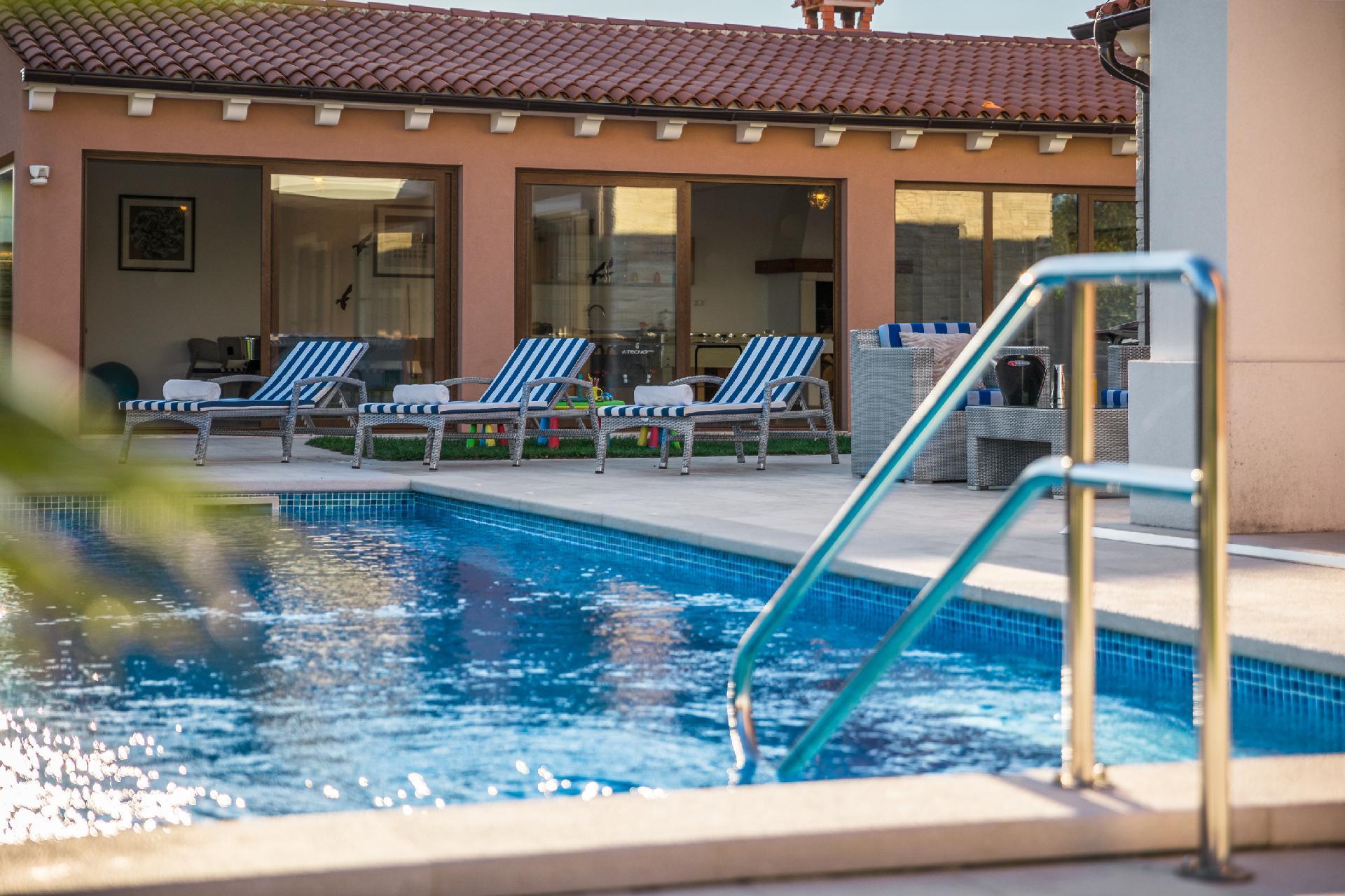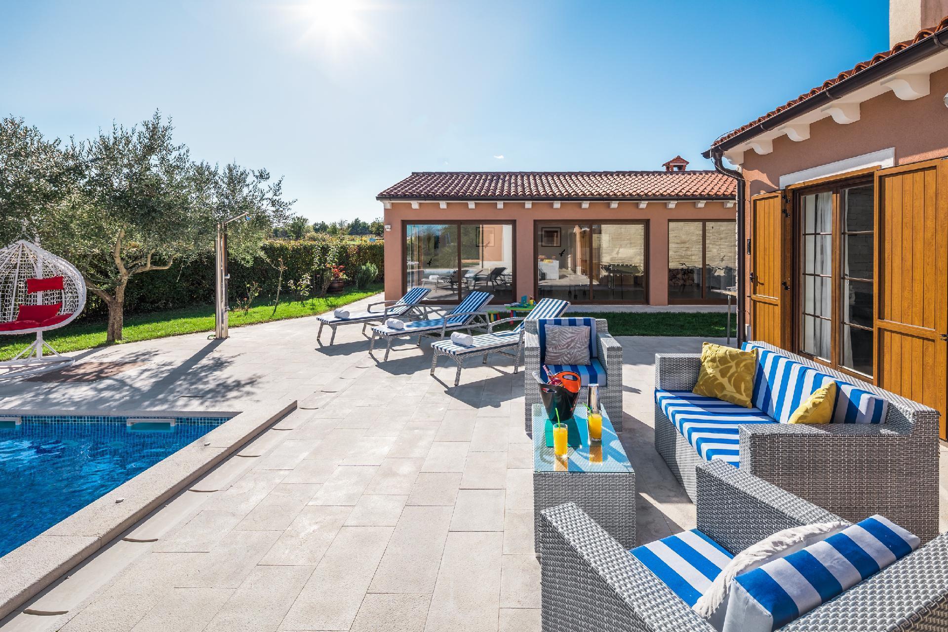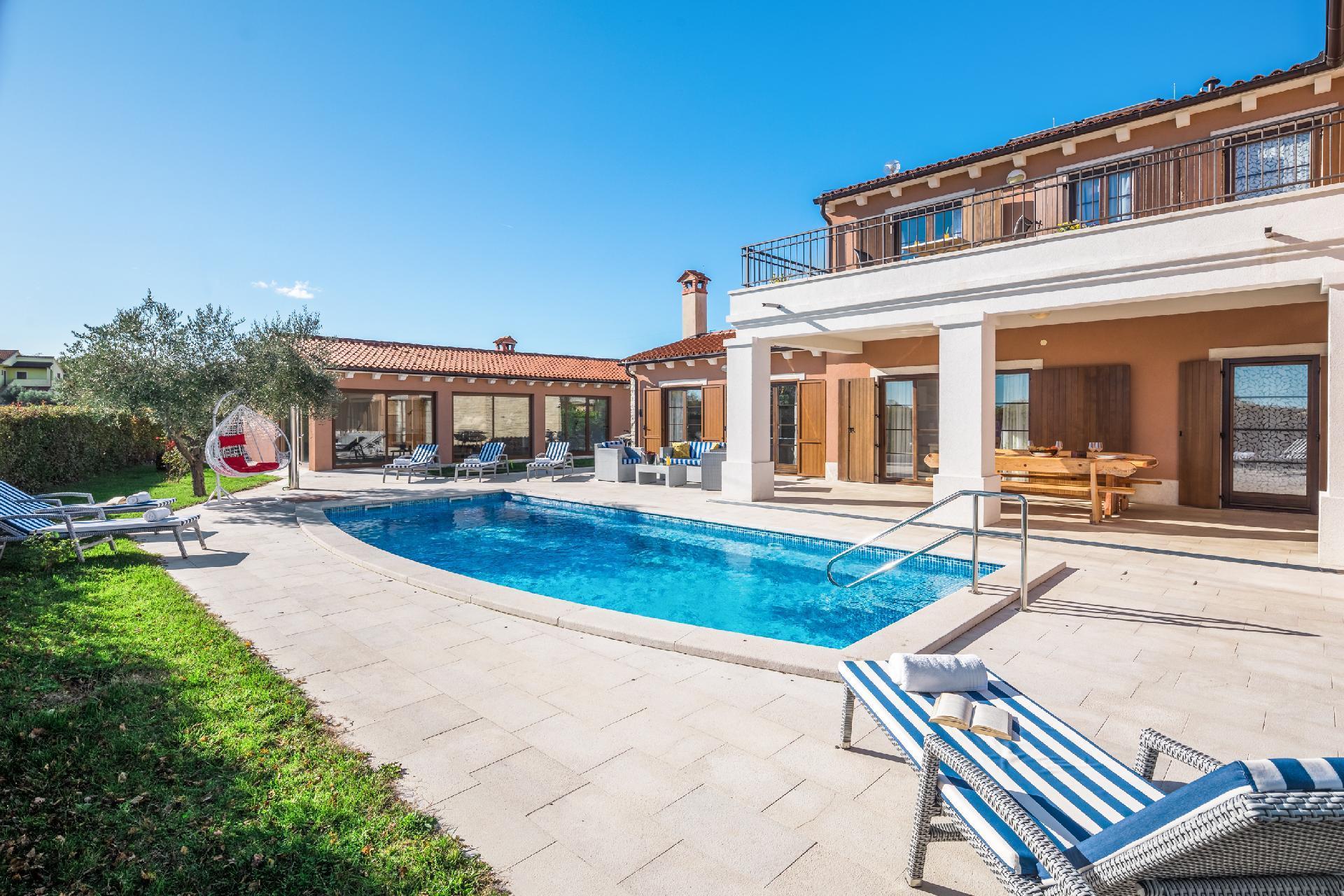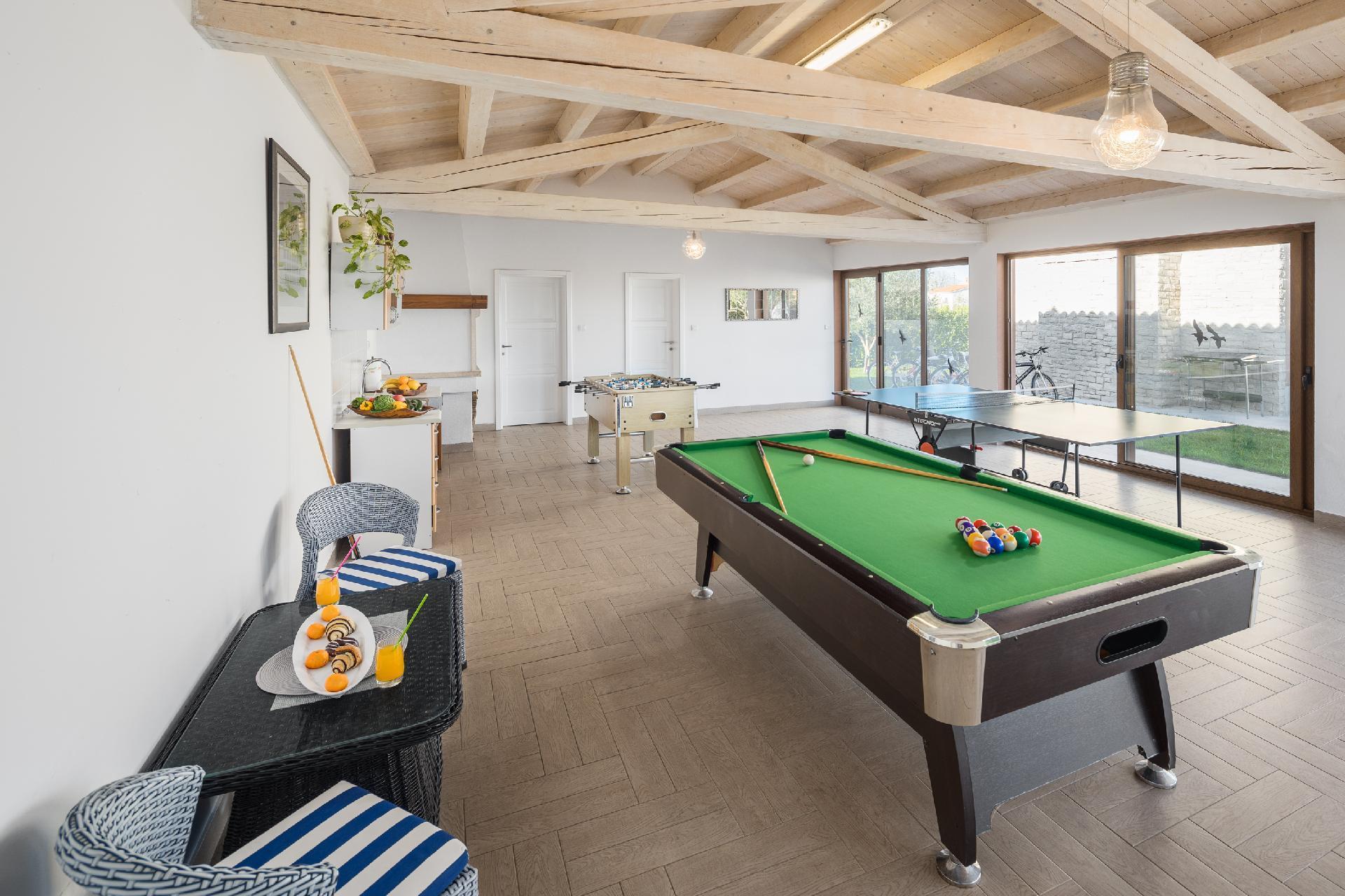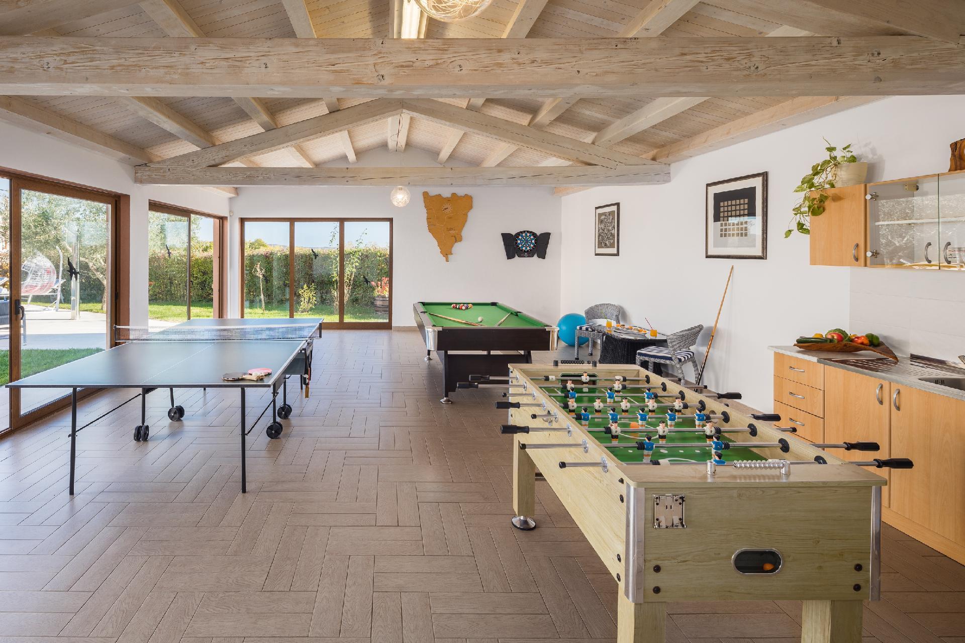 In a small place in the southern part of peninsula Istria you will find a beautiful 5-star villa Kanco (400 m2) with amazing mountain view and picturesque green environment. Villa was designed by art, very talented designer awarded two times in a row by distinguished London prize. Villa consist of four bedrooms, each in other color, and every room has its lounge and her own bathroom. There are also two separated toilets, a big kitchen and living room with a cozy couch. All bedrooms have a living room and LED television. All areas have air condition. Villa is suitable for 10 persons. Vila has also a relaxing room with jacuzzi and sauna. Villa is surrounded with 1000 m2 of green lawn, 50 m2 swimming pool (with massage function) and its stone beach with covered terrace and a big wooden table. Next to it, you will find another smaller building (100 m2) – game room with table tennis, table football, billiard, Picado and also an inner grill. On the outside there is also an exterior grill. In the backyard there is entertainment for children; swing, toboggan, trampoline, all surrounded with olives, owers and green fence. The villa has three parking places.
