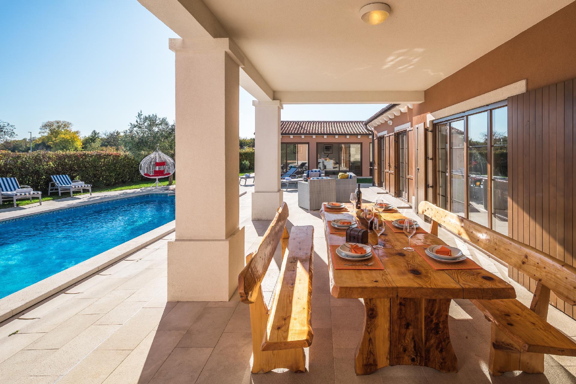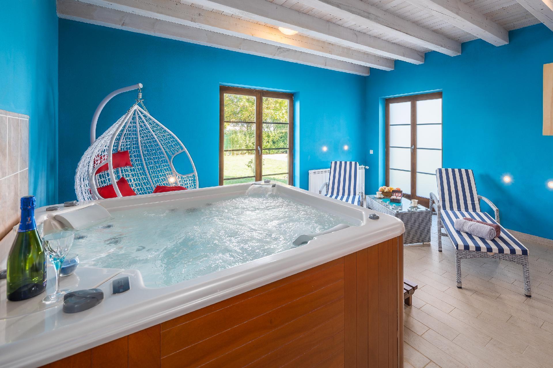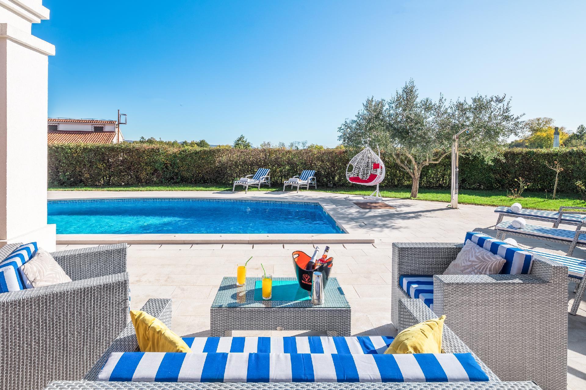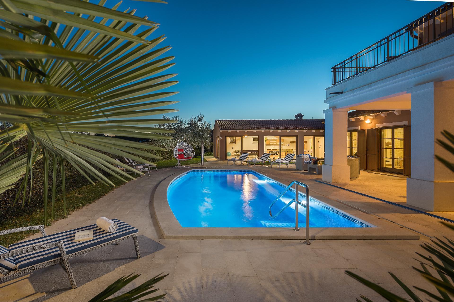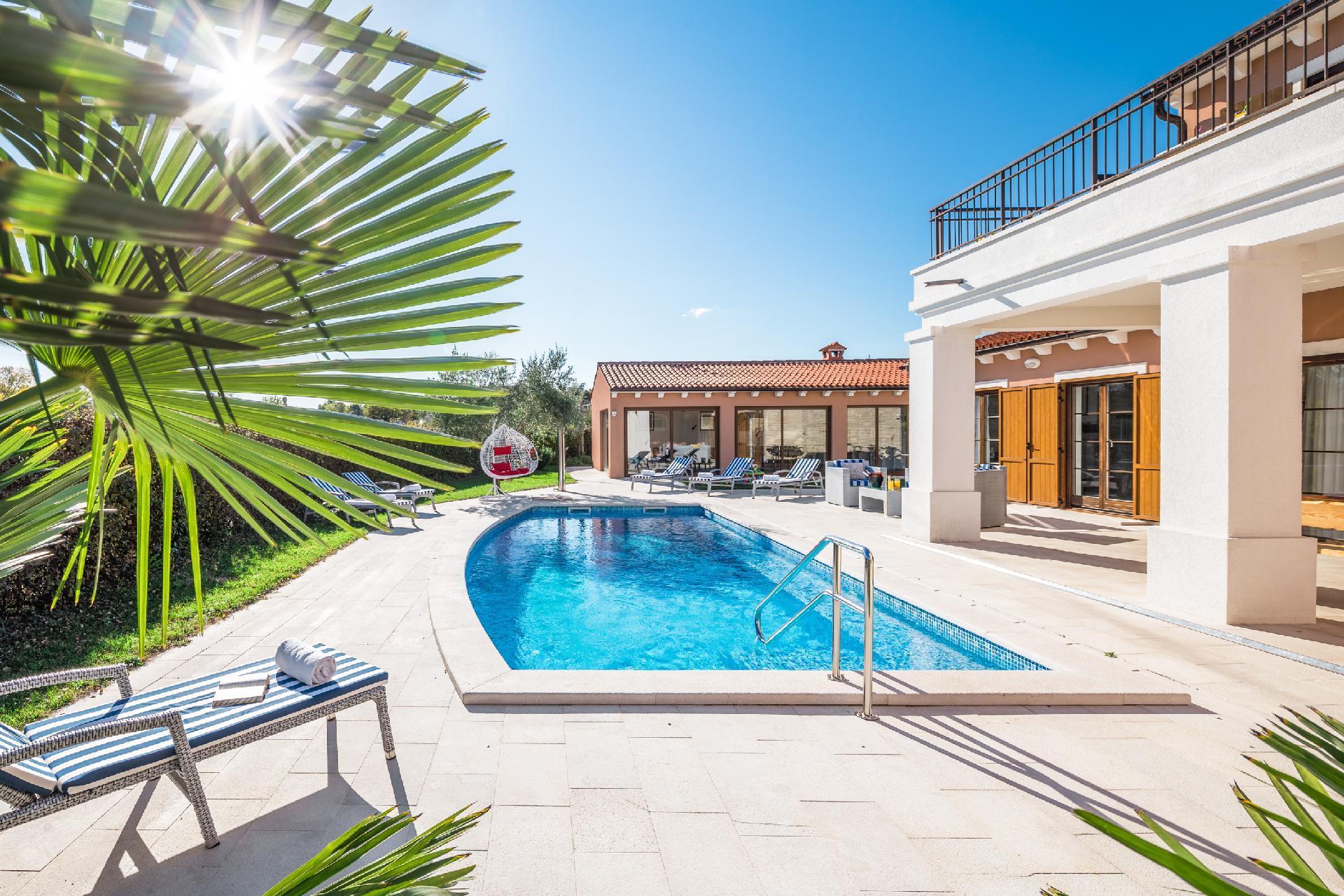 In a small place in the southern part of peninsula Istria you will find a beautiful 5-star villa Kanco (400 m2) with amazing mountain view and picturesque green environment. Villa was designed by art, very talented designer awarded two times in a row by distinguished London prize. Villa consist of four bedrooms, each in other color, and every room has its lounge and her own bathroom. There are also two separated toilets, a big kitchen and living room with a cozy couch. All bedrooms have a living room and LED television. All areas have air condition. Villa is suitable for 10 persons. Vila has also a relaxing room with jacuzzi and sauna. Villa is surrounded with 1000 m2 of green lawn, 50 m2 swimming pool (with massage function) and its stone beach with covered terrace and a big wooden table. Next to it, you will find another smaller building (100 m2) – game room with table tennis, table football, billiard, Picado and also an inner grill. On the outside there is also an exterior grill. In the backyard there is entertainment for children; swing, toboggan, trampoline, all surrounded with olives, owers and green fence. The villa has three parking places.