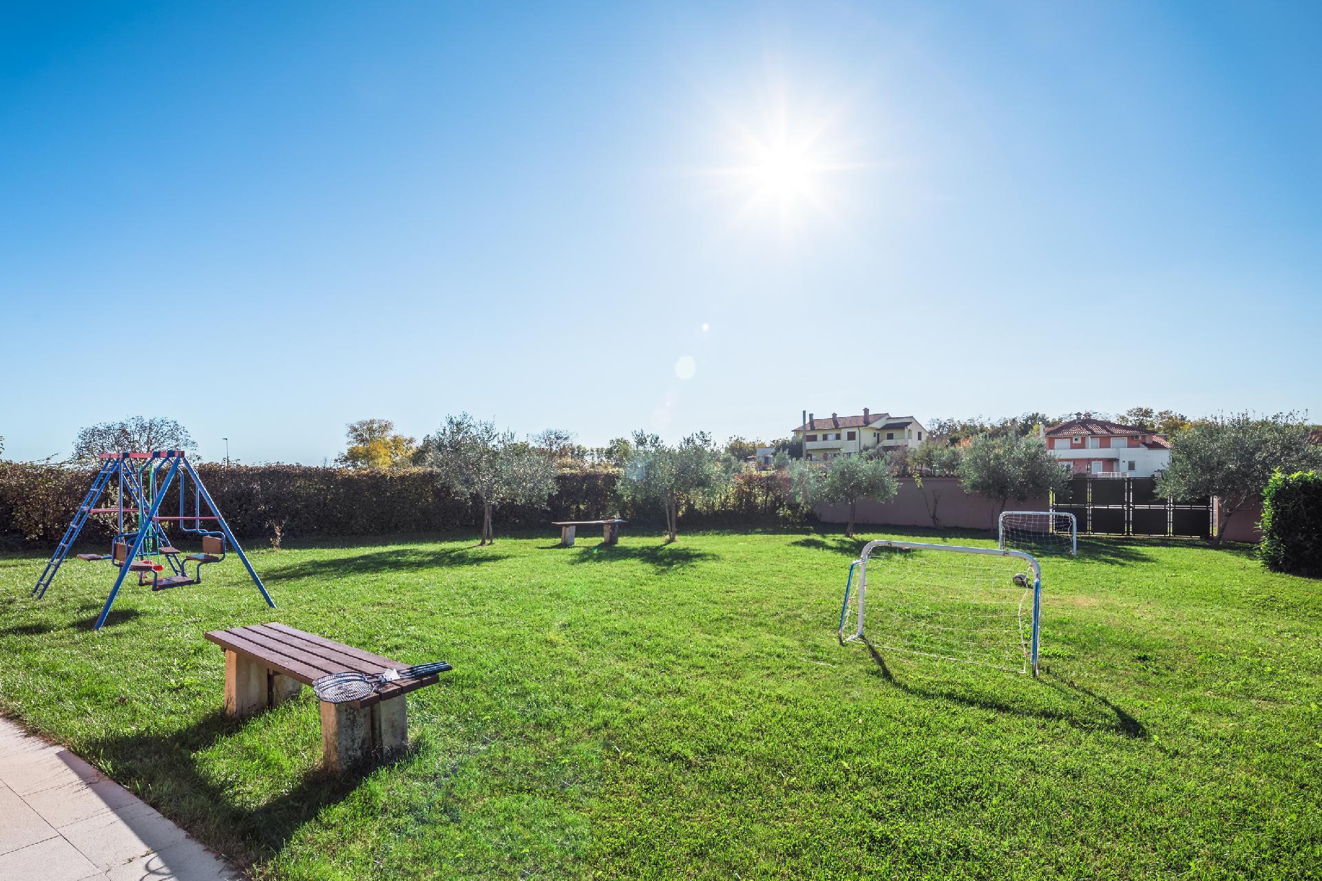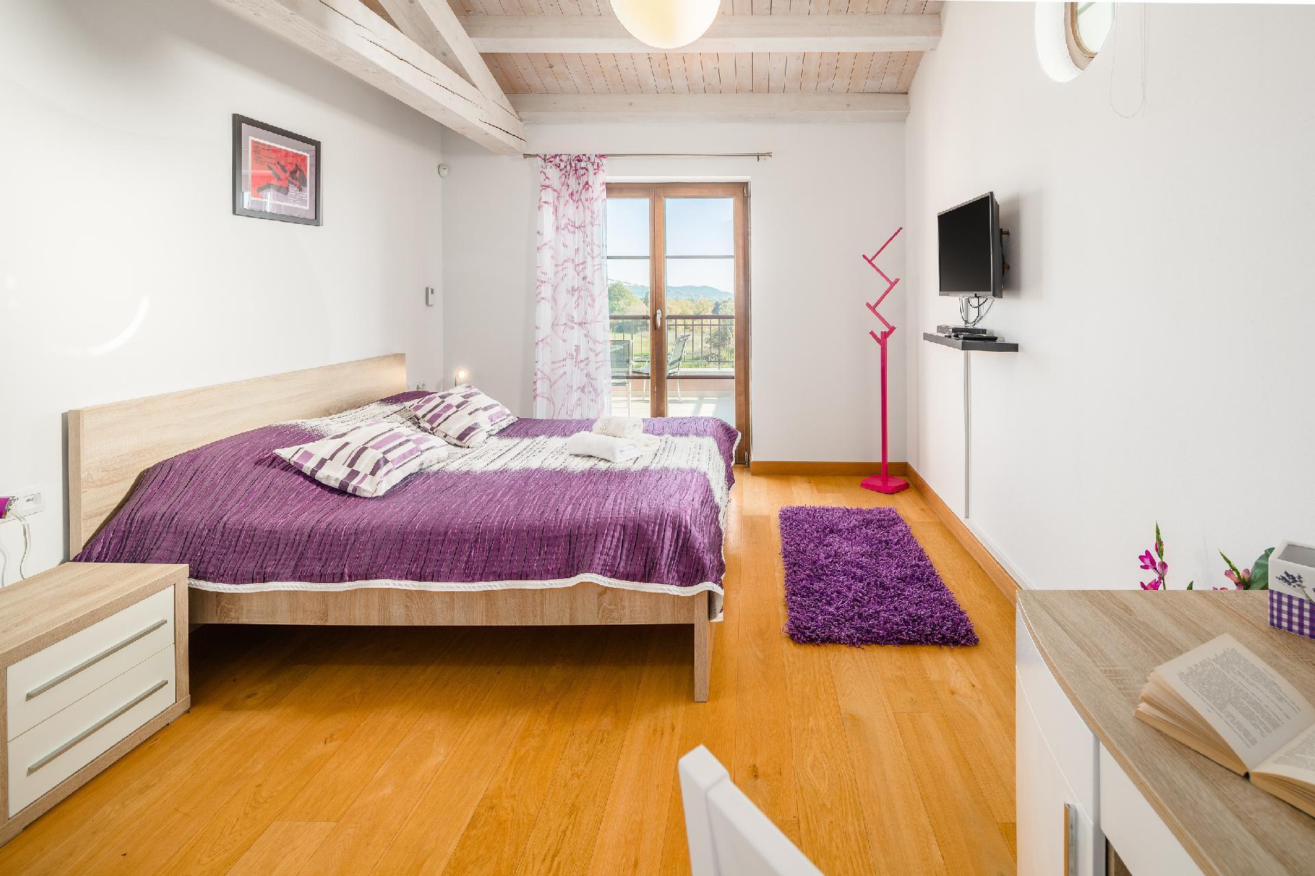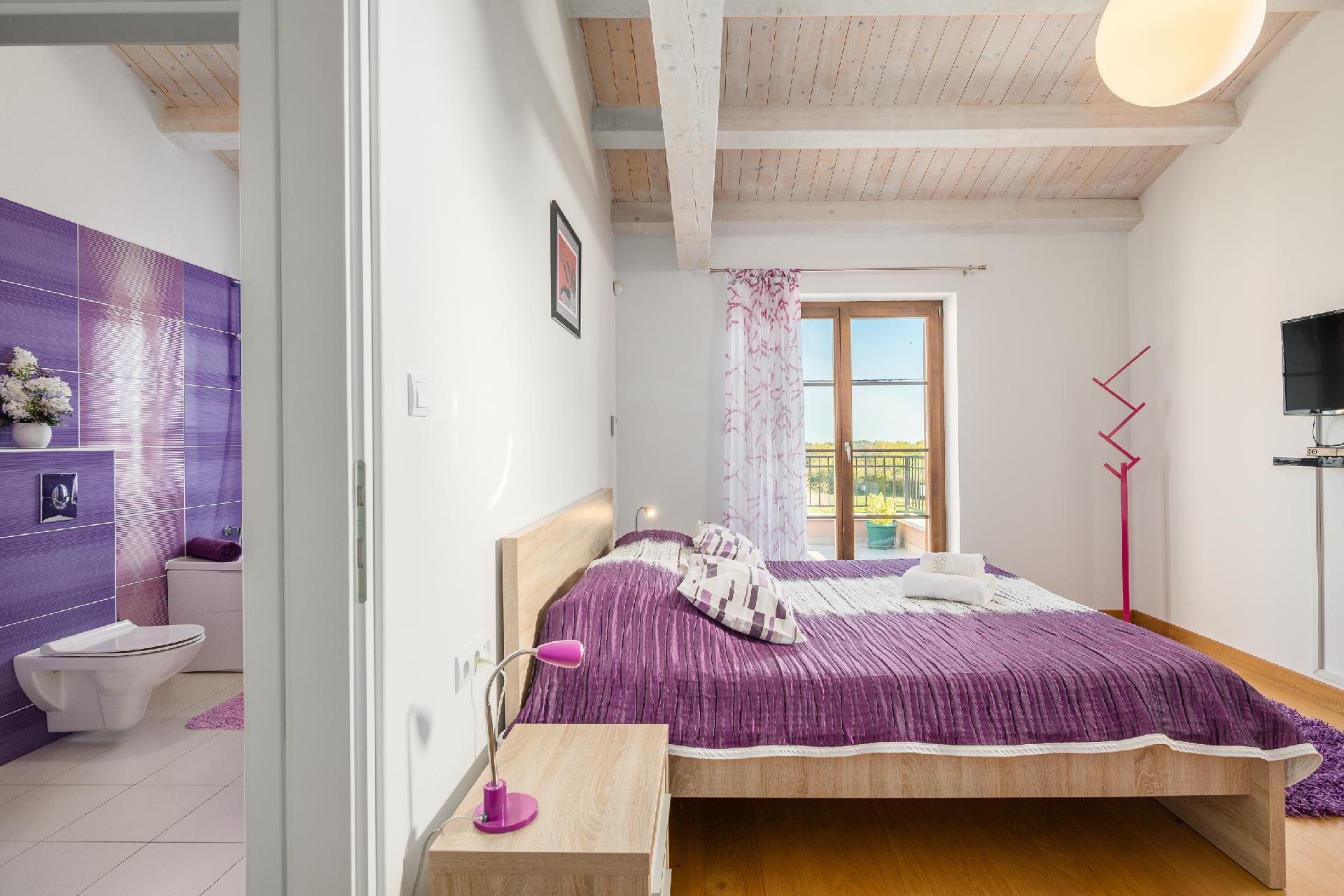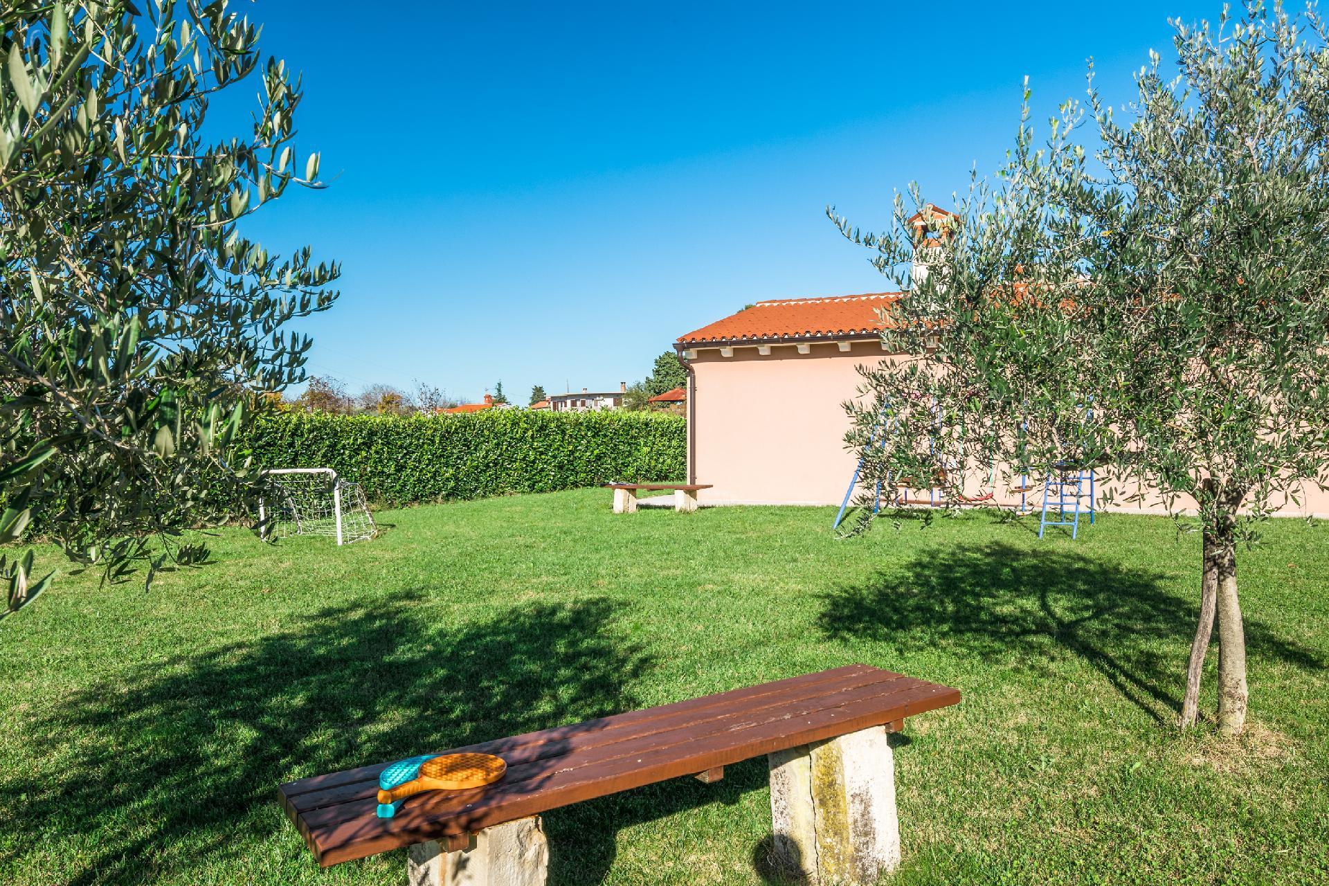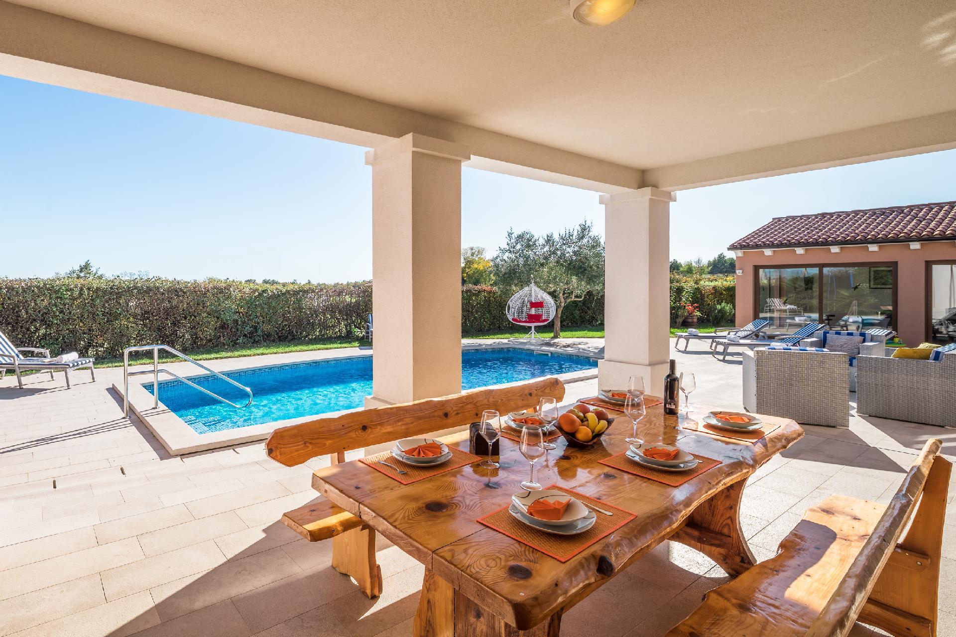 In a small place in the southern part of peninsula Istria you will find a beautiful 5-star villa Kanco (400 m2) with amazing mountain view and picturesque green environment. Villa was designed by art, very talented designer awarded two times in a row by distinguished London prize. Villa consist of four bedrooms, each in other color, and every room has its lounge and her own bathroom. There are also two separated toilets, a big kitchen and living room with a cozy couch. All bedrooms have a living room and LED television. All areas have air condition. Villa is suitable for 10 persons. Vila has also a relaxing room with jacuzzi and sauna. Villa is surrounded with 1000 m2 of green lawn, 50 m2 swimming pool (with massage function) and its stone beach with covered terrace and a big wooden table. Next to it, you will find another smaller building (100 m2) – game room with table tennis, table football, billiard, Picado and also an inner grill. On the outside there is also an exterior grill. In the backyard there is entertainment for children; swing, toboggan, trampoline, all surrounded with olives, owers and green fence. The villa has three parking places.