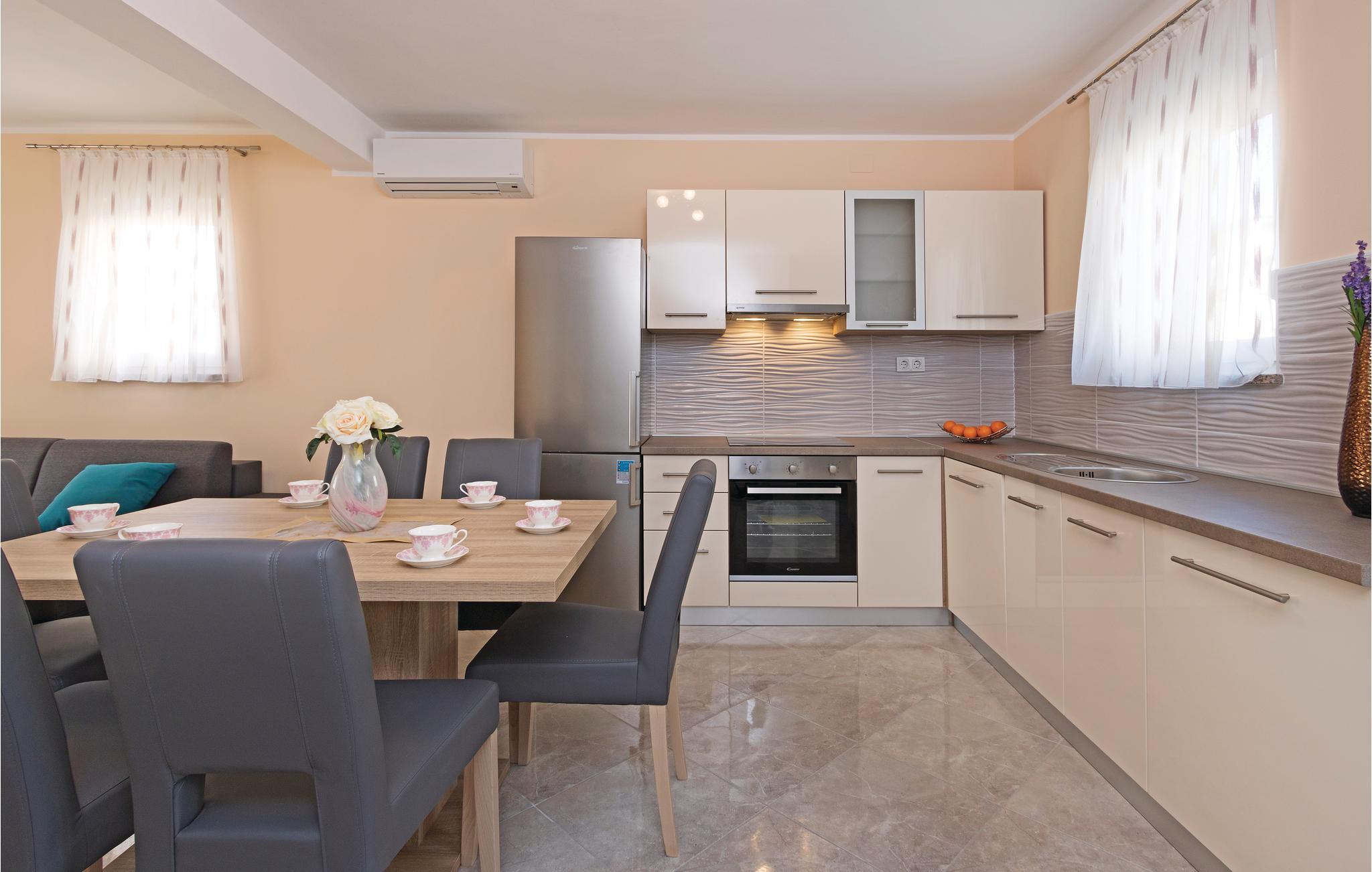 In der kleinen istrischen Siedlung Betiga, nahe Barbariga, befindet sich dieses moderne Ferienhaus mit Pool. Es besteht aus zwei separaten Wohneinheiten, die jeweils im Erdgeschoss über ein Wohnzimmer mit Küche und Essbereich sowie über eine Zusatztoilette verfügen, während im Obergeschoss zwei Schlafzimmer mit dazugehörigen Badezimmern und Terrassen mit Meerblick sind. Genießen Sie die Erfrischung von der Sommerhitze im Pool oder entspannen Sie mit einem guten Buch auf der Terrasse. In den nahe gelegenen Restaurants werden lokale Spezialitäten und hausgemachte Weine angeboten. Die letzten ca. 100 m zum Haus führen über eine nicht asphaltierte Straße.