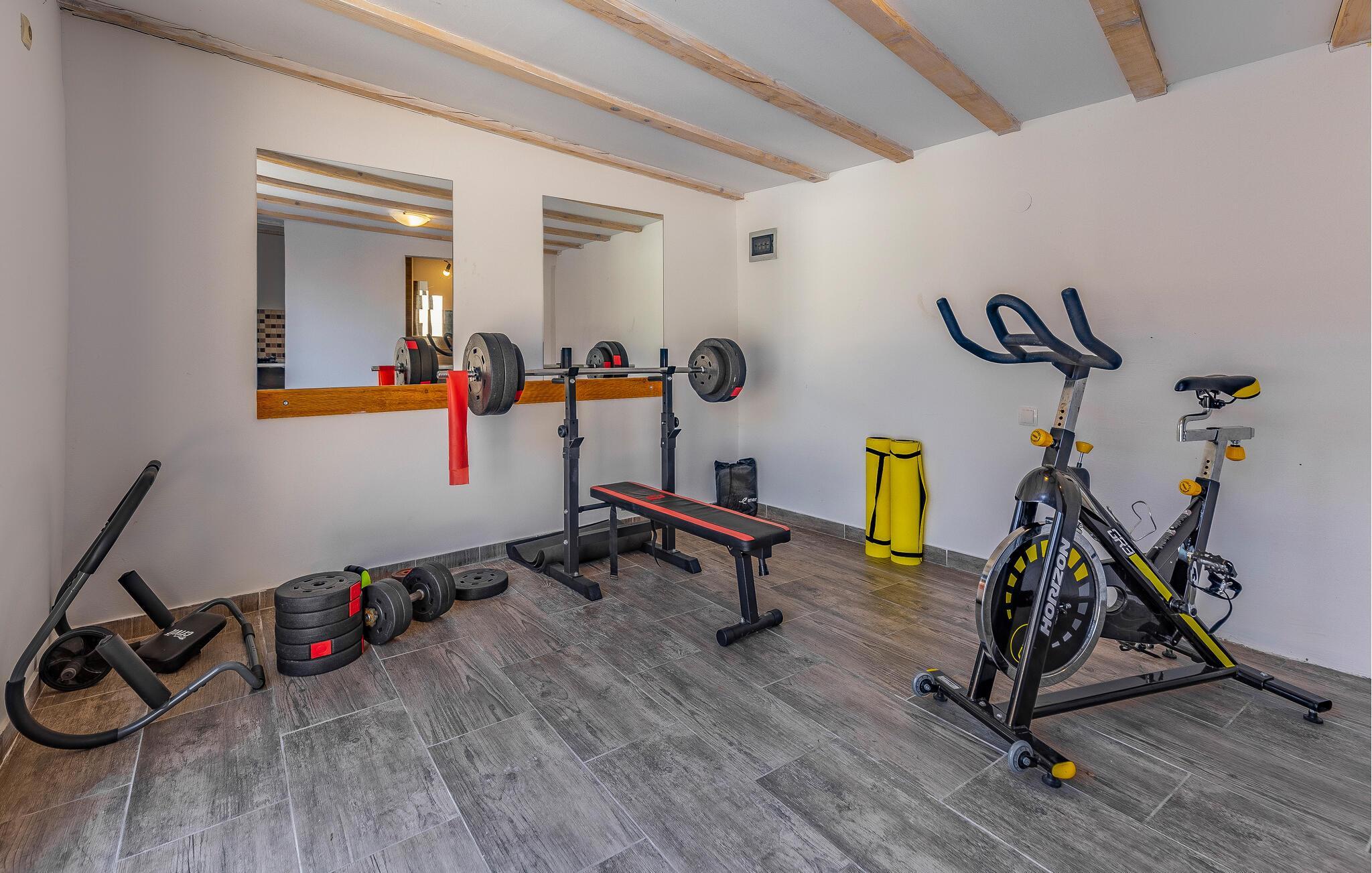 Die überdachte Terrasse ist ideal für Geselligkeit am Pool, wo Sie sich entspannen und die Sonne genießen können. Auf der Terrasse befindet sich auch ein Grill, sodass entspannten Grillabenden nichts im Wege steht. Neben dem Pool gibt es eine separate Anlage mit Bad und Waschmaschine sowie Trainingsgeräten. Für Aktive gibt es auch eine Tischtennisplatte.