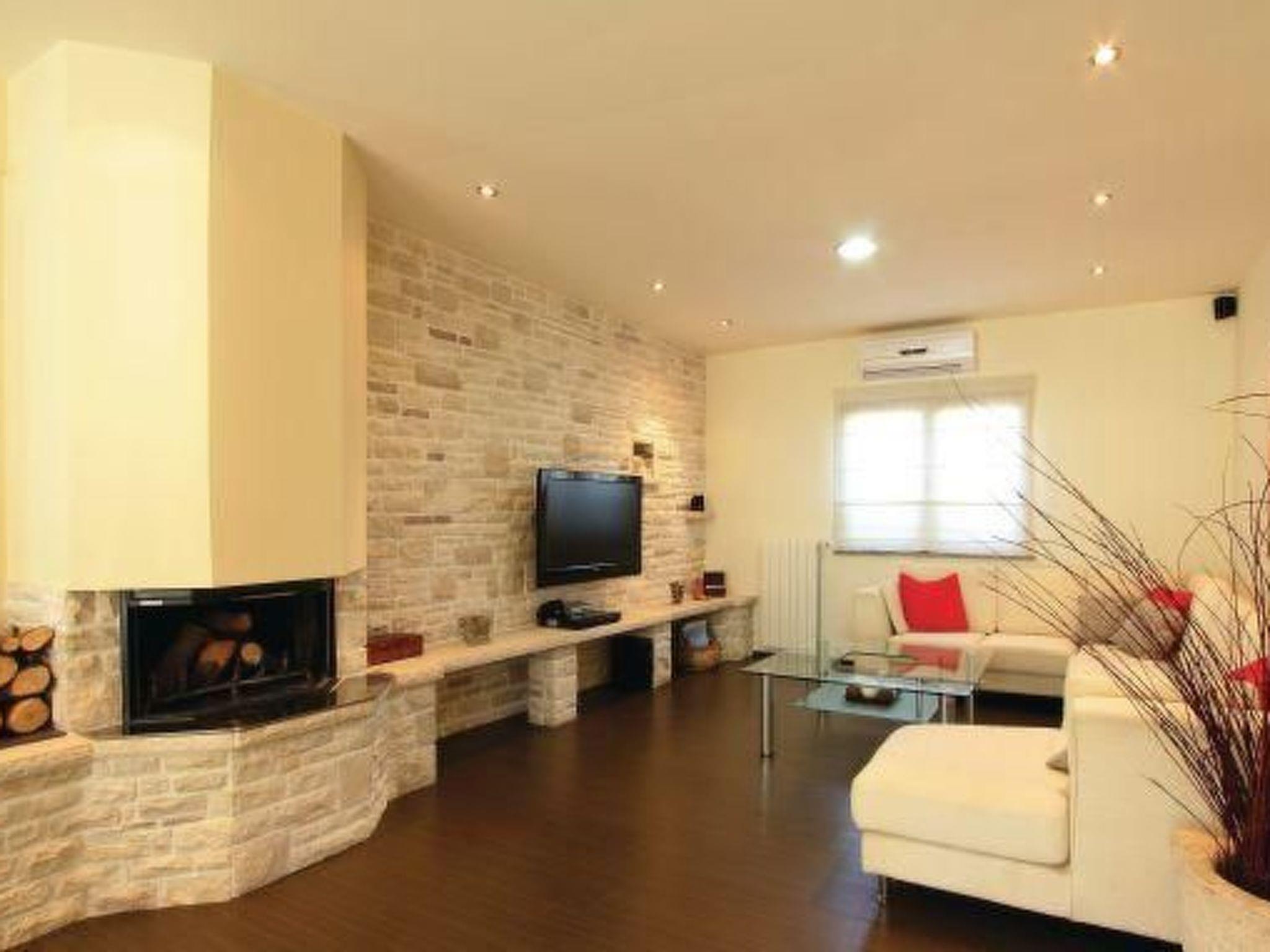 The villa combines modern architecture with traditional Istrian style, which gives the interior a unique charm. There are four bedrooms, of which three have a double bed (180 x 200cm) and one has two single beds (90 x 200cm). Two further supplementary beds (80 x 190cm) and two cots can also be set up if required. All the bedrooms have central air conditioning and heating. Each bedroom has its own bathroom with a shower. The fifth bathroom even has a bath with a whirlpool function. The generous, light living room is furnished with a comfortable, white corner sofa. You can enjoy relaxing hours here in front of the fireplace or watch TV on the flatscreen TV with digital and satellite TV and a DVD player. There is an adjoining dining space with a big glass table and matching, modern chairs for eight people. From here you can see the kitchen counter, where two people can sit on bar stools. The kitchen in a contemporary and modern mocha colour tone is equipped with everything you need, such as a dishwasher, high oven, microwave, kettle and coffee machine. The whole house has wireless Internet access.