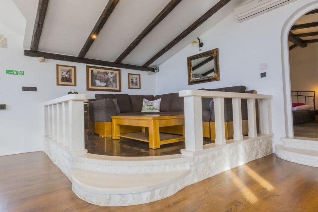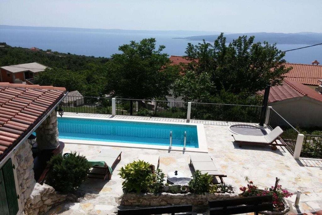 Villa Luma, located above the town of Baska Voda in the village of Bast, is exclusive and exceptional. This comfortable villa boasts an impressive location, nestled in a terraced hillside, offering stunning views of the Adriatic Sea. The villa is the ideal base for those who enjoy secluded living but still don't want to miss out on the sea view. And from here, it's unparalleled. In the town of Baška Voda, not far from the villa, the owner offers half-board in his own restaurant at a reasonable price. The Mediterranean-style living area with fireplace and elegant interior design immediately catch the eye. The well-maintained and beautiful terrace with swimming pool invites you to spend time together as a family. Children can splash around in the pool while you enjoy an unforgettable sunset with local delicacies. A museum-like tavern, furnished with many old Dalmatian items and decor, is also available and will conjure up a piece of Dalmatian history for you. You can also park worry-free throughout Baška Voda, with free parking available, which is of course included. The holiday home is equipped with three double bedrooms, two single beds, and a sofa bed.