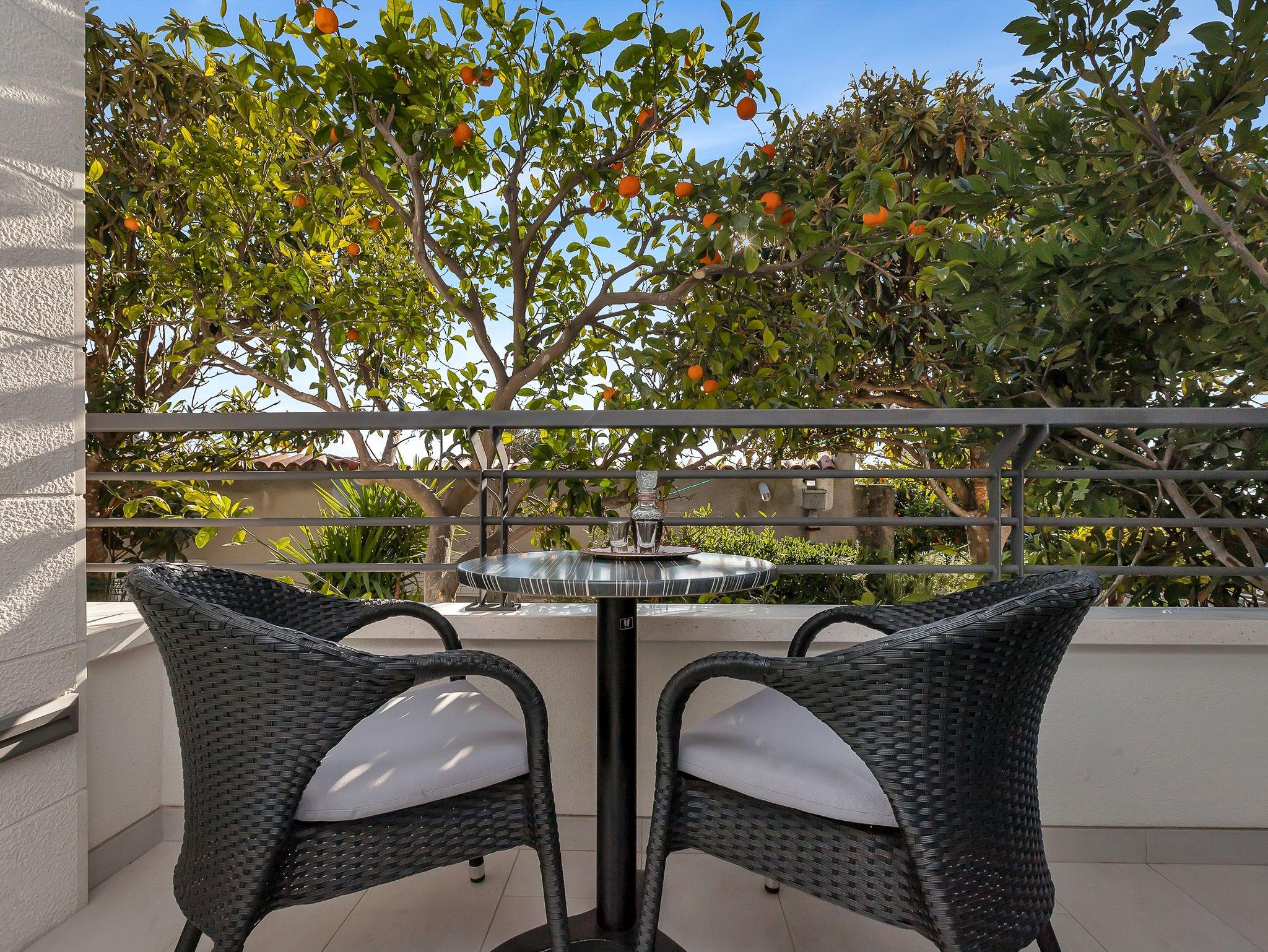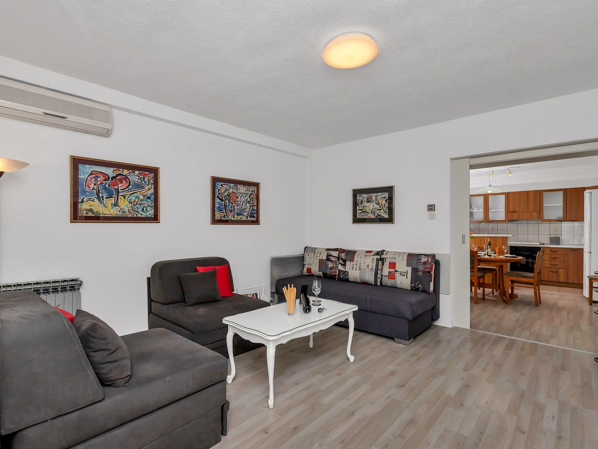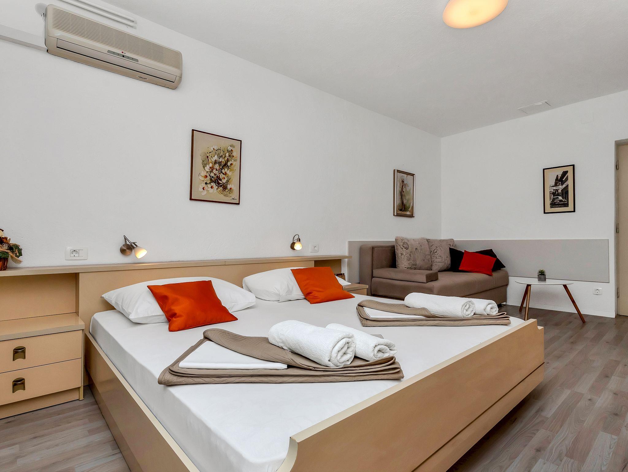 Ferienwohnung bietet Platz für 4 Gäste. Die Betten sind in Schlafzimmern, die es 1 gibt, und in Wohnzimmer, innerhalb einer Gesamtfläche von 70m2, angeordnet. Die Gäste haben eine eigene Terrasse zur Verfügung, auf der sie in warmen Sommernächten genießen können. Das Apartment bietet Meerblick. Es ist erlaubt, Speisen auf dem Gemeinschafts-Grill vorzubereiten. IM PREIS INBEGRIFFEN: Kurtaxe, Endreinigung, Klimatisierung, Zentralheizung, Parkplatz, Internet, Wäschewaschen, Kinderbett, Bügeleisen, Bügelbrett, Föhn, 1 Bett für Kinder (im Preis enthalten). Die Verfügbarkeit zusätzlicher Dienstleistungen in Ihrem reservierten Termin und die Preise derselben (falls nicht aufgeführt) müssen im Voraus überprüft werden. Zusätzliche Dienstleistungen die in der Zahlungsaufforderung nicht aufgeführt sind werden direkt beim Vermieter bezahlt, angenommen der Gast nutzt auch diese.
