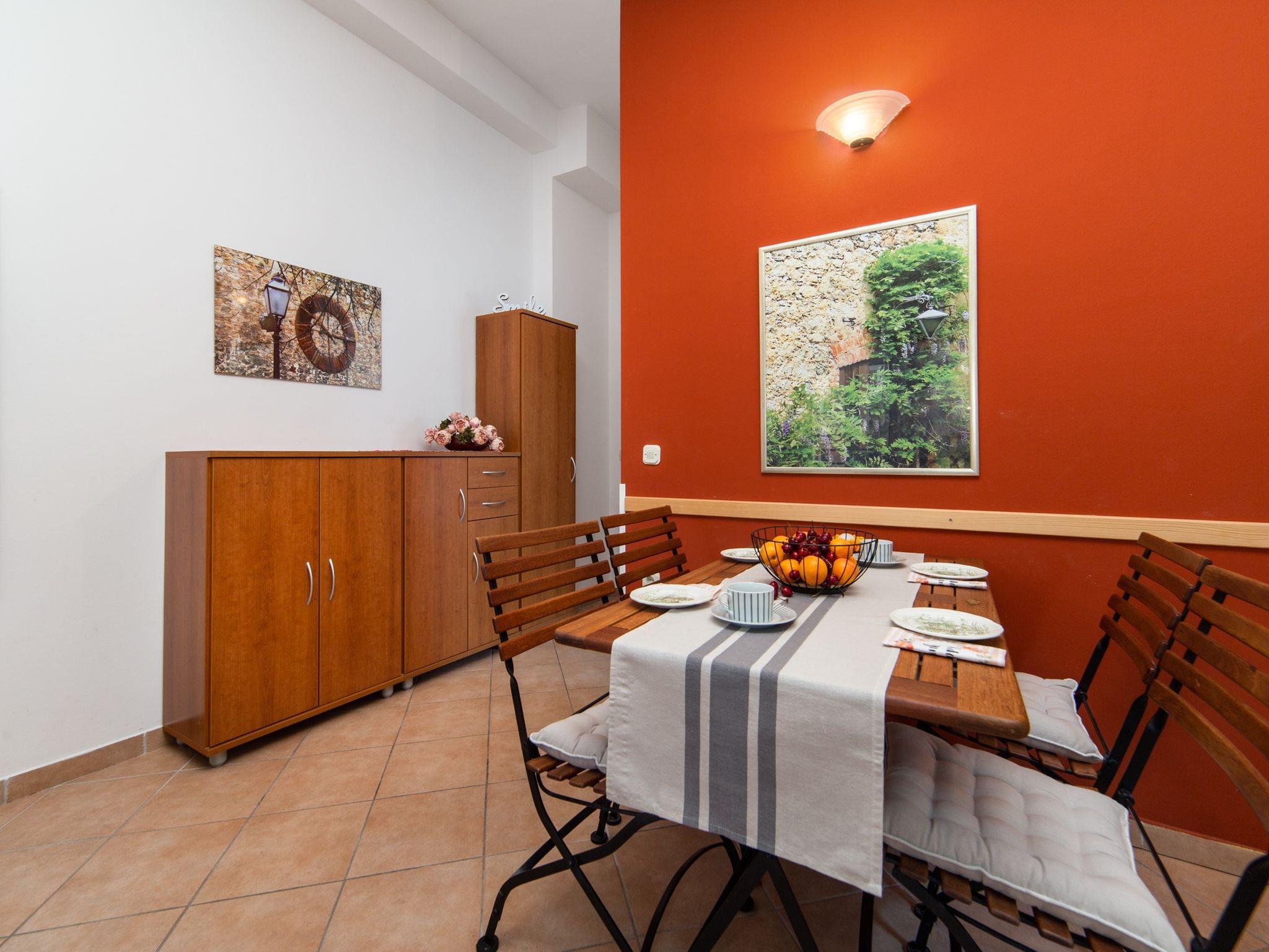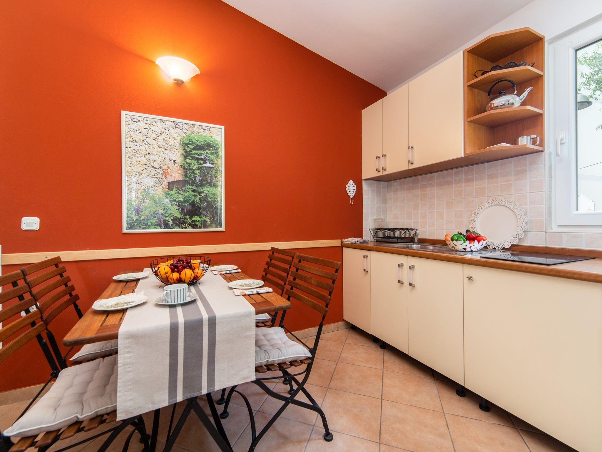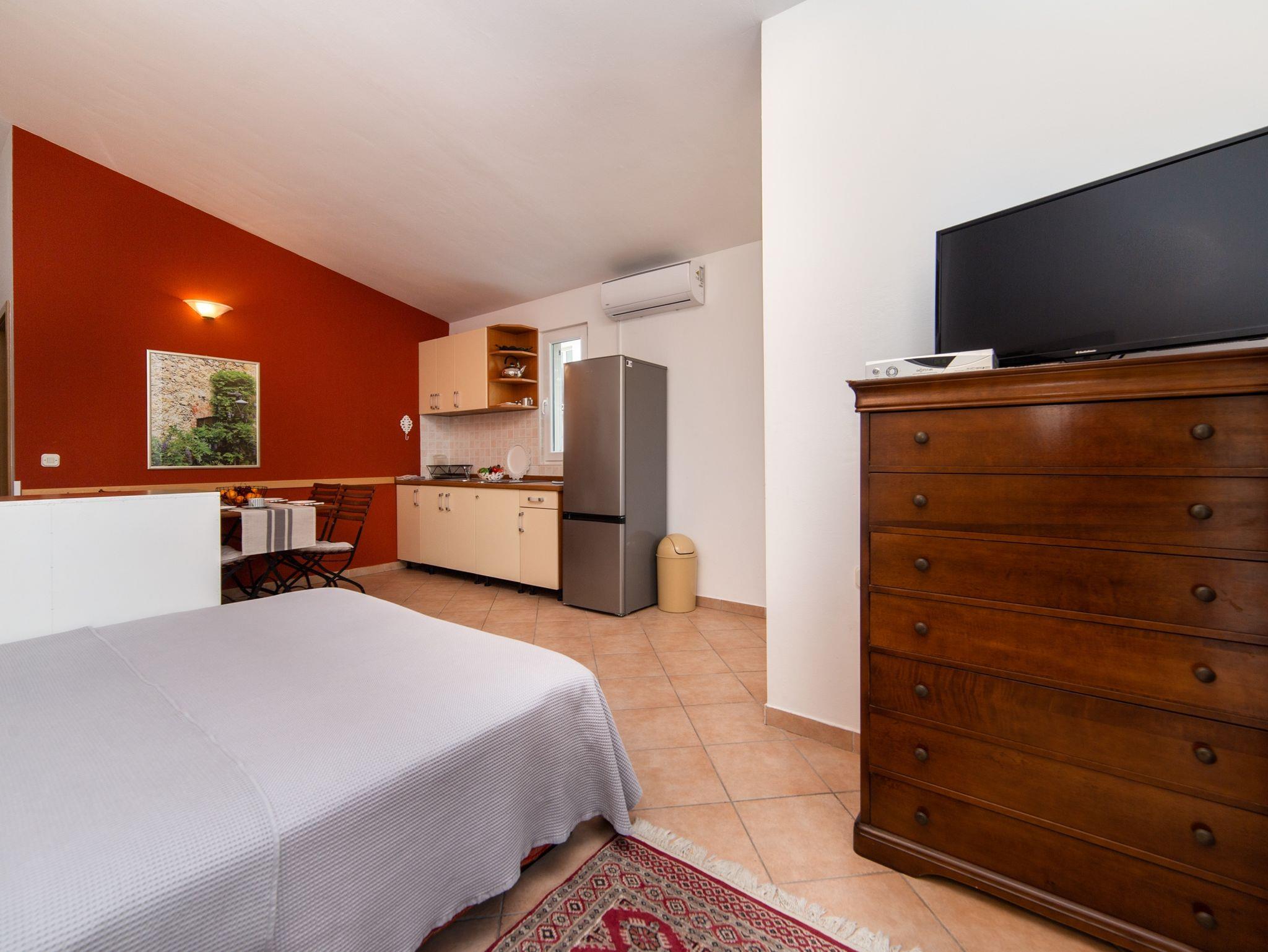 Ferienwohnung bietet Platz für 4 Gäste. Die Betten sind in Schlafzimmern, die es 1 gibt, und in Wohnzimmer, innerhalb einer Gesamtfläche von 40m2, angeordnet. Die Gäste haben eine eigene Terrasse zur Verfügung, auf der sie in warmen Sommernächten genießen können. IM PREIS INBEGRIFFEN: Kurtaxe, Endreinigung, Klimatisierung, Parkplatz, Internet, Kinderbett, Bügeleisen, Bügelbrett, Föhn. VERBINDLICHE ZUSÄTZLICHE KOSTEN: Aufzahlung für Kurzaufenthalte (prozentualer Zuschlag pro Nächtigungsanzahl: 30% - 1, 20% - 2, 10% - 3). Die Verfügbarkeit zusätzlicher Dienstleistungen in Ihrem reservierten Termin und die Preise derselben (falls nicht aufgeführt) müssen im Voraus überprüft werden. Zusätzliche Dienstleistungen die in der Zahlungsaufforderung nicht aufgeführt sind werden direkt beim Vermieter bezahlt, angenommen der Gast nutzt auch diese. Ermäßigung auf den Grundpreis: Gratistag 14=13 (bei einem Aufenthalt von 14 Tagen oder mehr erhalten Sie einen Gratistag für den Aufenthalt bis 31.12.26).
