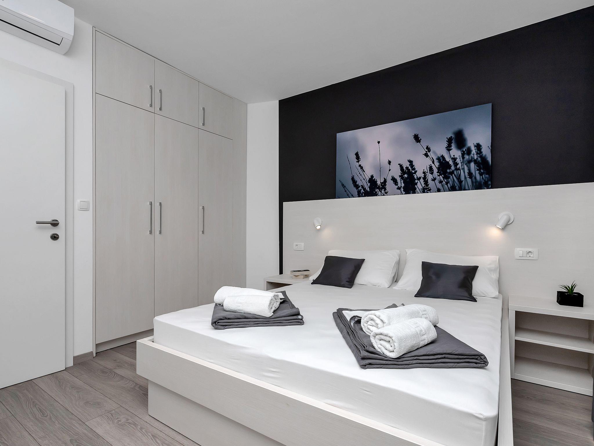 Ferienwohnung bietet Platz für 4 Gäste. Die Betten sind in Schlafzimmern, die es 1 gibt, und in Wohnzimmer, innerhalb einer Gesamtfläche von 44m2, angeordnet. Die Gäste haben eine eigene Terrasse zur Verfügung, auf der sie in warmen Sommernächten genießen können. Das Apartment bietet Meerblick. Es ist erlaubt, Speisen auf dem Gemeinschafts-Grill vorzubereiten. IM PREIS INBEGRIFFEN: Kurtaxe, Endreinigung, Klimatisierung, Parkplatz, Internet, Wäschewaschen, Kinderbett, Bügeleisen, Bügelbrett, Föhn, 1 Bett für Kinder (im Preis enthalten). Die Verfügbarkeit zusätzlicher Dienstleistungen in Ihrem reservierten Termin und die Preise derselben (falls nicht aufgeführt) müssen im Voraus überprüft werden. Zusätzliche Dienstleistungen die in der Zahlungsaufforderung nicht aufgeführt sind werden direkt beim Vermieter bezahlt, angenommen der Gast nutzt auch diese.