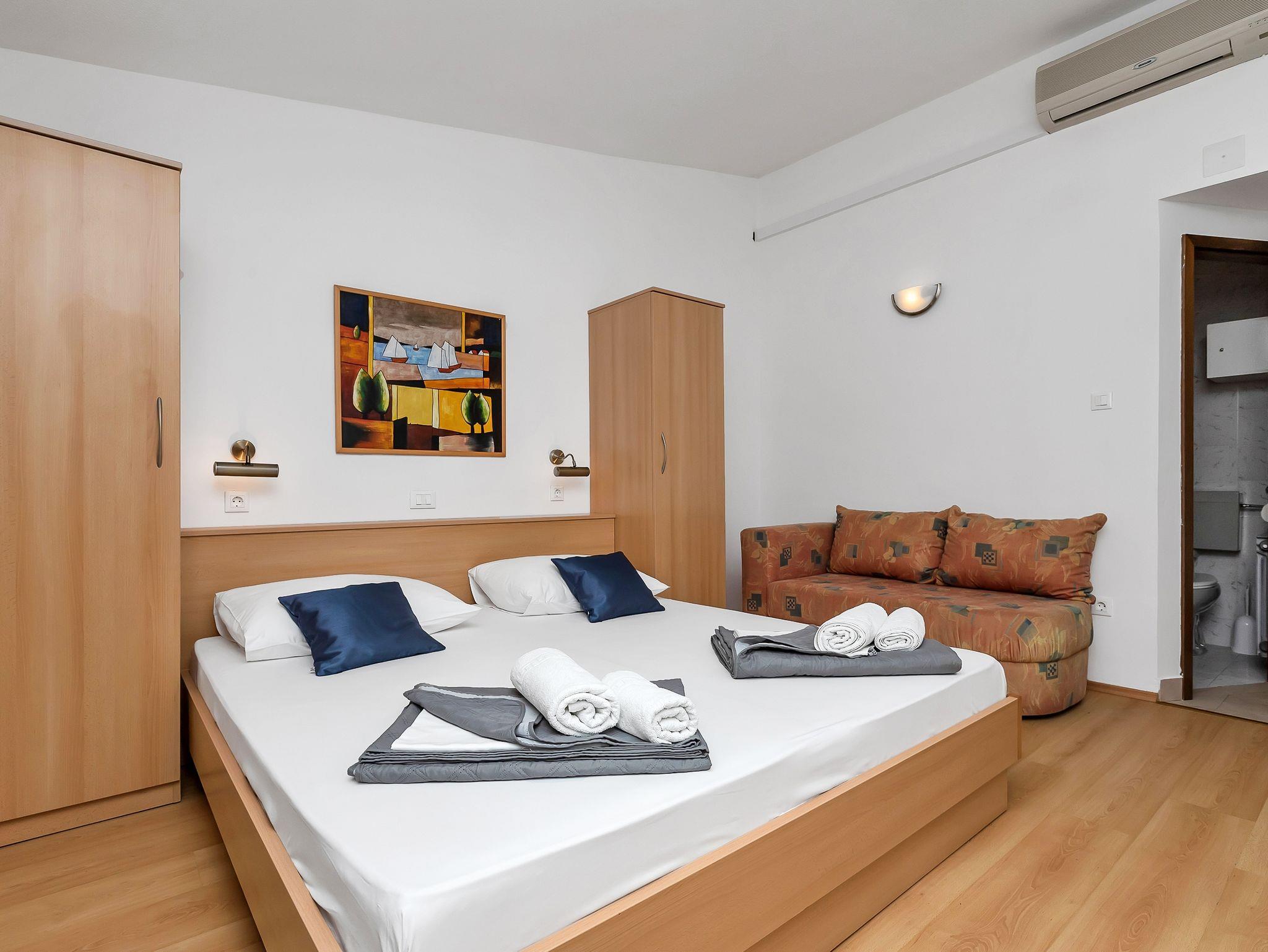 Studio bietet Platz für 2 Gäste. Die Betten sind in Schlafzimmern, die es 1 gibt, innerhalb einer Gesamtfläche von 22m2, angeordnet. Die Gäste haben eine eigene Terrasse zur Verfügung, auf der sie in warmen Sommernächten genießen können. Das Studio-Apartment bietet Meerblick. Es ist erlaubt, Speisen auf dem Gemeinschafts-Grill vorzubereiten. IM PREIS INBEGRIFFEN: Kurtaxe, Endreinigung, Klimatisierung, Parkplatz, Internet, Wäschewaschen, Kinderbett, Bügeleisen, Bügelbrett, Föhn. UNVERBINDLICHE ZUSÄTZLICHE KOSTEN: Zusatzbett (15,00 € pro Nacht). Die Verfügbarkeit zusätzlicher Dienstleistungen in Ihrem reservierten Termin und die Preise derselben (falls nicht aufgeführt) müssen im Voraus überprüft werden. Zusätzliche Dienstleistungen die in der Zahlungsaufforderung nicht aufgeführt sind werden direkt beim Vermieter bezahlt, angenommen der Gast nutzt auch diese.
