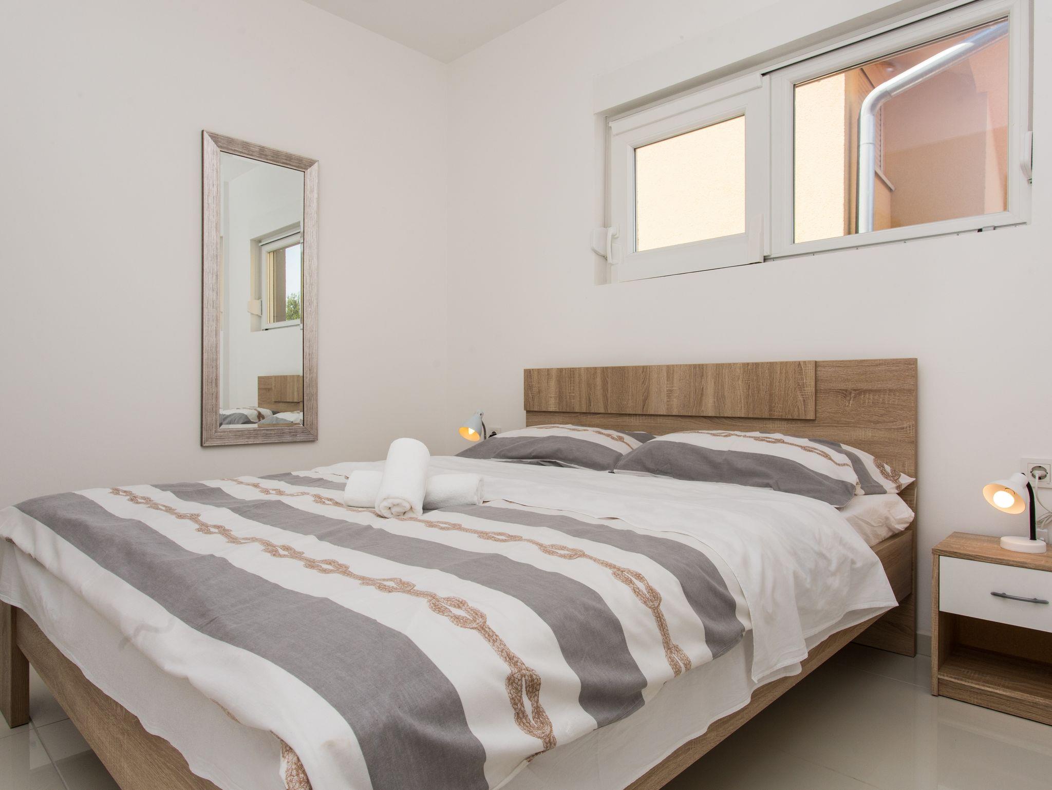 Ferienwohnung bietet Platz für 6 Gäste. Die Betten sind in Schlafzimmern, die es 2 gibt, und in Wohnzimmer, innerhalb einer Gesamtfläche von 55m2, angeordnet. Die Gäste haben eine eigene Terrasse zur Verfügung, auf der sie in warmen Sommernächten genießen können. Es ist erlaubt, Speisen auf dem Gemeinschafts-Grill vorzubereiten. IM PREIS INBEGRIFFEN: Kurtaxe, Endreinigung, Klimatisierung, Parkplatz, Internet. VERBINDLICHE ZUSÄTZLICHE KOSTEN: Aufzahlung für Kurzaufenthalte (prozentualer Zuschlag pro Nächtigungsanzahl: 30% - 1, 20% - 2, 10% - 3). Die Verfügbarkeit zusätzlicher Dienstleistungen in Ihrem reservierten Termin und die Preise derselben (falls nicht aufgeführt) müssen im Voraus überprüft werden. Zusätzliche Dienstleistungen die in der Zahlungsaufforderung nicht aufgeführt sind werden direkt beim Vermieter bezahlt, angenommen der Gast nutzt auch diese.