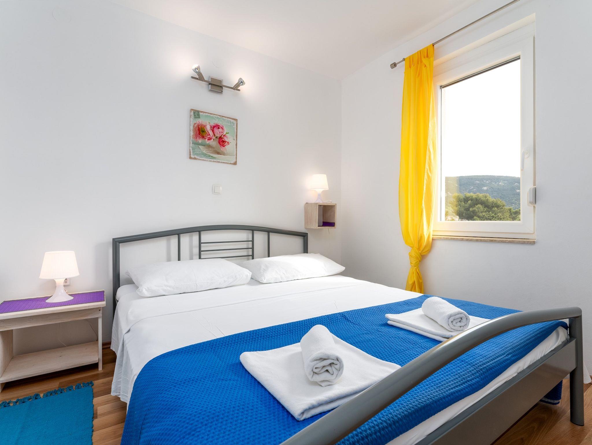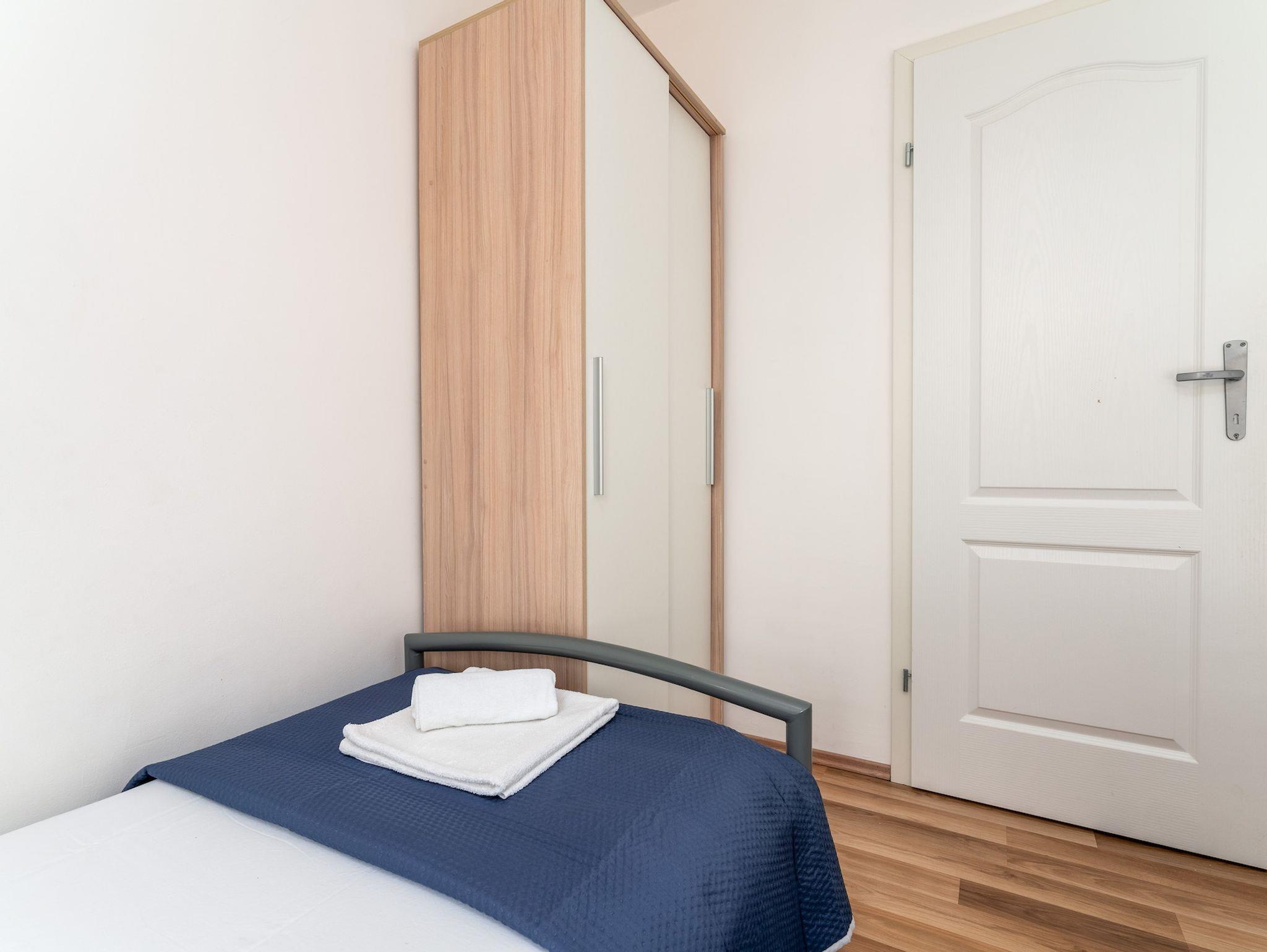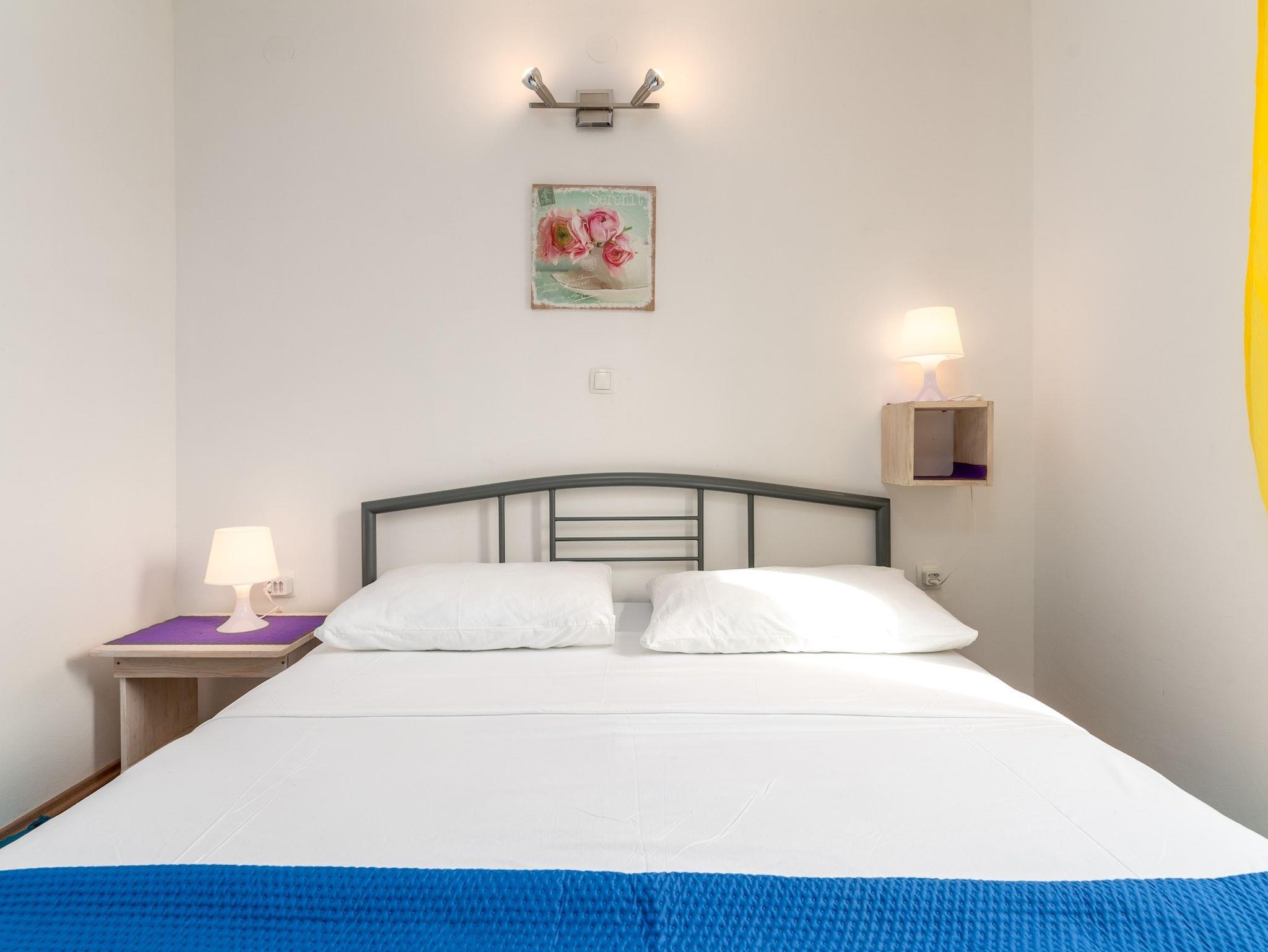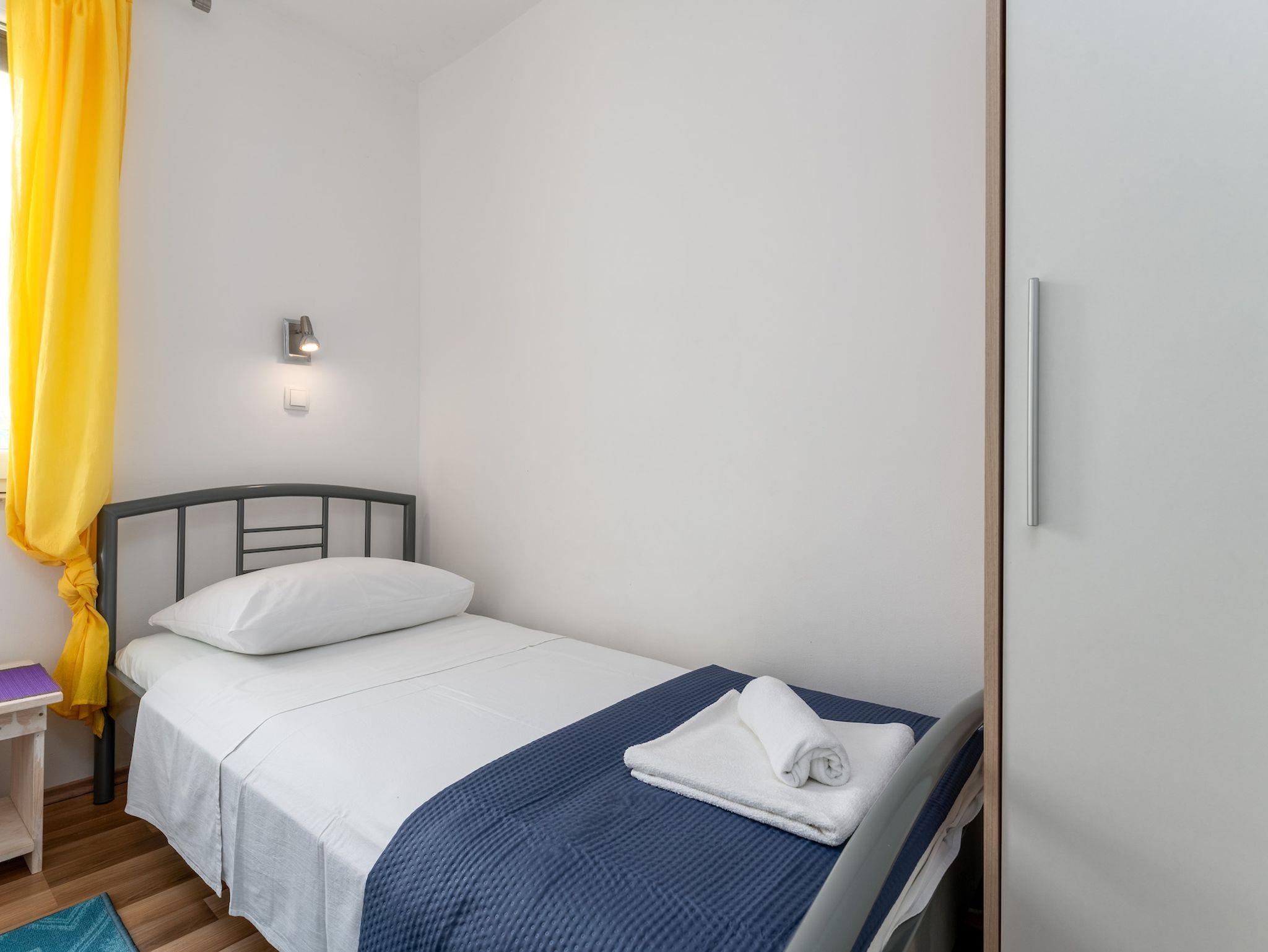 Ferienwohnung bietet Platz für 4 Gäste. Die Betten sind in Schlafzimmern, die es 2 gibt, innerhalb einer Gesamtfläche von 37m2, angeordnet. Die Gäste haben eine eigene Terrasse zur Verfügung, auf der sie in warmen Sommernächten genießen können. Es ist erlaubt, Speisen auf dem Gemeinschafts-Grill vorzubereiten. Durch die Terrasse der gebuchten Unterkunftseinheit gehen auch andere Gäste oder Vermieter. Unterkunftseinheit hat Räume, die von dem Rest der Einheit abgetrennt werden. IM PREIS INBEGRIFFEN: Kurtaxe, Endreinigung, Klimatisierung, Parkplatz, Internet, Kinderbett, Sonnenschirm. VERBINDLICHE ZUSÄTZLICHE KOSTEN: Aufzahlung für Kurzaufenthalte (prozentualer Zuschlag pro Nächtigungsanzahl: 30% - 1, 20% - 2, 10% - 3). Die Verfügbarkeit zusätzlicher Dienstleistungen in Ihrem reservierten Termin und die Preise derselben (falls nicht aufgeführt) müssen im Voraus überprüft werden. Zusätzliche Dienstleistungen die in der Zahlungsaufforderung nicht aufgeführt sind werden direkt beim Vermieter bezahlt, angenommen der Gast nutzt auch diese. Ermäßigung auf den Grundpreis: Gratistag 14=13 (bei einem Aufenthalt von 14 Tagen oder mehr erhalten Sie einen Gratistag für den Aufenthalt bis 31.12.26).