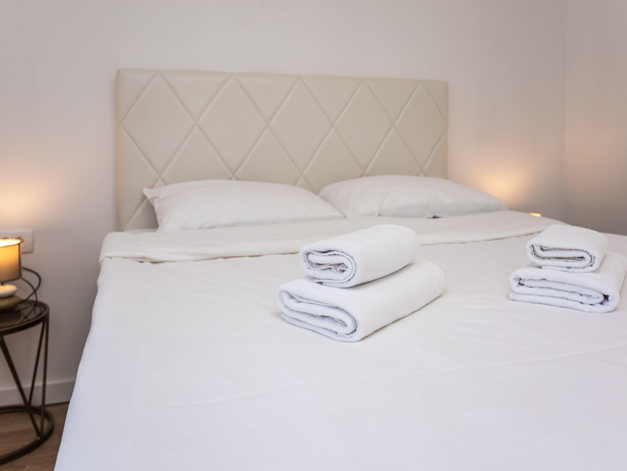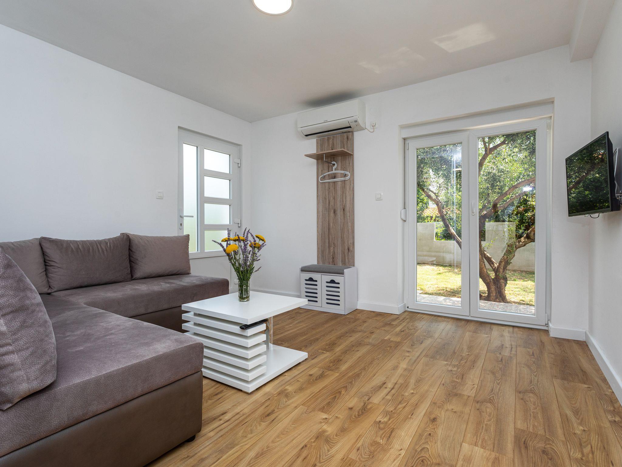 Ferienwohnung bietet Platz für 4 Gäste. Die Betten sind in Schlafzimmern, die es 1 gibt, und in Wohnzimmer, innerhalb einer Gesamtfläche von 39m2, angeordnet. Die Gäste haben eine eigene Terrasse zur Verfügung, auf der sie in warmen Sommernächten genießen können. IM PREIS INBEGRIFFEN: Kurtaxe, Endreinigung, Klimatisierung, Parkplatz, Internet. VERBINDLICHE ZUSÄTZLICHE KOSTEN: Aufzahlung für Kurzaufenthalte (prozentualer Zuschlag pro Nächtigungsanzahl: 30% - 1, 20% - 2, 10% - 3). Die Verfügbarkeit zusätzlicher Dienstleistungen in Ihrem reservierten Termin und die Preise derselben (falls nicht aufgeführt) müssen im Voraus überprüft werden. Zusätzliche Dienstleistungen die in der Zahlungsaufforderung nicht aufgeführt sind werden direkt beim Vermieter bezahlt, angenommen der Gast nutzt auch diese.