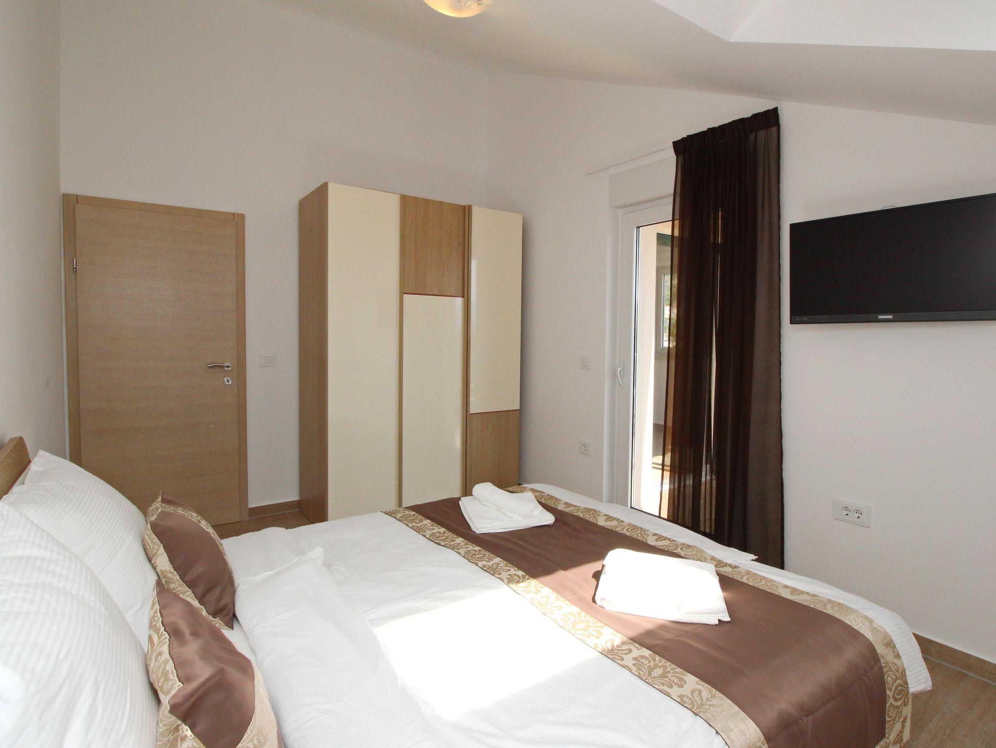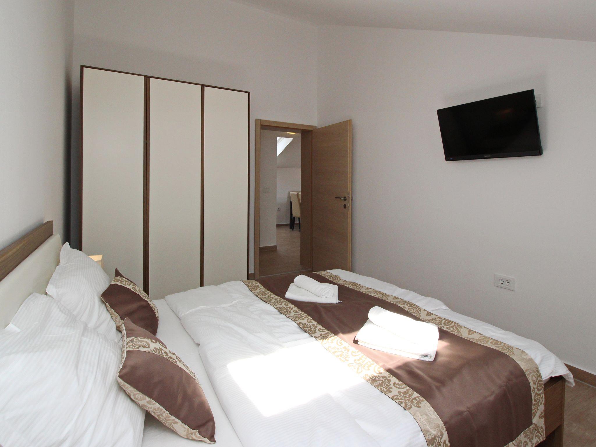 Ferienwohnung bietet Platz für 6 Gäste. Die Betten sind in Schlafzimmern, die es 2 gibt, und in Wohnzimmer, innerhalb einer Gesamtfläche von 63m2, angeordnet. Die Gäste haben eine eigene Terrasse zur Verfügung, auf der sie in warmen Sommernächten genießen können. In der Unterkunftseinheit besteht die Möglichkeit des Mitbringens von Haustieren gegen Aufpreis. IM PREIS INBEGRIFFEN: Kurtaxe, Endreinigung, Klimatisierung, Parkplatz, Internet. VERBINDLICHE ZUSÄTZLICHE KOSTEN: Aufzahlung für Kurzaufenthalte (prozentualer Zuschlag pro Nächtigungsanzahl: 30% - 1, 20% - 2, 10% - 3). UNVERBINDLICHE ZUSÄTZLICHE KOSTEN: Haustiere (10,00 € pro Nacht). Die Verfügbarkeit zusätzlicher Dienstleistungen in Ihrem reservierten Termin und die Preise derselben (falls nicht aufgeführt) müssen im Voraus überprüft werden. Zusätzliche Dienstleistungen die in der Zahlungsaufforderung nicht aufgeführt sind werden direkt beim Vermieter bezahlt, angenommen der Gast nutzt auch diese.