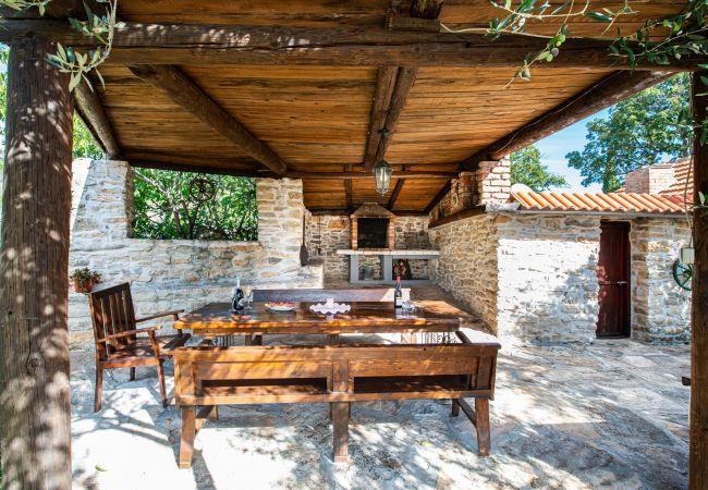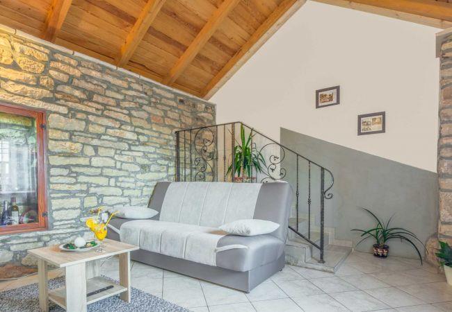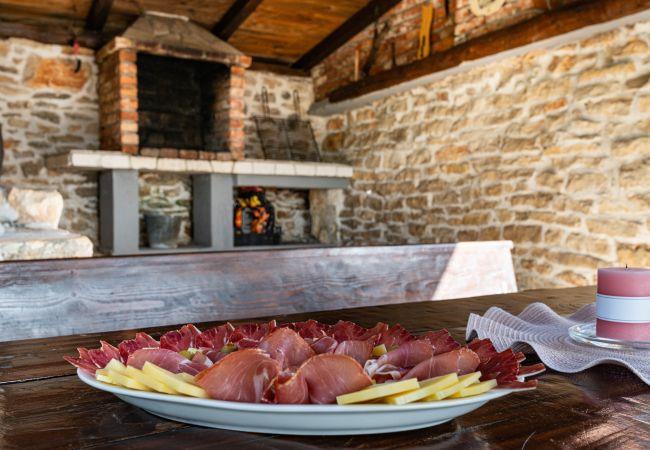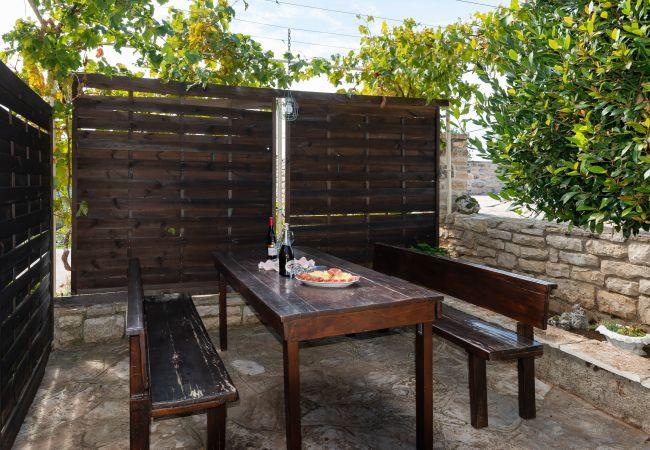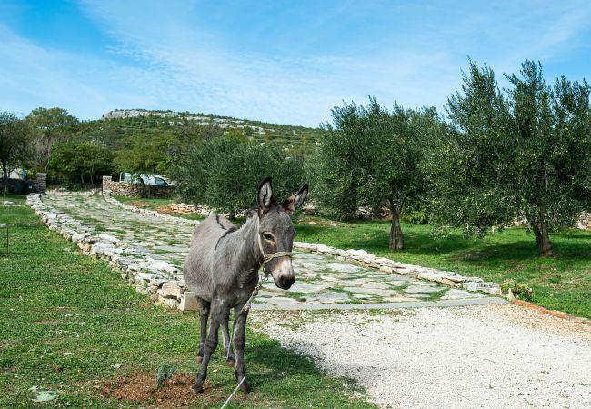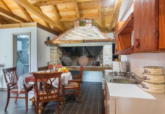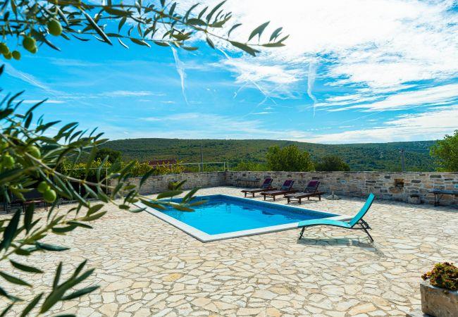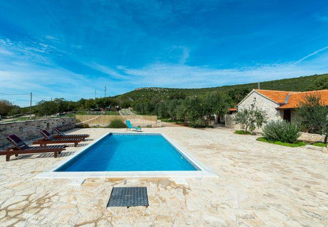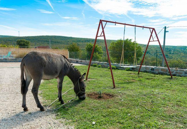 Guests have at their disposal just renovated Dalmatian style two stone houses with a large yard and a nice swimming pool. Both houses are together 90m2 and consist of 2 bedrooms, living room, dining room, kitchen and 2 bathrooms. In the first house there is a living-dining area with kitchen in one, shower toilet and double bedroom. In the kitchen there is a big BBQ oven station, typical dalmatian. In the other stone house, there is a living room, with sleeping sofa, shower toilet and double bedroom. An ideal property for a perfect vacation in the beautiful nature of the Dalmatian hinterland. You will be delighted with the hospitality of the host with home-grown fruit, eggs and vegetables that guests will gladly offer. Great property of 1100 m2, with playground, 32m2 seasonal pool, sun loungers, big grill facility with outdoor furniture, enclosed by typical dalmatian dry wall, olive trees and a bio garden...all at the guest’s disposal.