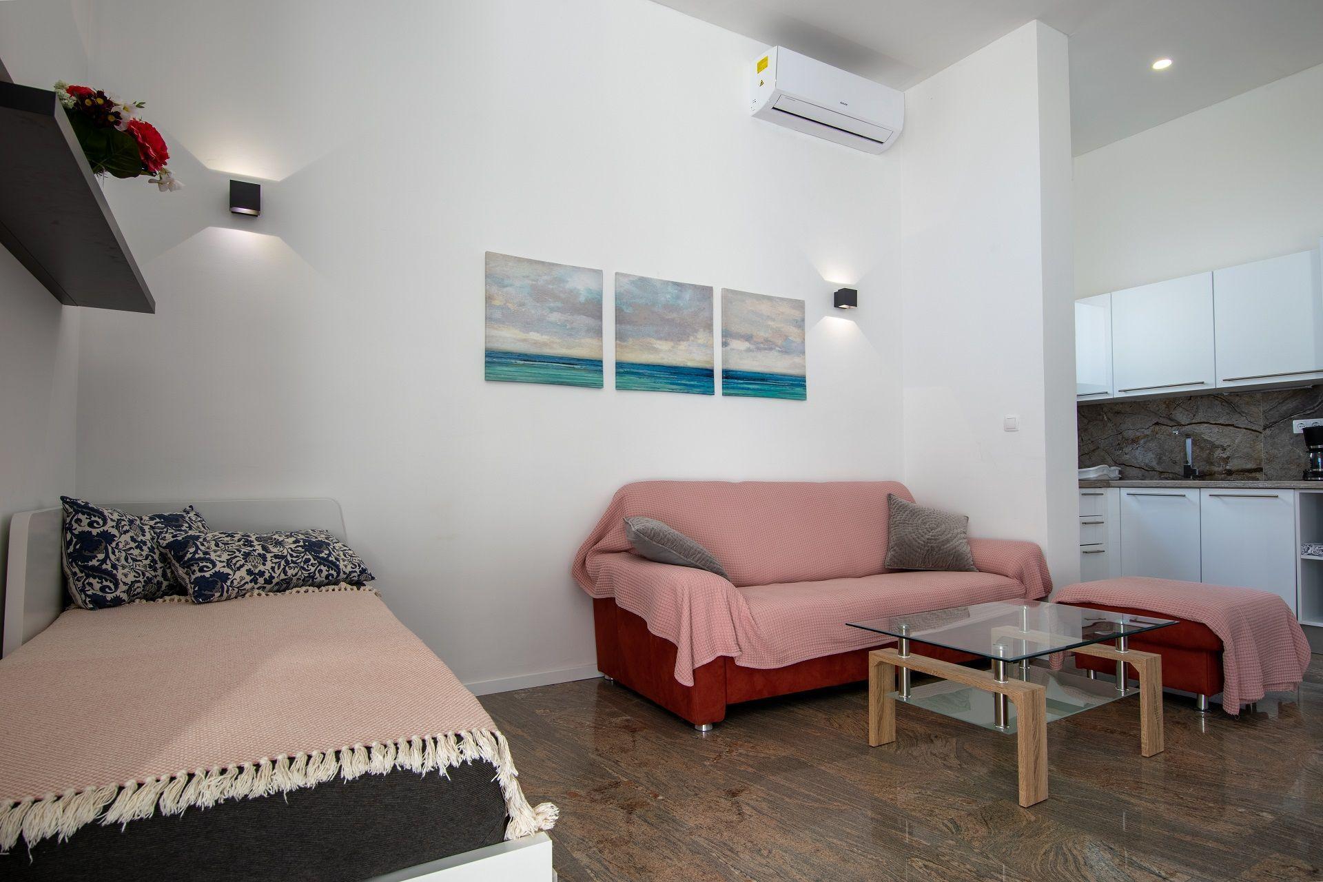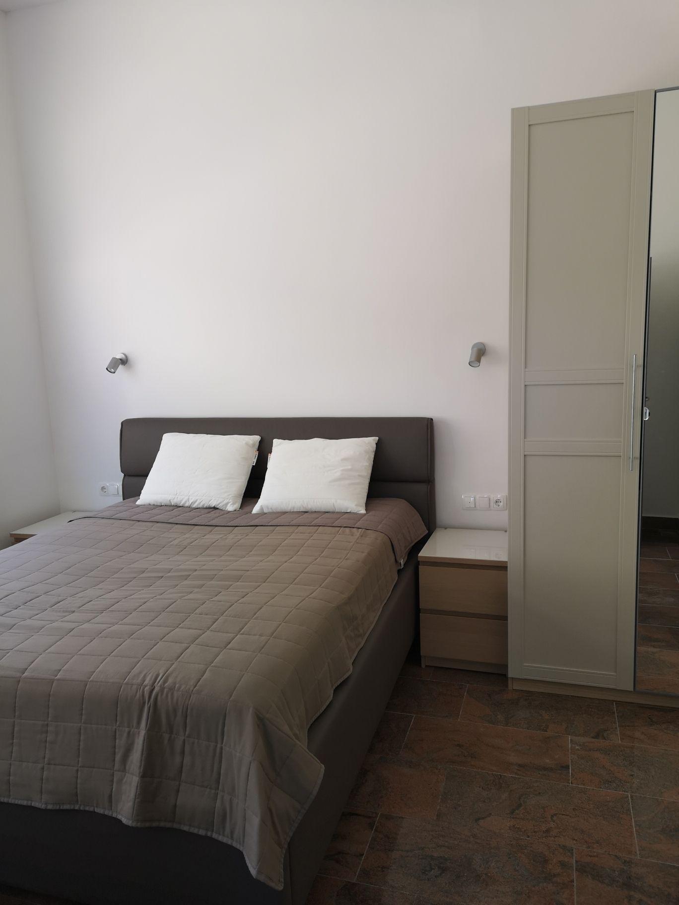 The holiday flat is on the ground floor of the three-storey house. It offers a large living and dining area with an additional double bed, a fully equipped kitchen, a large bedroom with a king-size bed, a bathroom with shower/WC, a TV and air conditioning. Towels for the flat are included. There is also free WiFi internet access.