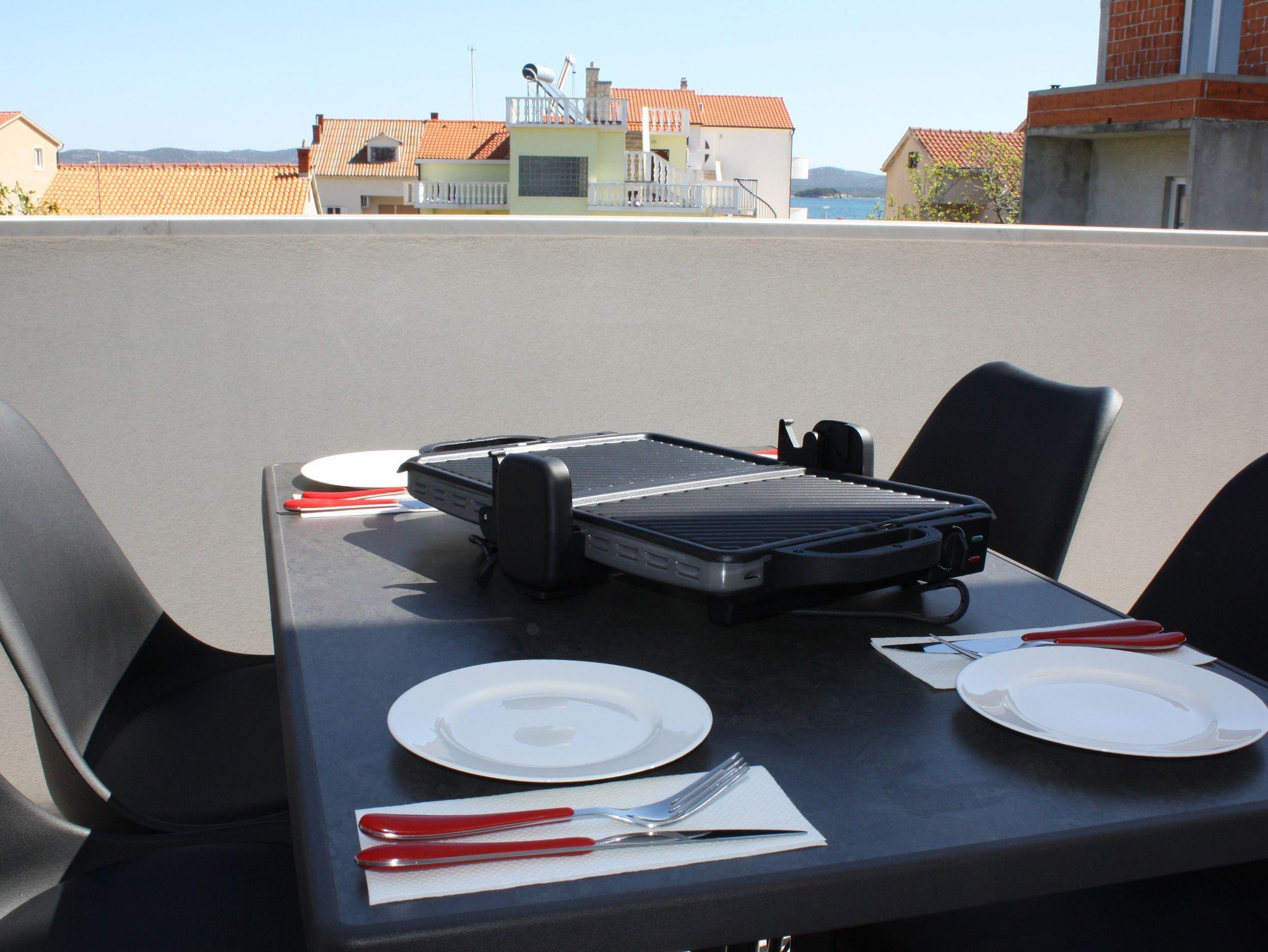 Ferienwohnung bietet Platz für 4 Gäste. Die Betten sind in Schlafzimmern, die es 1 gibt, und in Wohnzimmer, innerhalb einer Gesamtfläche von 43m2, angeordnet. Die Gäste haben eine eigene Terrasse zur Verfügung, auf der sie in warmen Sommernächten genießen können. Das Apartment bietet Meerblick. Es ist erlaubt, Speisen auf dem Gemeinschafts-Grill vorzubereiten. IM PREIS INBEGRIFFEN: Kurtaxe, Endreinigung, Klimatisierung, Parkplatz, Internet, Wäschewaschen, Kinderbett, Bügeleisen, Bügelbrett, Föhn, tragbarer Grill. VERBINDLICHE ZUSÄTZLICHE KOSTEN: Aufzahlung für Kurzaufenthalte (prozentualer Zuschlag pro Nächtigungsanzahl: 30% - 1, 20% - 2, 10% - 3). Die Verfügbarkeit zusätzlicher Dienstleistungen in Ihrem reservierten Termin und die Preise derselben (falls nicht aufgeführt) müssen im Voraus überprüft werden. Zusätzliche Dienstleistungen die in der Zahlungsaufforderung nicht aufgeführt sind werden direkt beim Vermieter bezahlt, angenommen der Gast nutzt auch diese. Ermäßigung auf den Grundpreis: Gratistag 21=19 (bei einem Aufenthalt von 21 Tagen oder mehr erhalten Sie 2 Gratistage für den Aufenthalt bis 31.12.26).