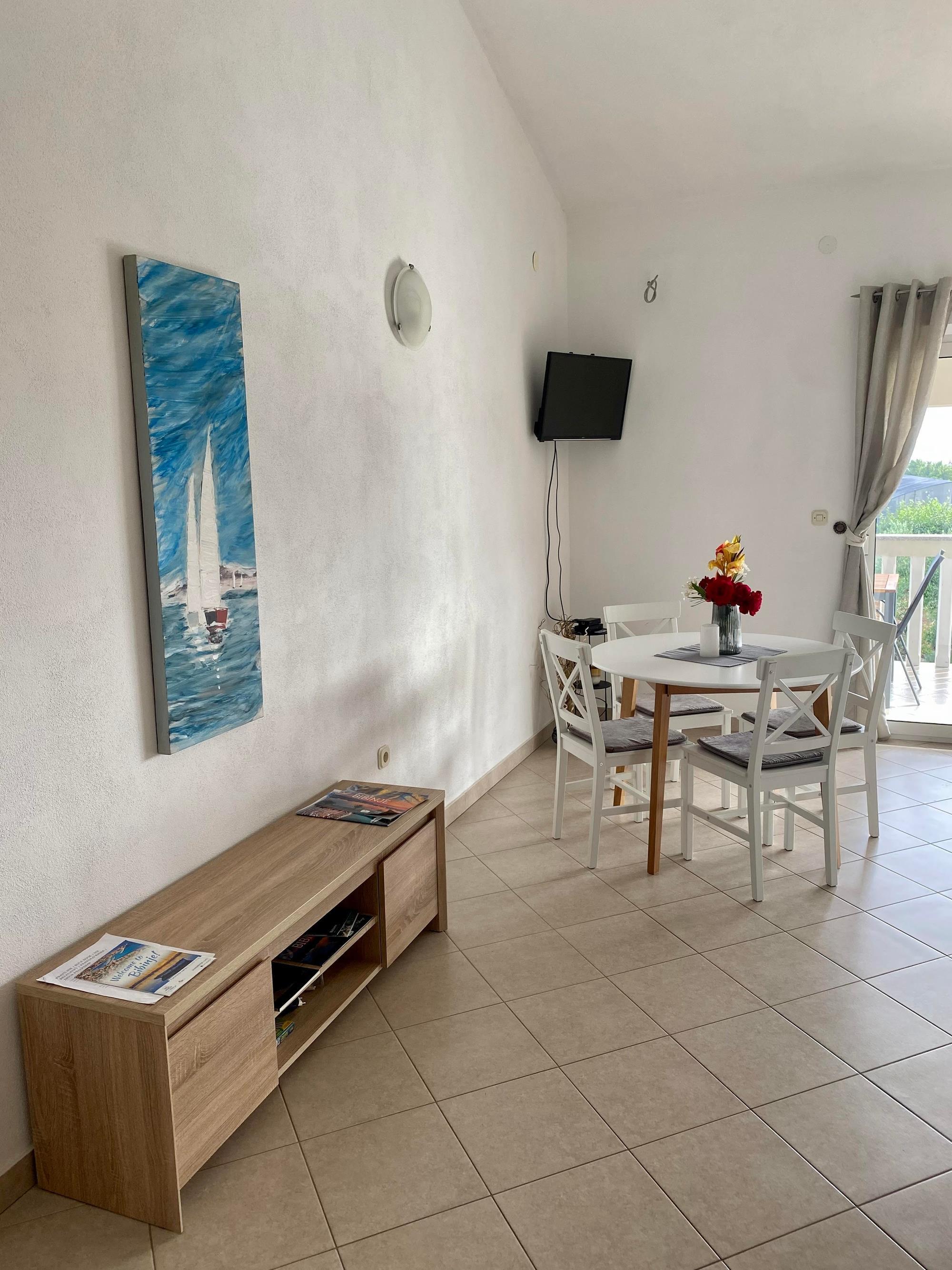 Apartment can accommodate 4 guests. Beds are situated in 1 sleeping rooms, but also in the living room, within 52m2. Guests can use a private terrace to enjoy the warm summer evenings. The apartment offers the sea view. Food can be prepared using barbecue which is shared with other guests too.