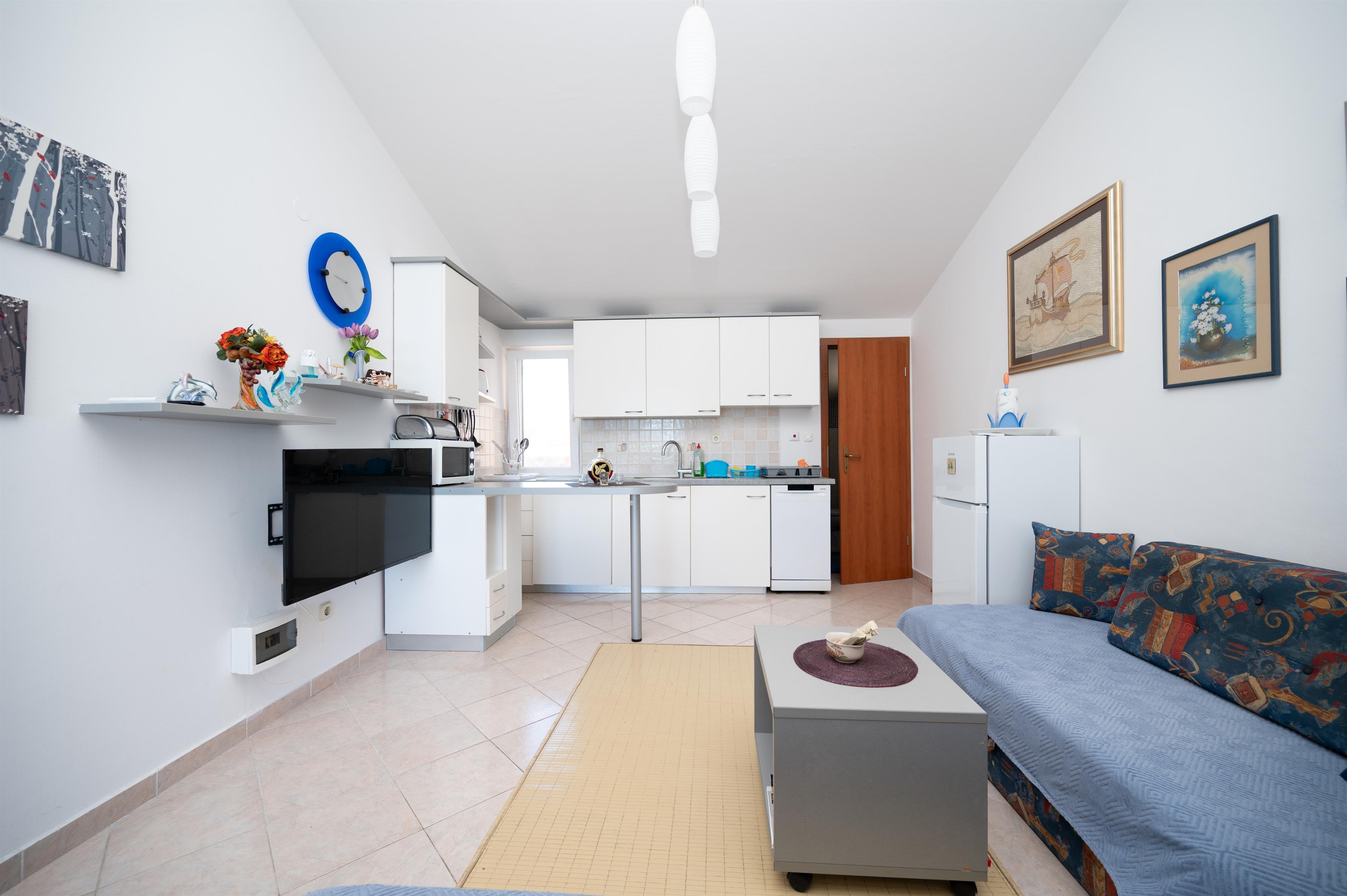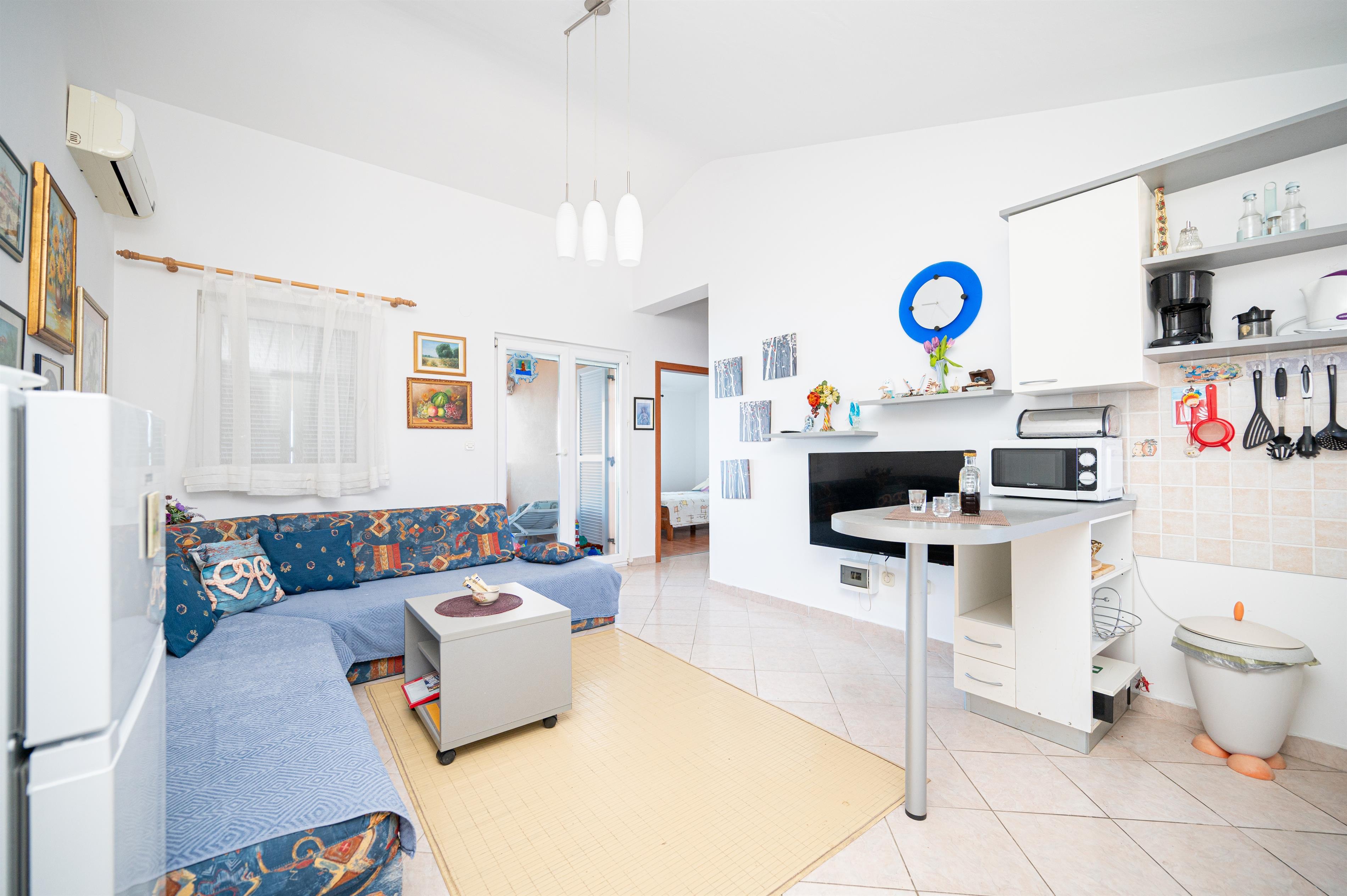 Apartment can accommodate 5 guests. Beds are situated in 2 sleeping rooms, but also in the living room, within 43m2. Guests can use a private terrace to enjoy the warm summer evenings. The apartment offers the sea view. Food can be prepared using barbecue which is shared with other guests too.