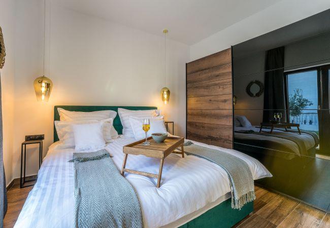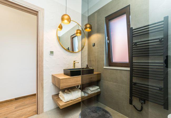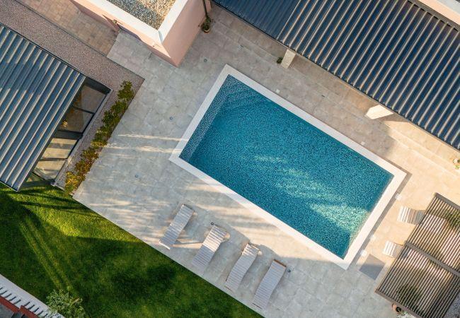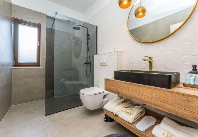 Villa Skyfall will win you over at first sight with its simple modern design and rich luxurious interior. The villa has 3 bedrooms, each with its own private bathroom and an open-plan living room with a kitchen and dining room and can accommodate 6 people. A large glass wall separates you from the beautiful outdoor area with the heated pool and the sunlounges that surround it. There is also a playground for your little ones and a covered terrace with a dining table and a place to relax and drink your morning coffee by the pool.