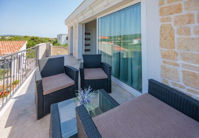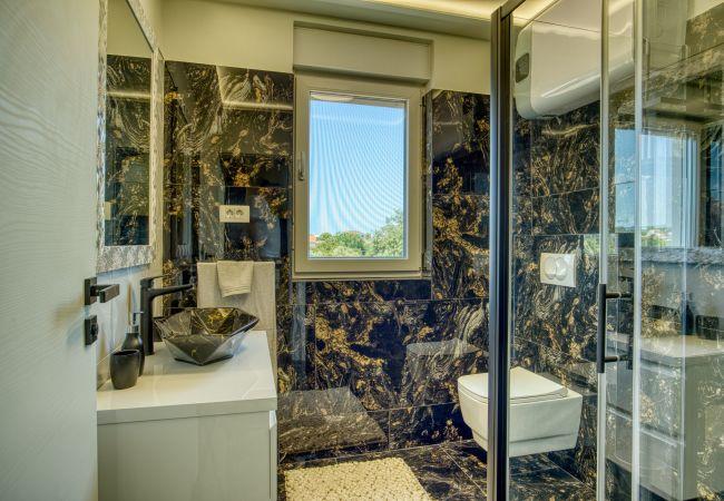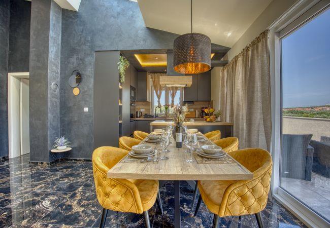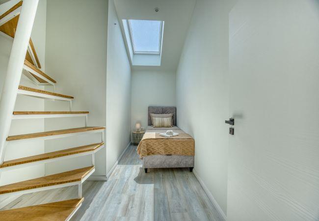 The apartment on the first floor is accessed through outdoor staircase. You first arrive on a beautiful balcony with a relaxing seating area, and the view is very open and absolutely perfect for a morning coffee or an evening glass of your favourite refreshing drink. The indoor will take your breath away, making it seem like the space has no end to it. The decor of the apartment is simply astounding and filled with eye captivating luxury details and embelishments. There are three more bedrooms available, two of which have beds available in amazing galleries, as well as three more bathrooms. Having in total of three double beds and two single beds in galleries, this apartment comfortably accommodate 8 guests.
