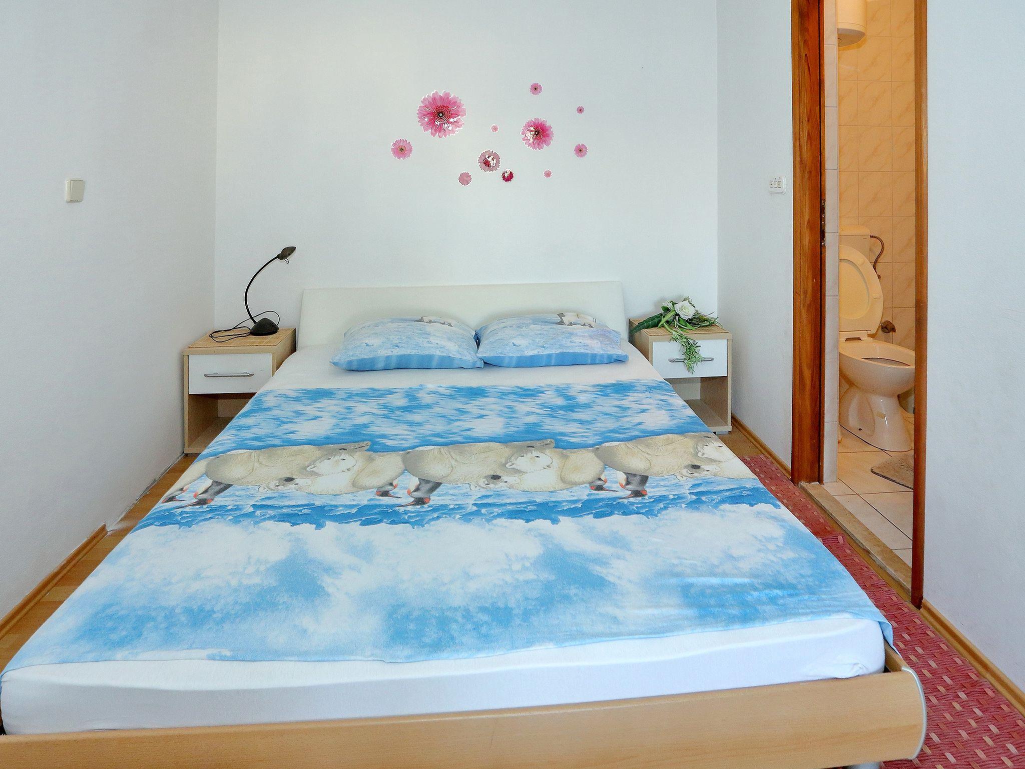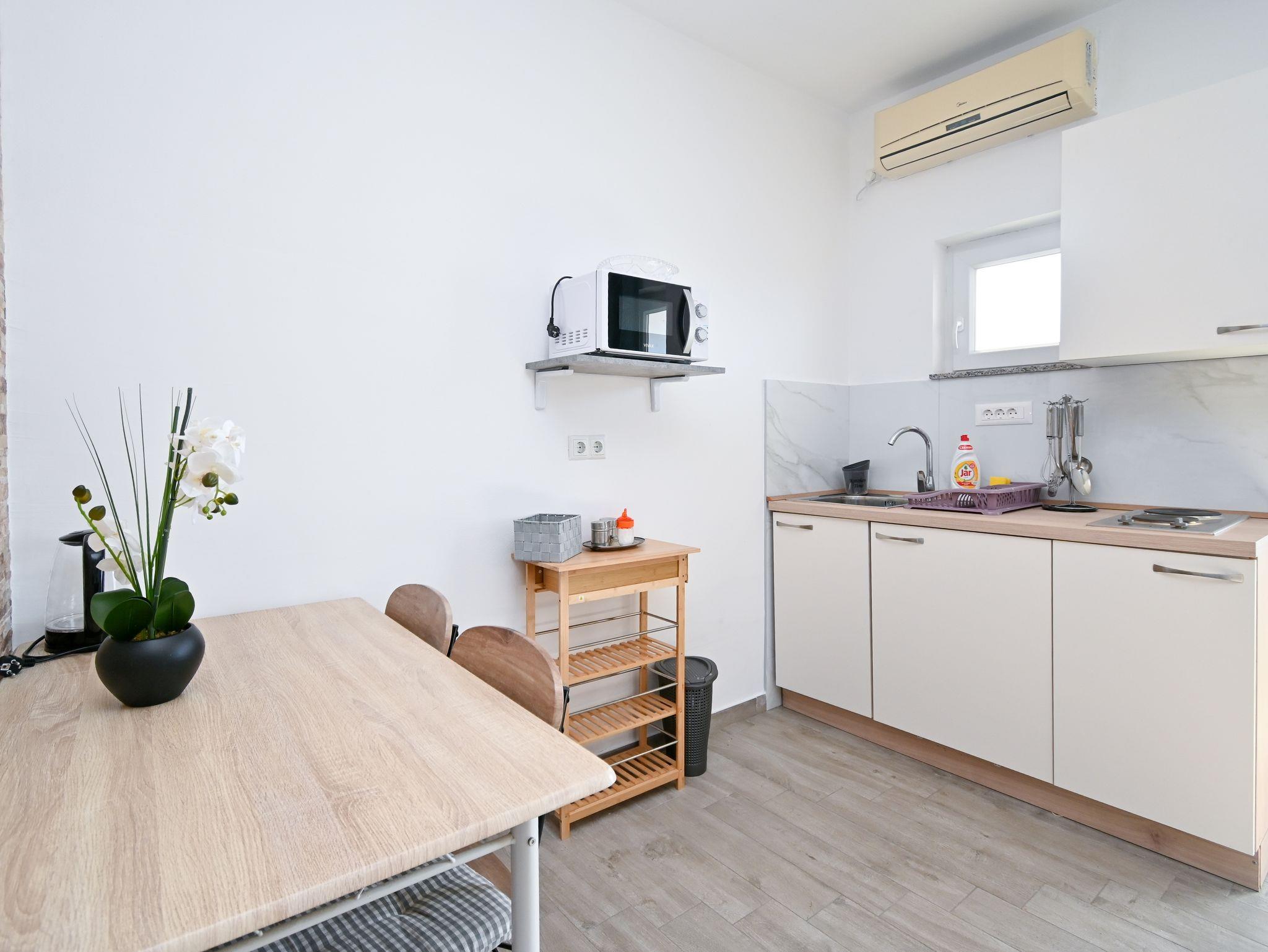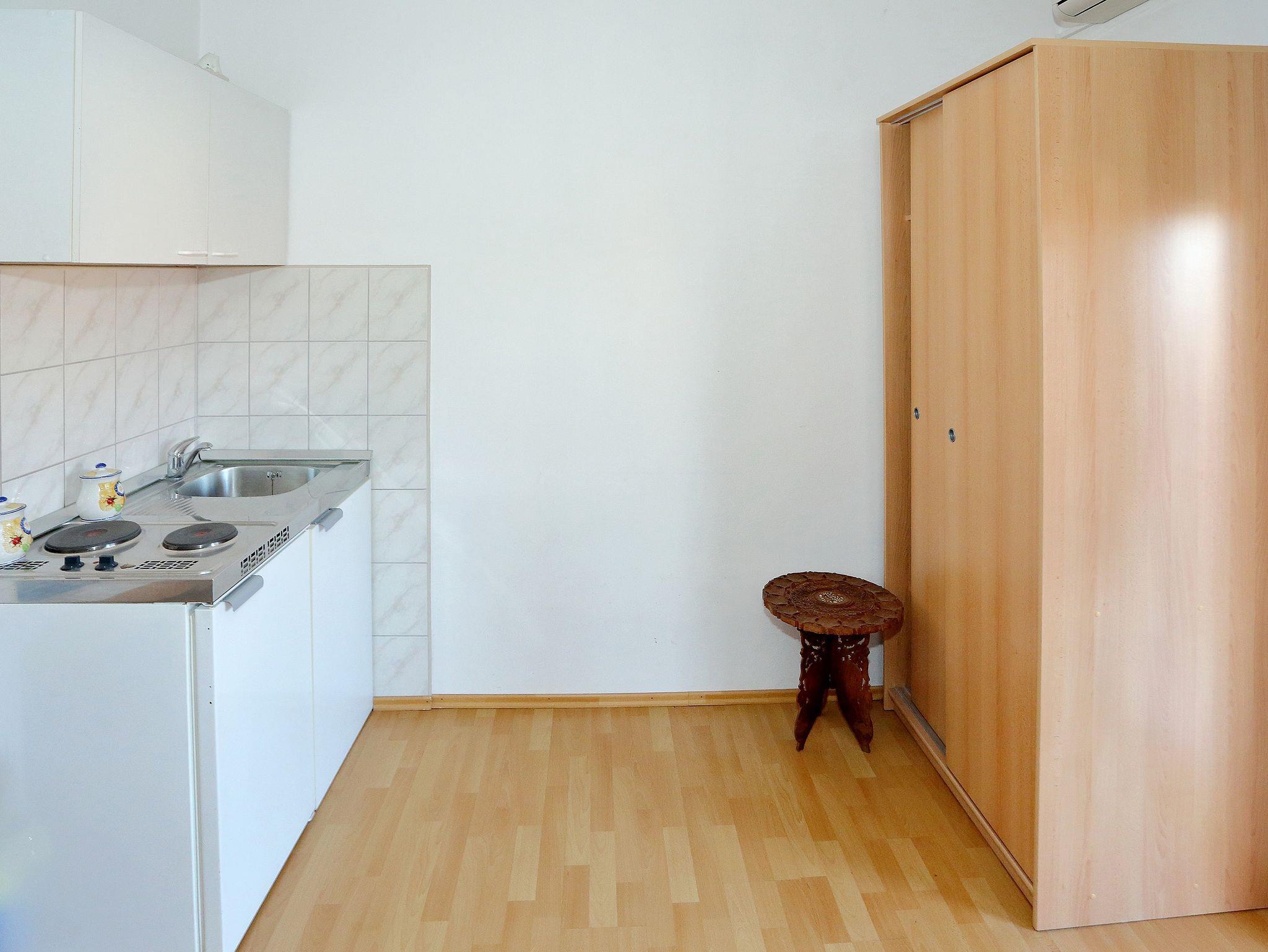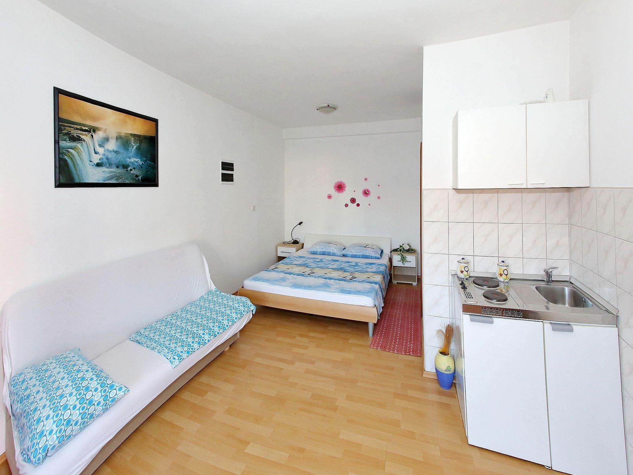 Studio bietet Platz für 3 Gäste. Die Betten sind in Schlafzimmern, die es 1 gibt, und in Wohnzimmer, innerhalb einer Gesamtfläche von 16m2, angeordnet. Die Gäste haben eine eigene Terrasse zur Verfügung, auf der sie in warmen Sommernächten genießen können. Das Studio-Apartment bietet Meerblick. Es ist erlaubt, Speisen auf dem Gemeinschafts-Grill vorzubereiten. Durch die Terrasse der gebuchten Unterkunftseinheit gehen auch andere Gäste oder Vermieter. IM PREIS INBEGRIFFEN: Kurtaxe, Endreinigung, Klimatisierung, Parkplatz, Internet, Kinderbett, Bügeleisen, Föhn. Die Verfügbarkeit zusätzlicher Dienstleistungen in Ihrem reservierten Termin und die Preise derselben (falls nicht aufgeführt) müssen im Voraus überprüft werden. Zusätzliche Dienstleistungen die in der Zahlungsaufforderung nicht aufgeführt sind werden direkt beim Vermieter bezahlt, angenommen der Gast nutzt auch diese. Ermäßigung auf den Grundpreis: Gratistag 14=13 (bei einem Aufenthalt von 14 Tagen oder mehr erhalten Sie einen Gratistag für den Aufenthalt bis 31.12.26).